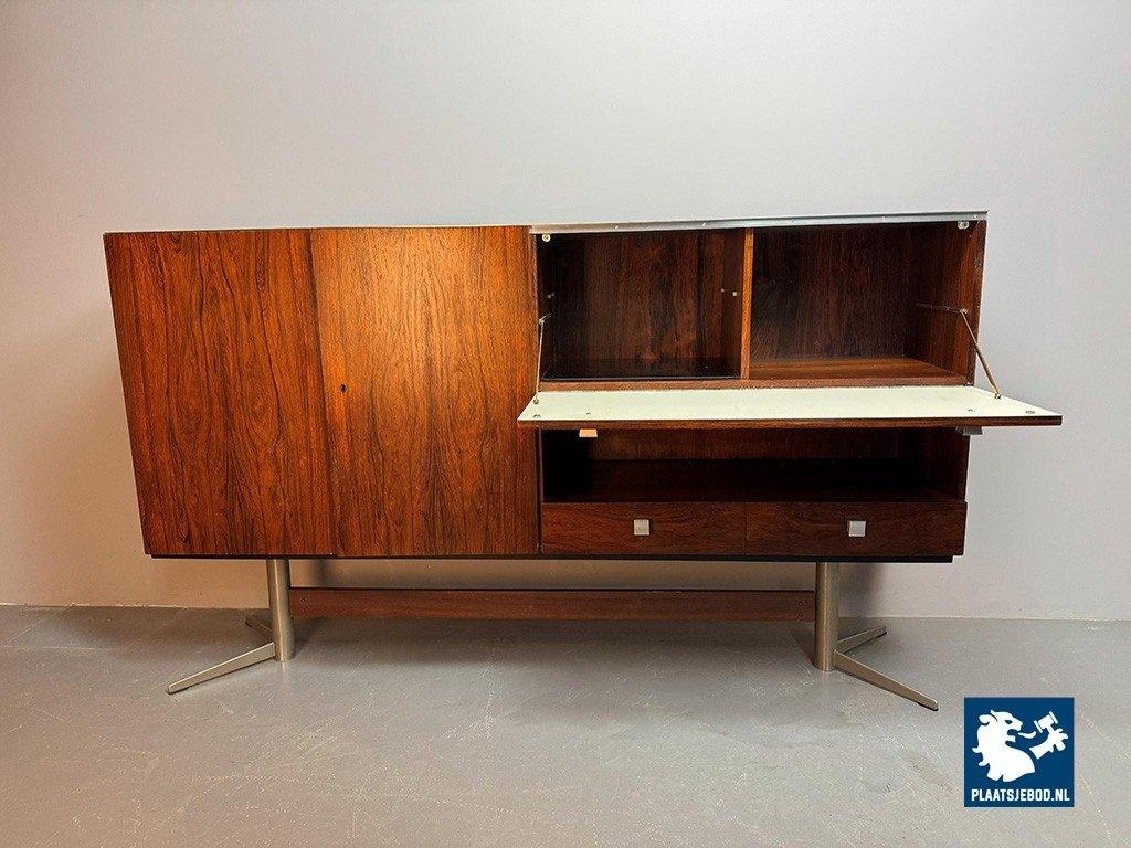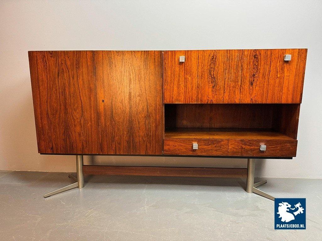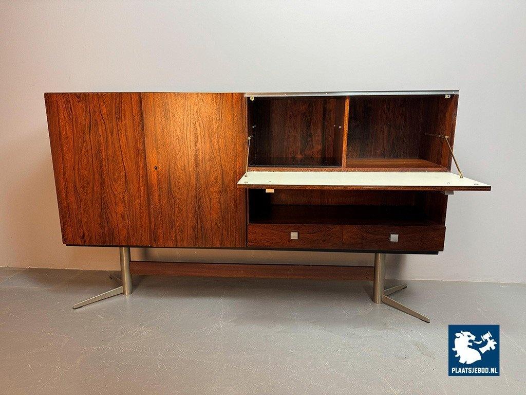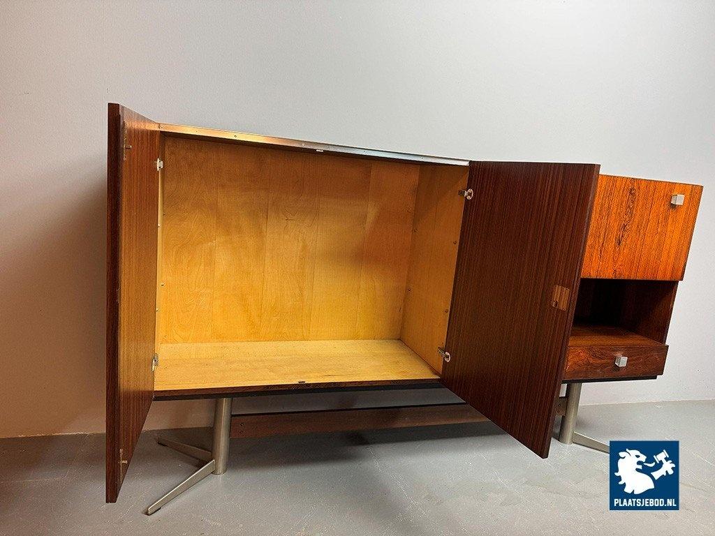 Elegant sideboard designed by Louis van Teeffelen for Wébé in the early 1960s. Crafted in rosewood veneer and supported by a distinctive chrome pedestal base. The layout includes two storage compartments, two drawers, an integrated bar compartment and an open display section. A refined example of Dutch mid-century modern design with strong architectural presence. Dimensions: Height 118 cm, Width 200 cm, Depth 45 cm