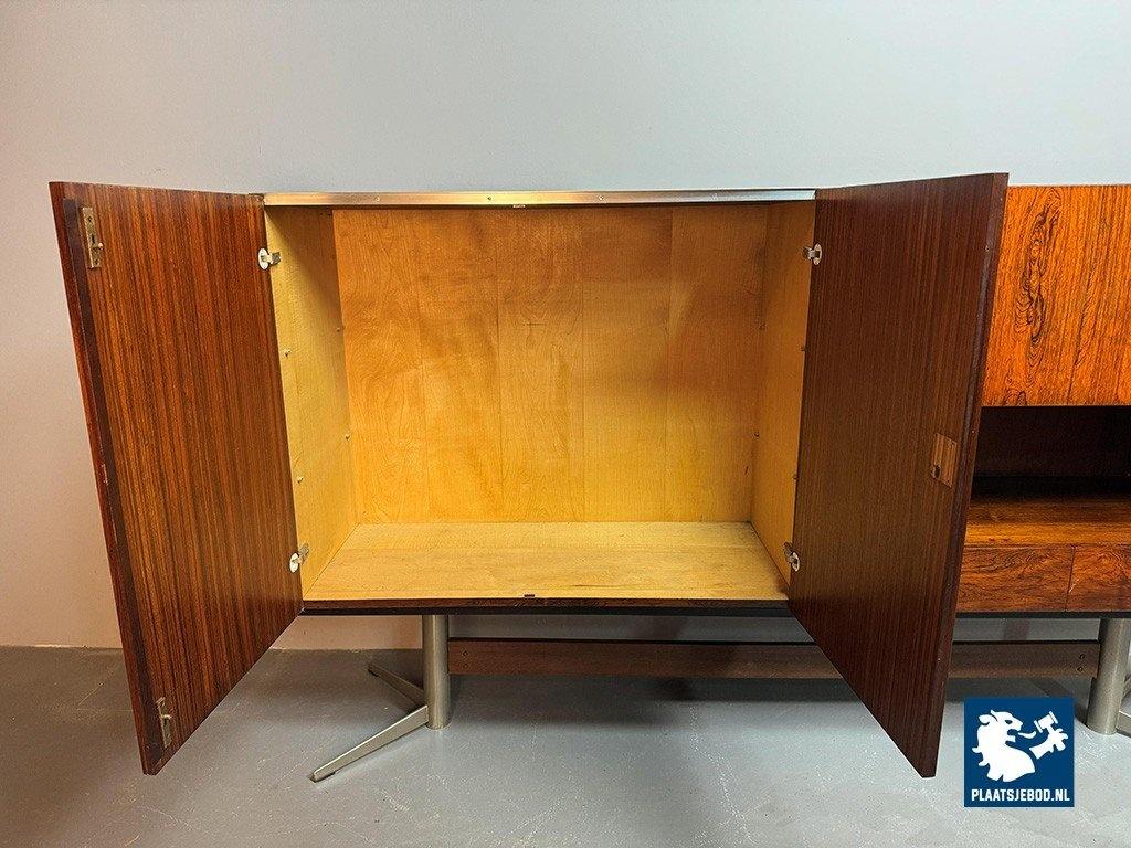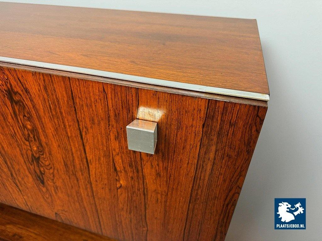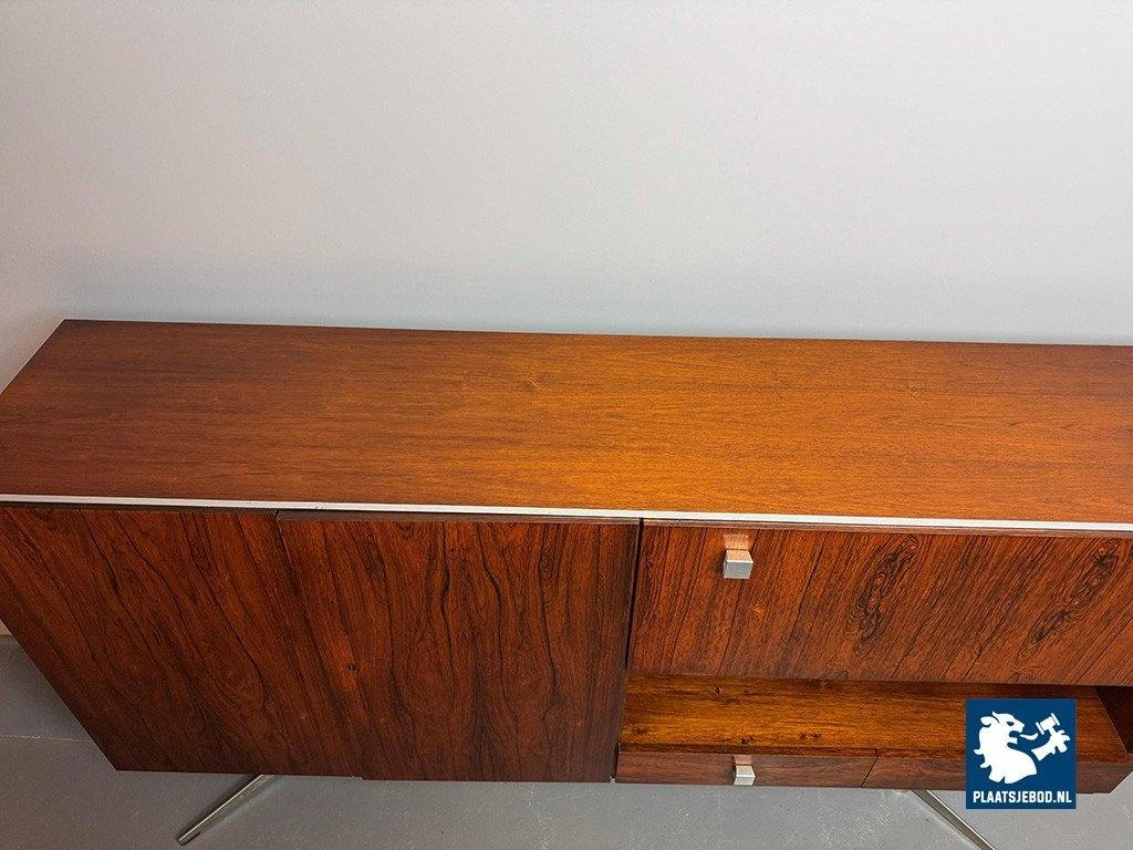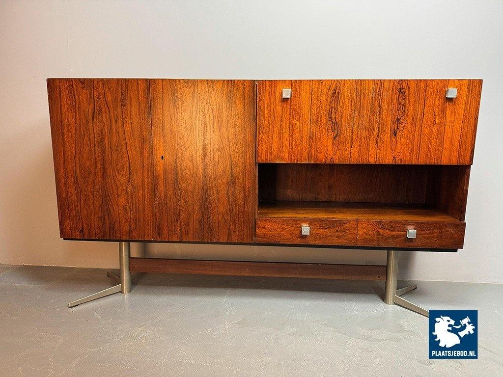 Elegant sideboard designed by Louis van Teeffelen for Wébé in the early 1960s. Crafted in rosewood veneer and supported by a distinctive chrome pedestal base. The layout includes two storage compartments, two drawers, an integrated bar compartment and an open display section. A refined example of Dutch mid-century modern design with strong architectural presence. Dimensions: Height 118 cm, Width 200 cm, Depth 45 cm