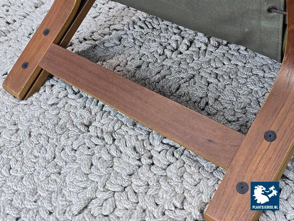 Beautiful Ry-Wing high-back lounge chair designed by Elsa and Nordahl Solheim and produced by Rybo Rykken. This Scandinavian classic features an organically shaped bentwood frame finished in warm teak veneer. The canvas shell is upholstered in high-quality olive green capitonated leather. The slightly springy construction offers exceptional seating comfort. The chair is in good vintage condition with minor wear consistent with age and use, making it a timeless and highly desirable design piece. Dimensions: Height 90 Width 66 Depth 98 cm.