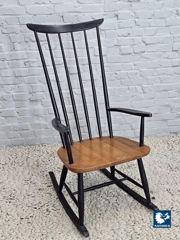 Iconic Scandinavian rocking chair designed by Ilmari Tapiovaara. Crafted from black lacquered beechwood with a contrasting molded seat in natural lacquered wood. The traditional spindle backrest and curved rockers are executed using age-old woodworking techniques, while the seat introduces a modern, organic form. A celebrated design by one of Finland’s most awarded designers, combining tradition and modernism. Dimensions: Height 112 Width 56 Depth 75 cm.