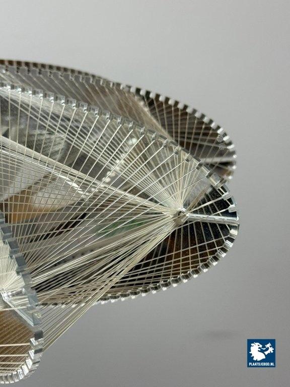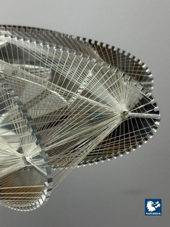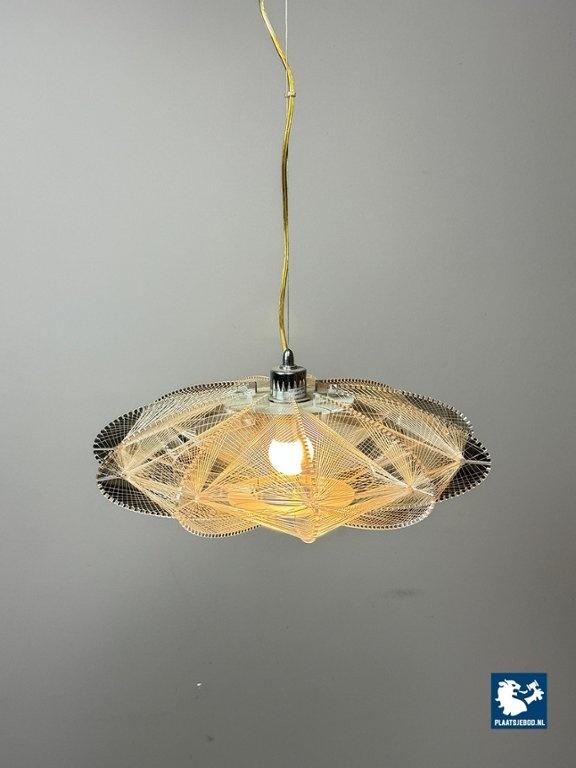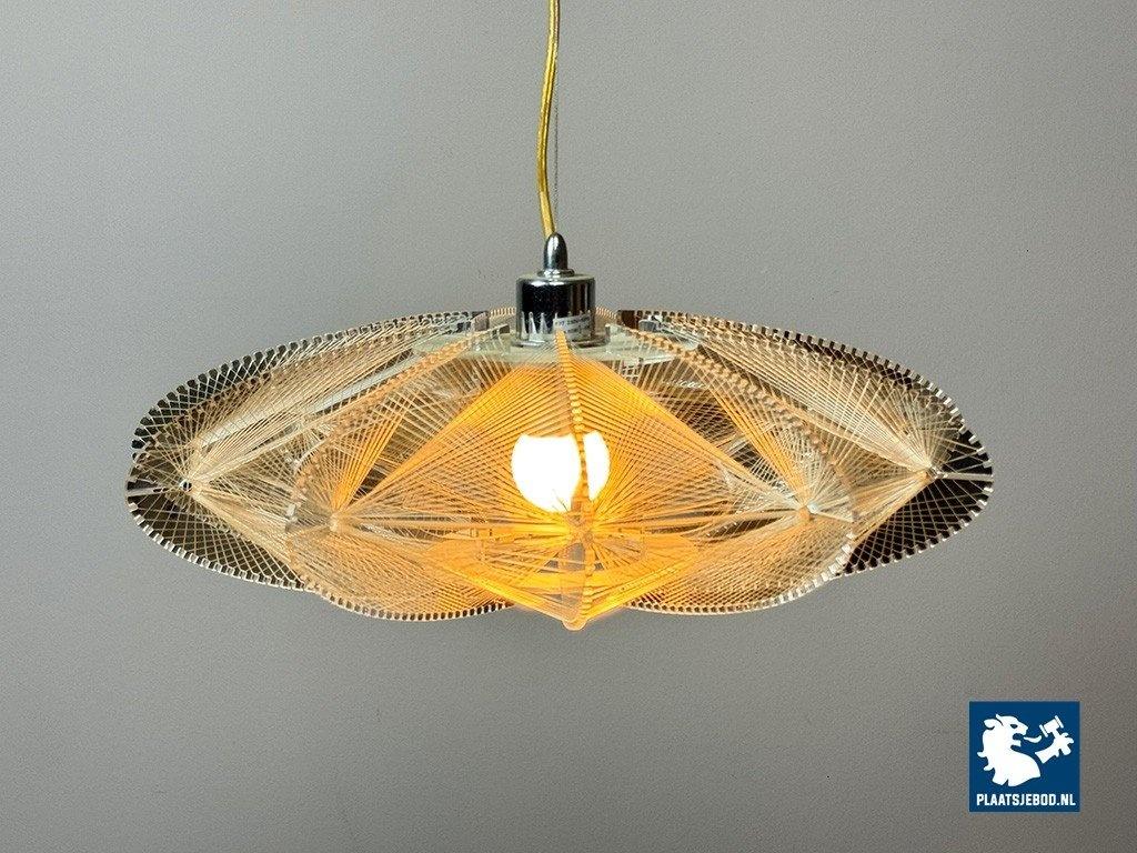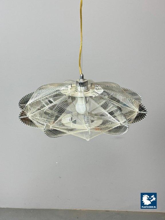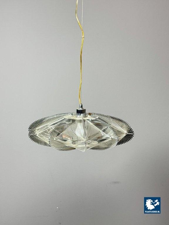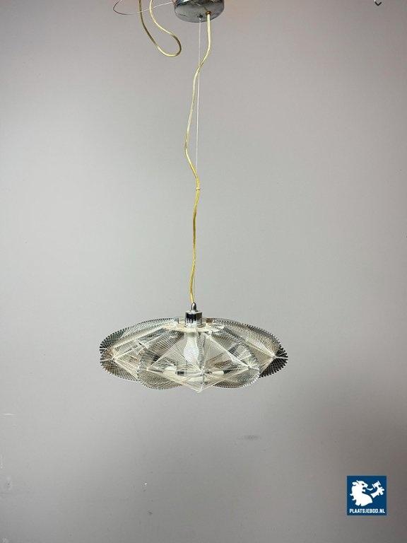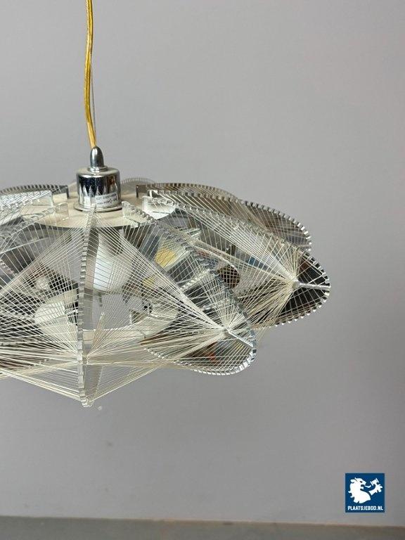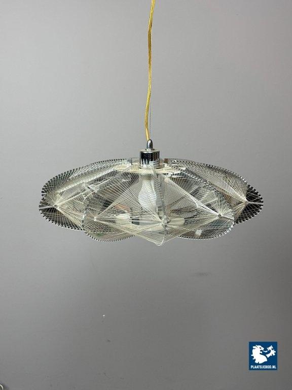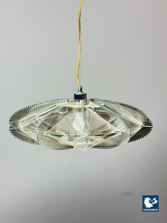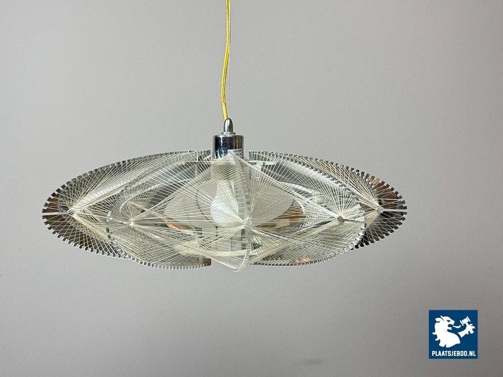 Striking Space Age pendant lamp by Sompex, attributed to designer Paul Secon. The abstract shade is composed of nylon threads combined with perspex elements, creating a sculptural and light-diffusing effect. A bold and expressive lighting object from the 1970s. Dimensions: Height 15 Width 50 cm