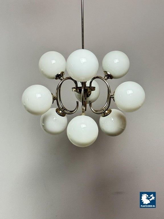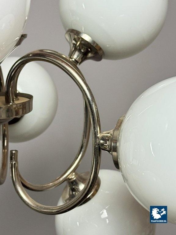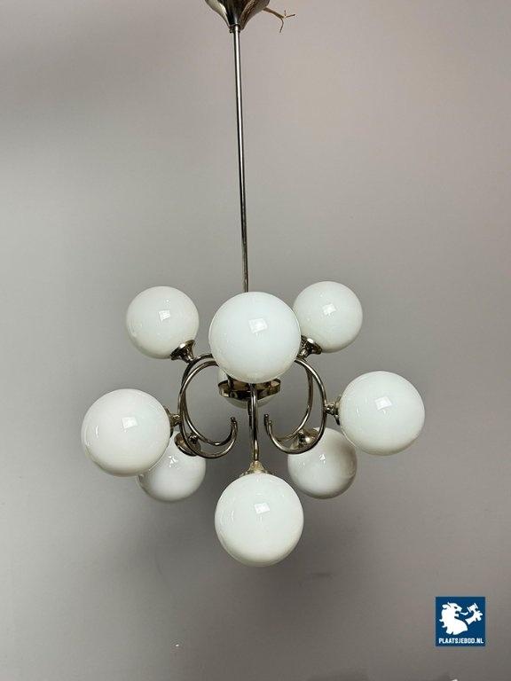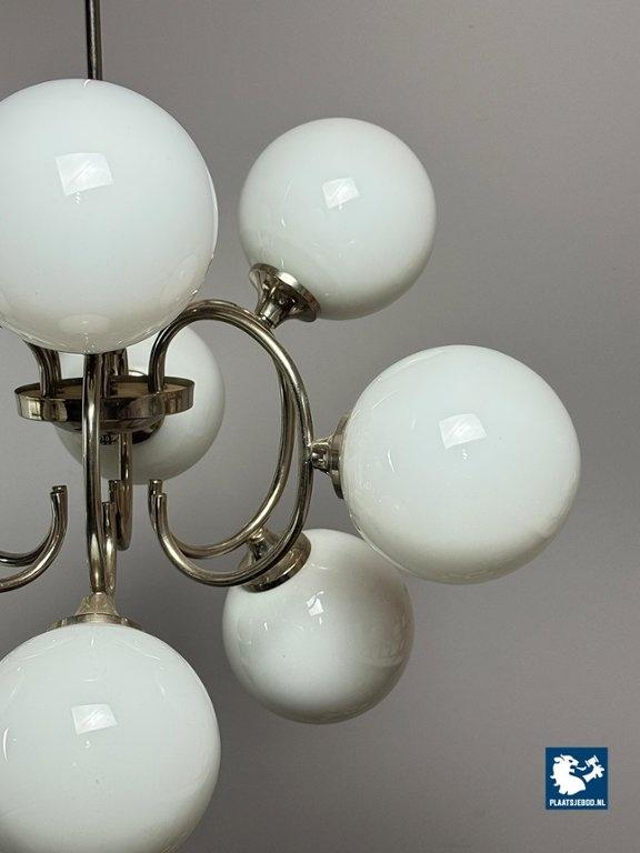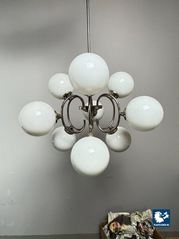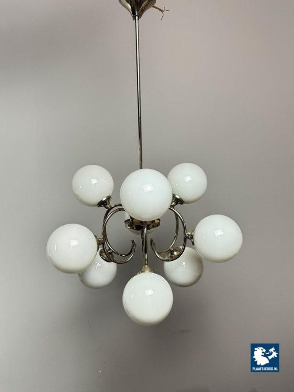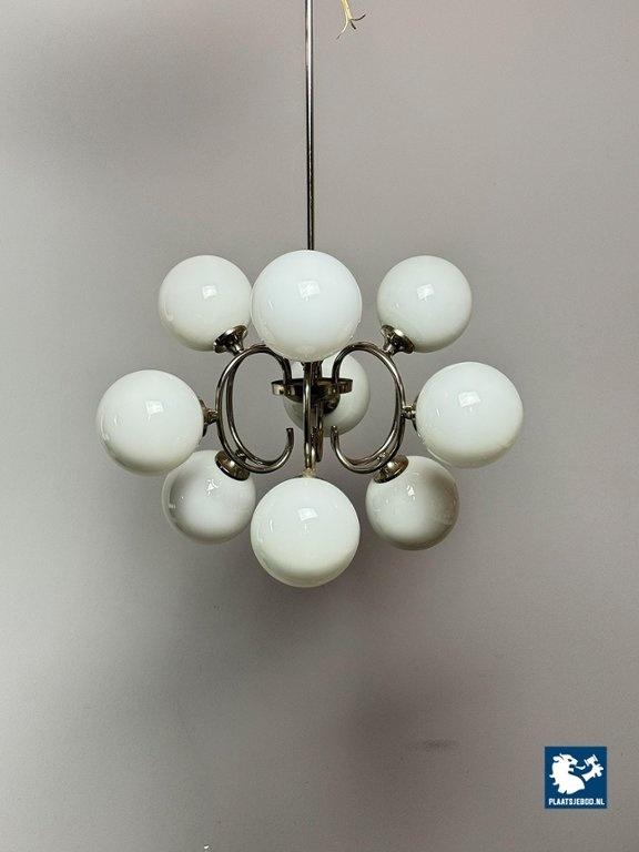 Striking atomic-style Sputnik chandelier from Italy, dating to the 1960s. The chromed metal frame supports nine white opaline glass globes, creating a dynamic and balanced composition. This design reflects the fascination with space exploration typical of the Space Age era. In very good vintage condition, with minimal wear consistent with age. Dimensions: Total height 90 Height Fixture 45 Width 55 Diameter Glass Balls 14 cm