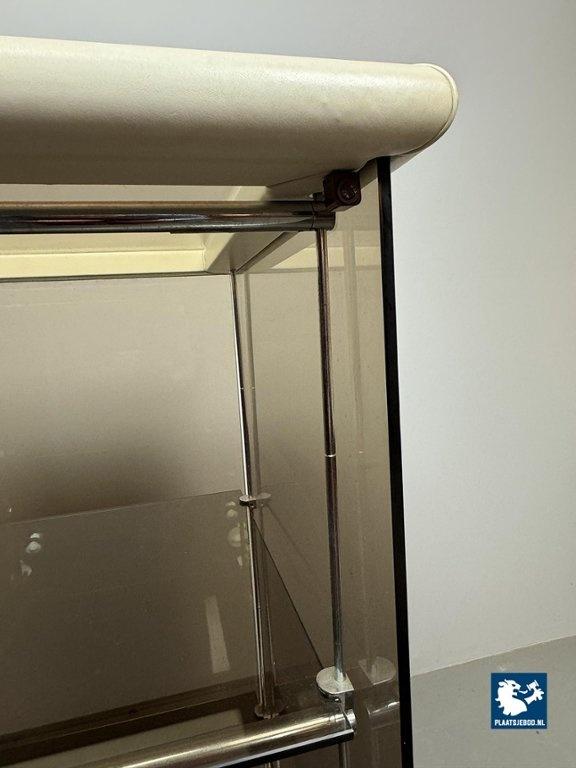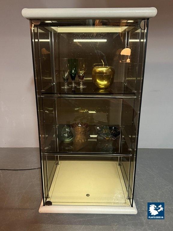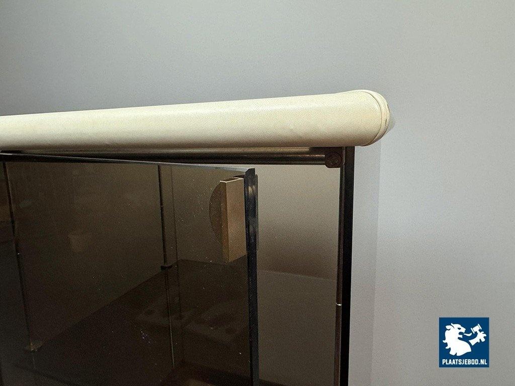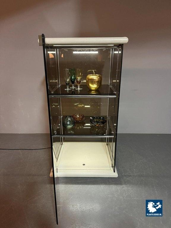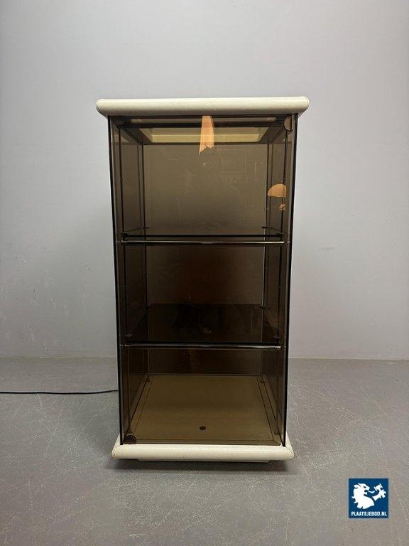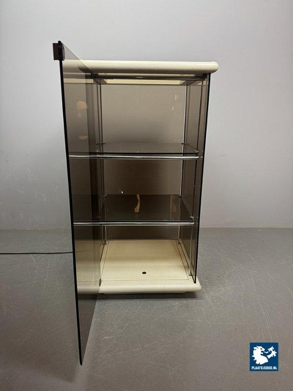 Mid-Century Italian Design 'Bogo' Vetrinetta Showcase Cabinet Designed by Carlo Bartoli for Rossi di Albizzate, Italy 1970s. An sophisticated Italian showcase cabinet, model BOGO, designed by Carlo Bartoli for Rossi di Albizzate, Italy 1970s, from the Redwall Linea Safari 2 collection. Executed in smoked glass with refined leather edge detailing, the cabinet features a glazed door with a minimal metal handle and subtle integrated interior lighting arranged on three levels. A distinguished example of Italian modern design, combining transparency, material richness and understated craftsmanship. A highly unusual and collectible cabinet. Condition note: a small chip “mouse bite” to one corner of the glass door. Dimensions: Height 120 cm, Width 60 cm, Depth 60 cm