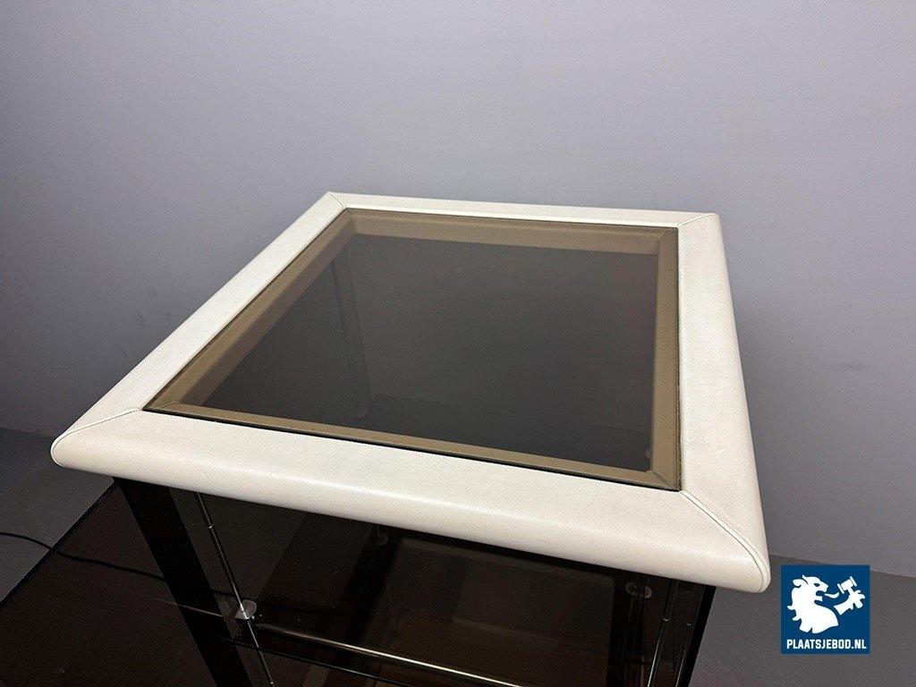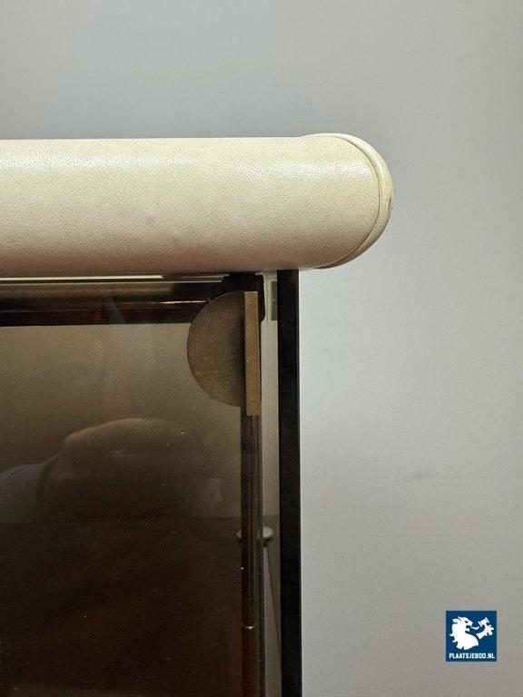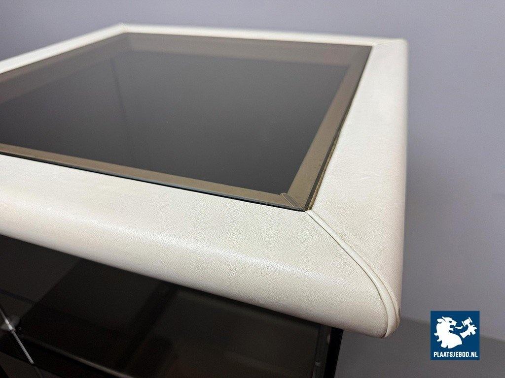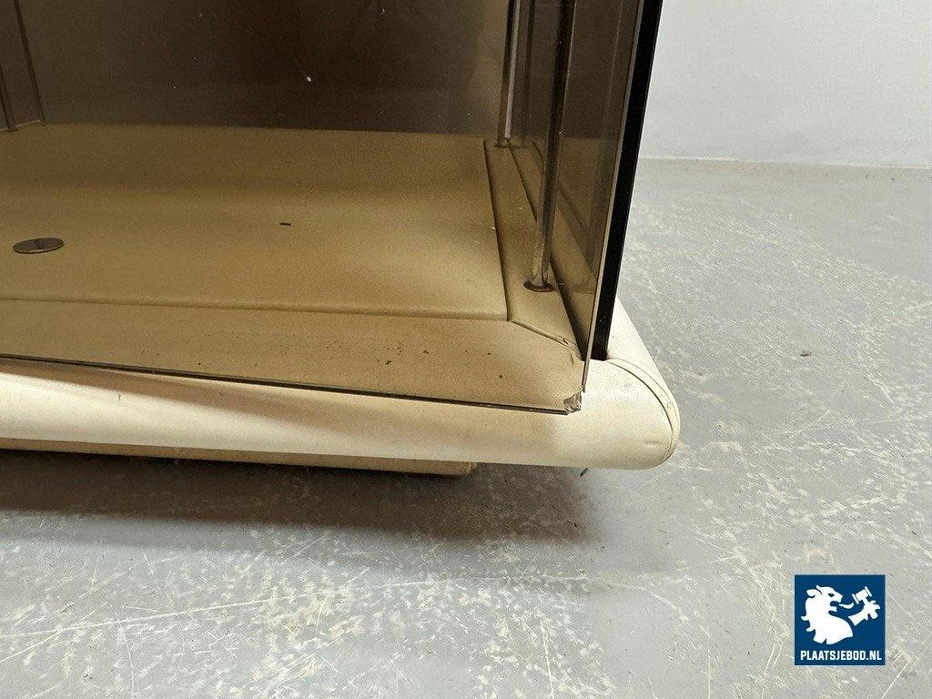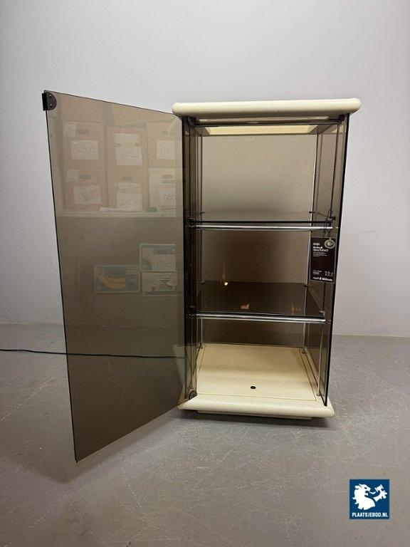 Mid-Century Italian Design 'Bogo' Vetrinetta Showcase Cabinet Designed by Carlo Bartoli for Rossi di Albizzate, Italy 1970s. An sophisticated Italian showcase cabinet, model BOGO, designed by Carlo Bartoli for Rossi di Albizzate, Italy 1970s, from the Redwall Linea Safari 2 collection. Executed in smoked glass with refined leather edge detailing, the cabinet features a glazed door with a minimal metal handle and subtle integrated interior lighting arranged on three levels. A distinguished example of Italian modern design, combining transparency, material richness and understated craftsmanship. A highly unusual and collectible cabinet. Condition note: a small chip “mouse bite” to one corner of the glass door. Dimensions: Height 120 cm, Width 60 cm, Depth 60 cm