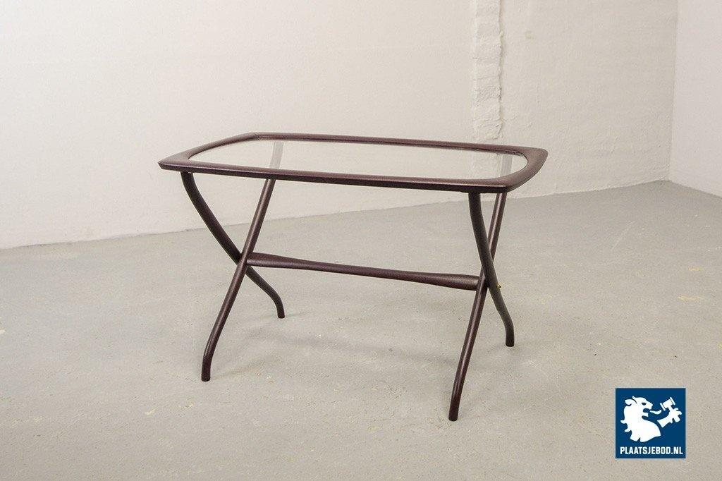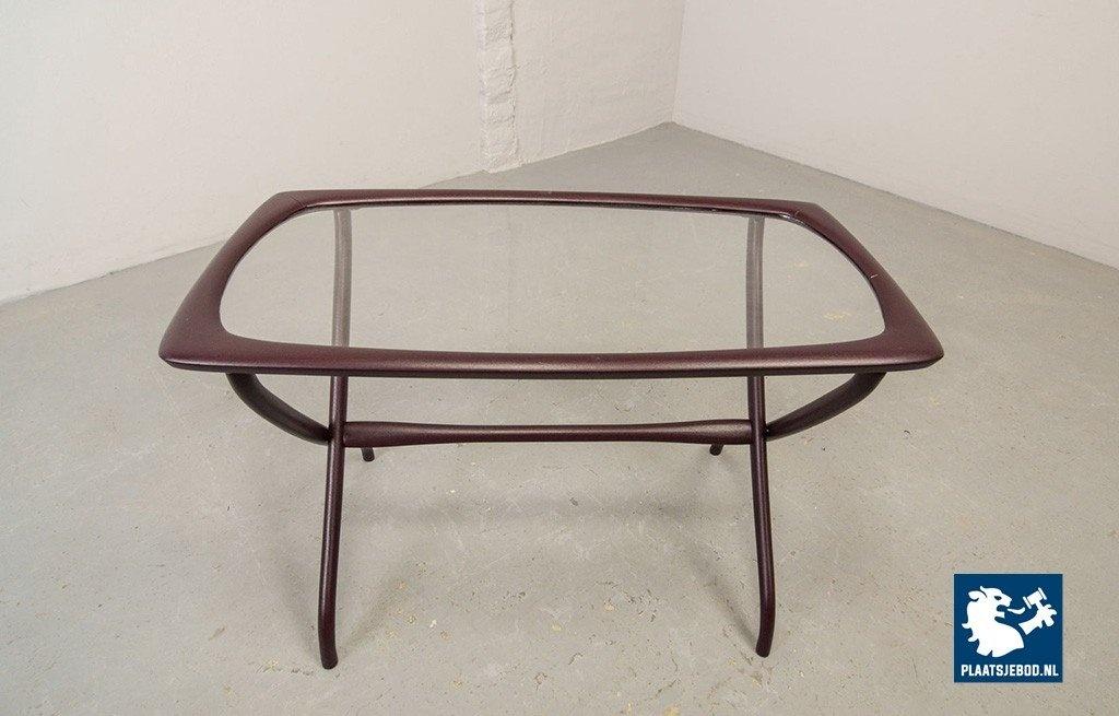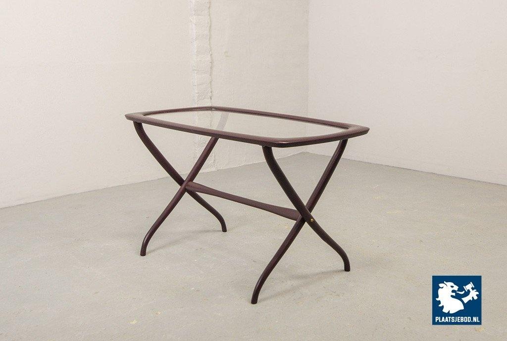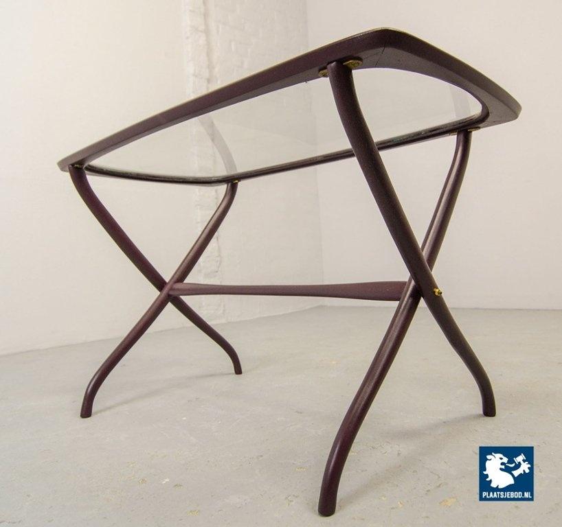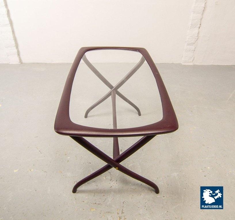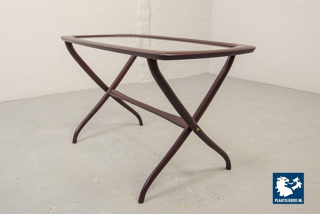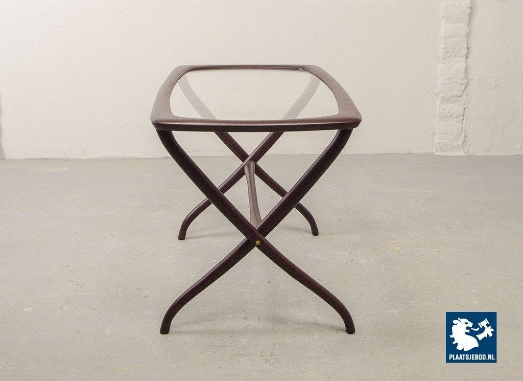 Mid-century Italian design side table manufactured in the 1950s. Elegant solid wooden scissor frame with glass top. This side table is in a well preserved condition with minor wear consistent its age and use. Dimensions: Height: 48 cm, Width: 74 cm, Depth: 38 cm, Quantity: 1