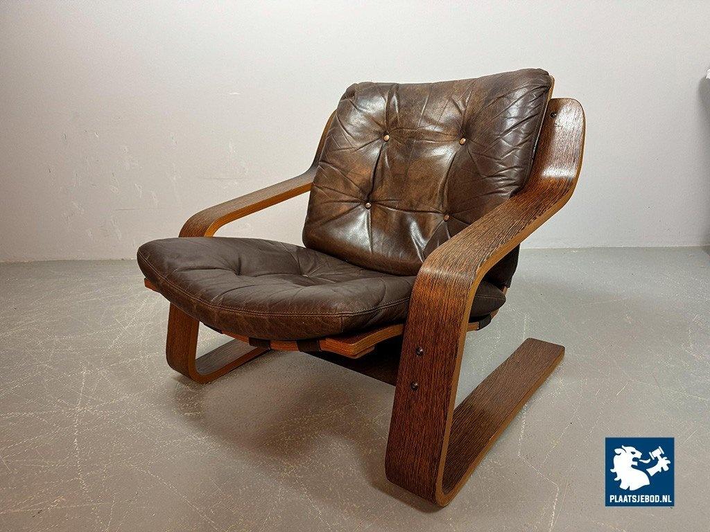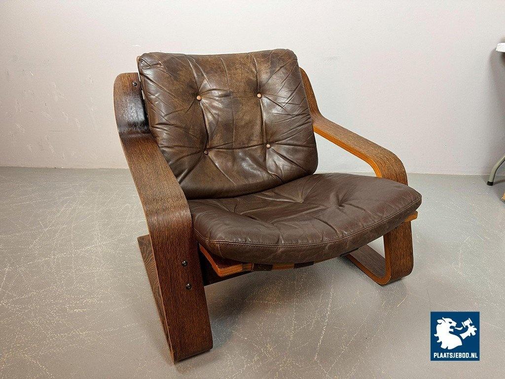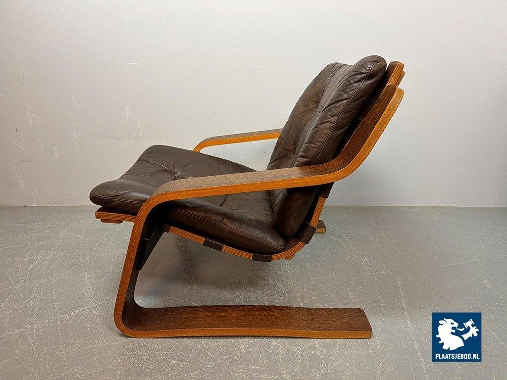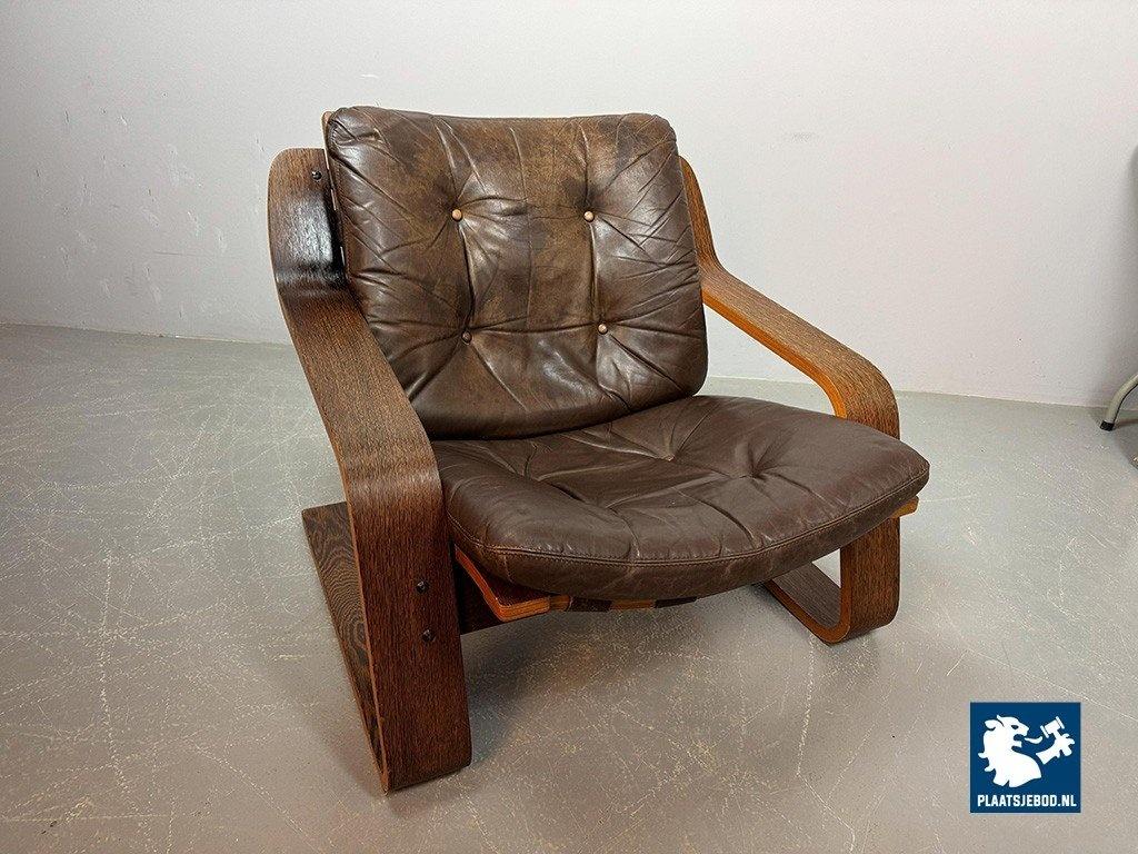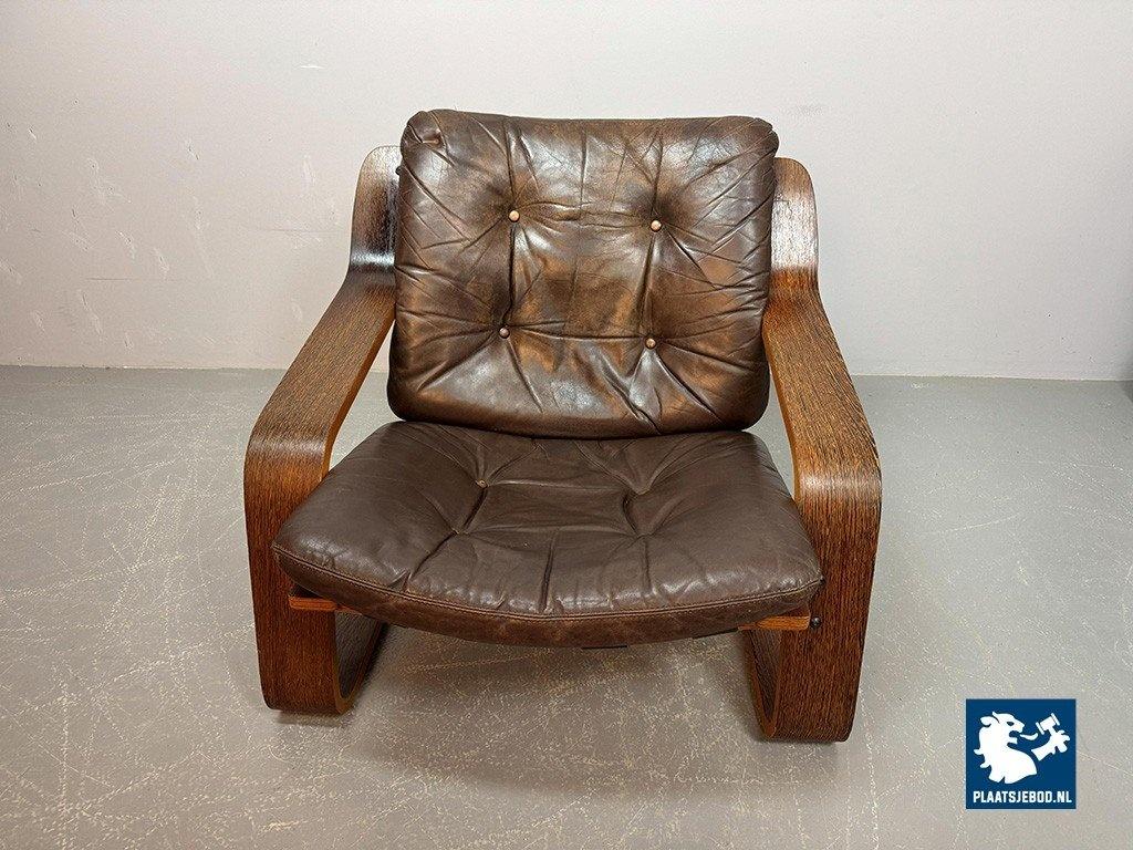 Distinctive plywood lounge chair produced in the Netherlands around 1970. This unknown but highly interesting design combines influences reminiscent of Ingmar Relling’s use of leather and canvas with the sculptural bentwood approach associated with Alvar Aalto. The chair features a wenge-stained plywood frame, two chocolate-brown leather cushions and a canvas backrest. Very comfortable seating and preserved in excellent original condition. A rare and characterful Mid-Century lounge chair. Dimensions: Height 70 cm, Width 82 cm, Depth 88 cm, Seating Height 37 cm, Arm Rests 44 cm