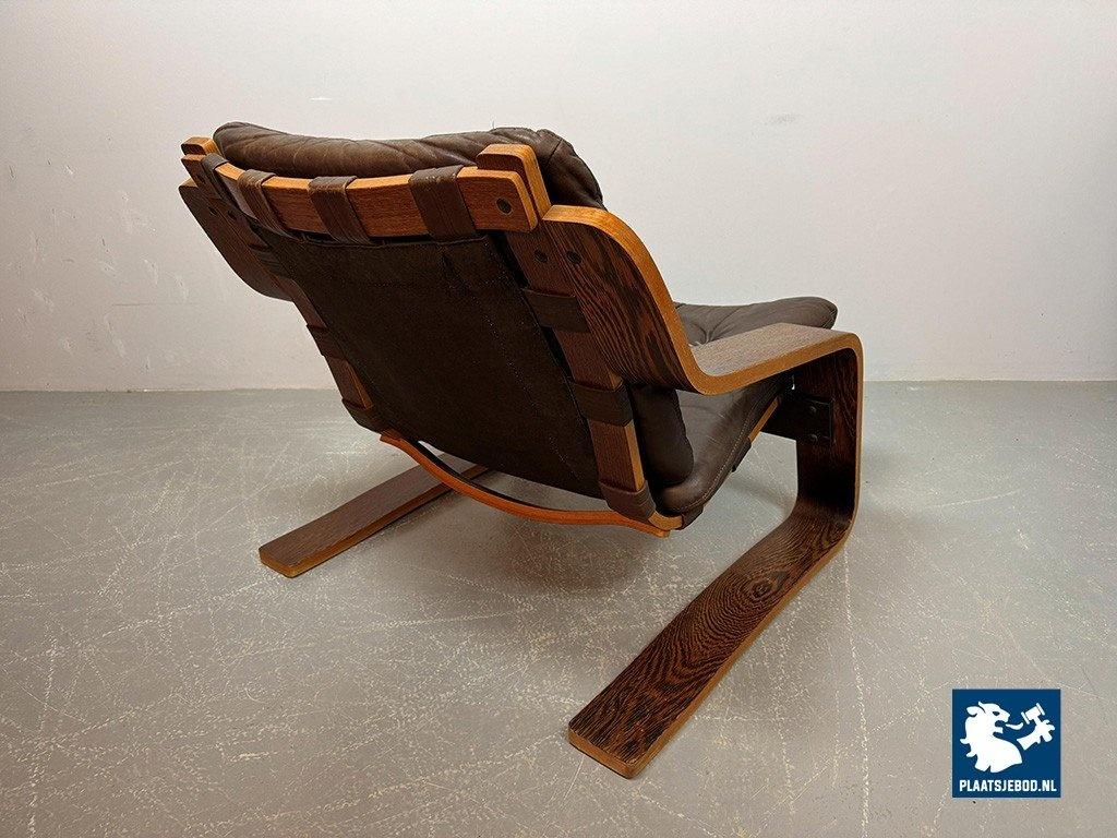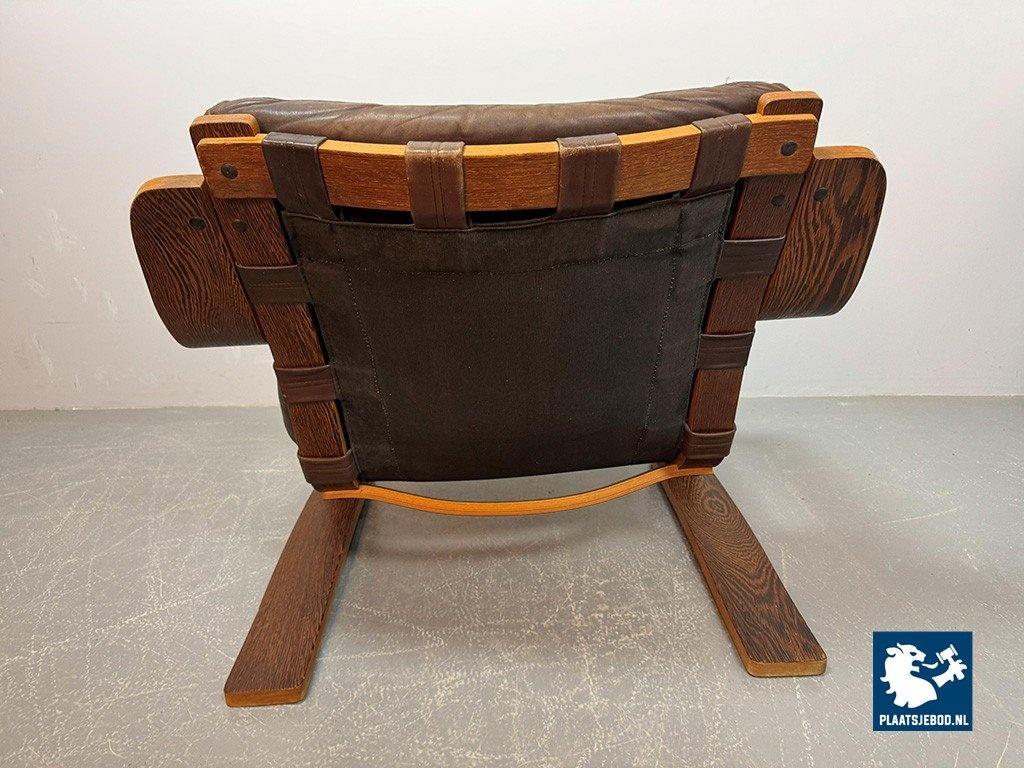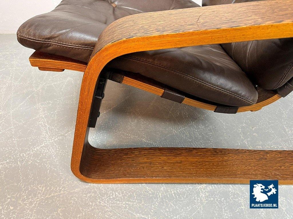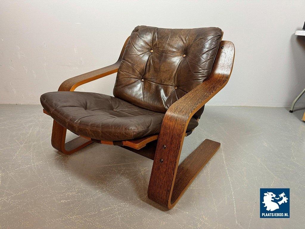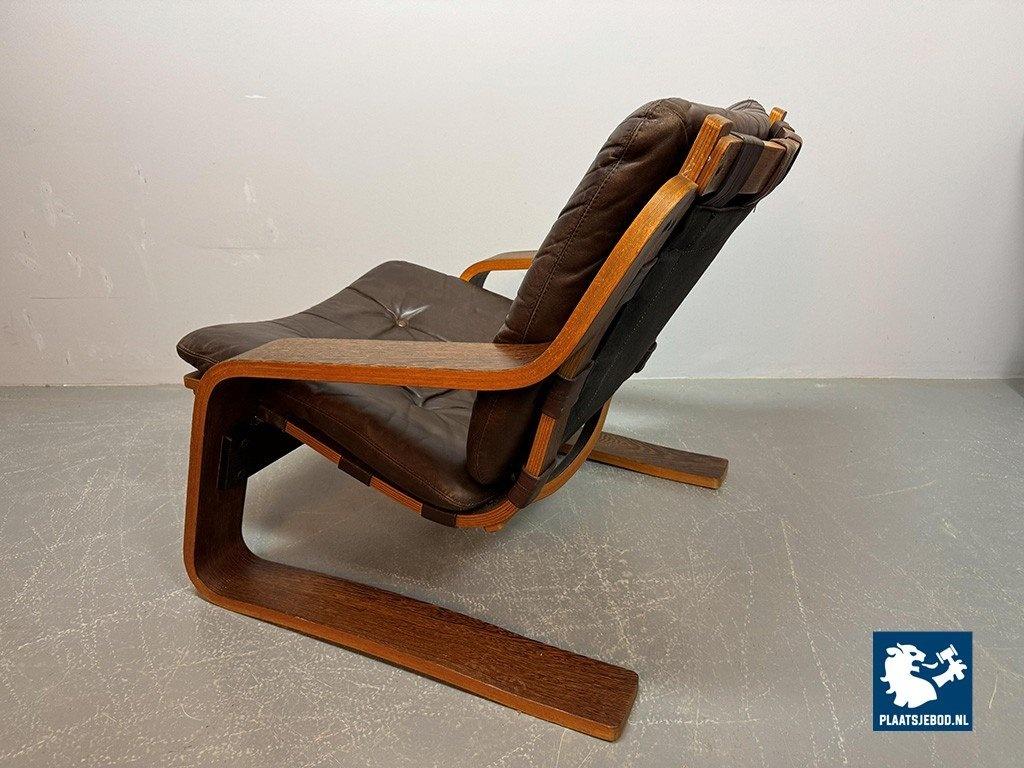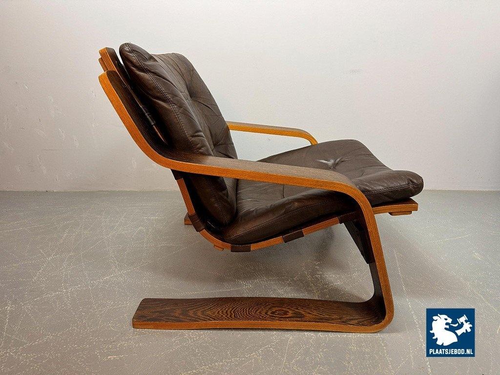 Distinctive plywood lounge chair produced in the Netherlands around 1970. This unknown but highly interesting design combines influences reminiscent of Ingmar Relling’s use of leather and canvas with the sculptural bentwood approach associated with Alvar Aalto. The chair features a wenge-stained plywood frame, two chocolate-brown leather cushions and a canvas backrest. Very comfortable seating and preserved in excellent original condition. A rare and characterful Mid-Century lounge chair. Dimensions: Height 70 cm, Width 82 cm, Depth 88 cm, Seating Height 37 cm, Arm Rests 44 cm