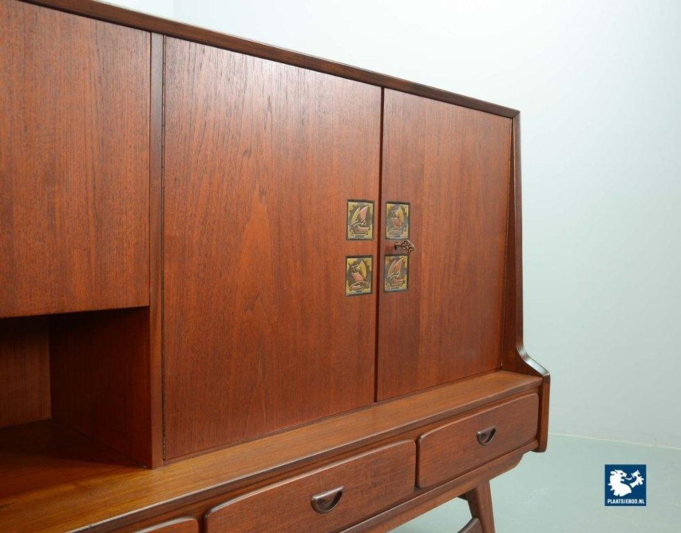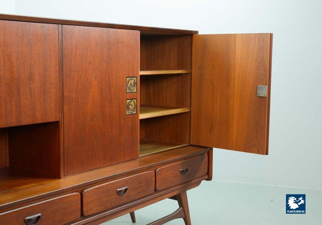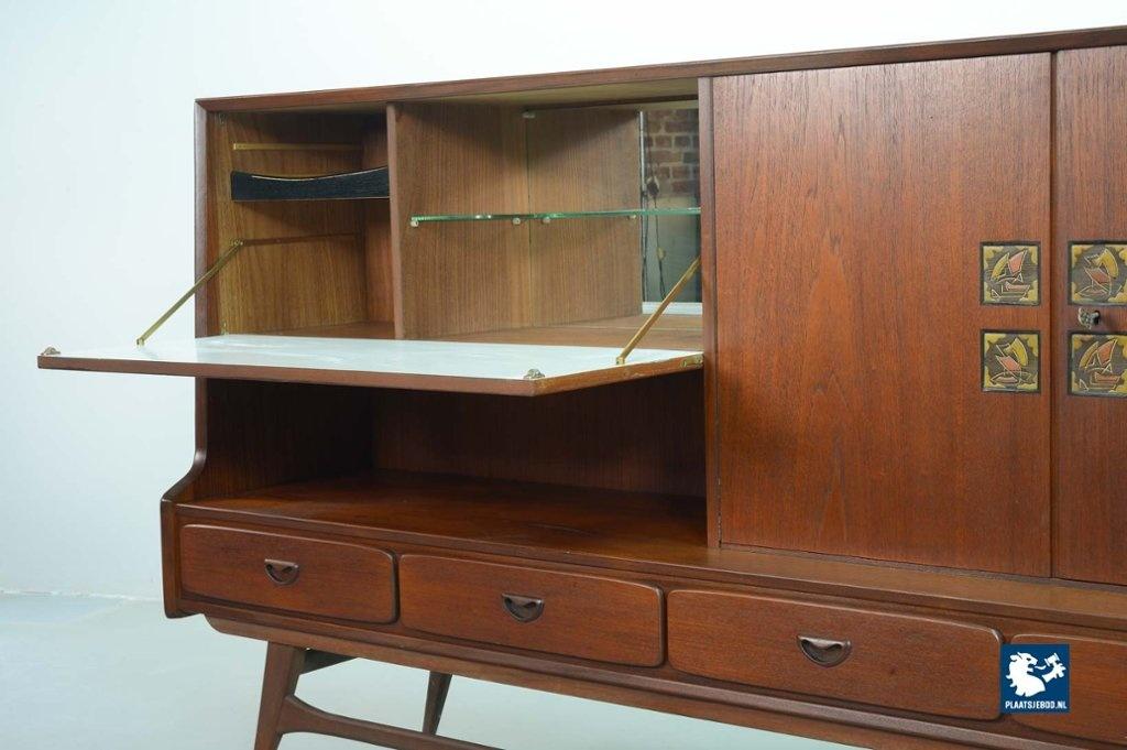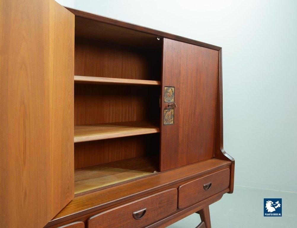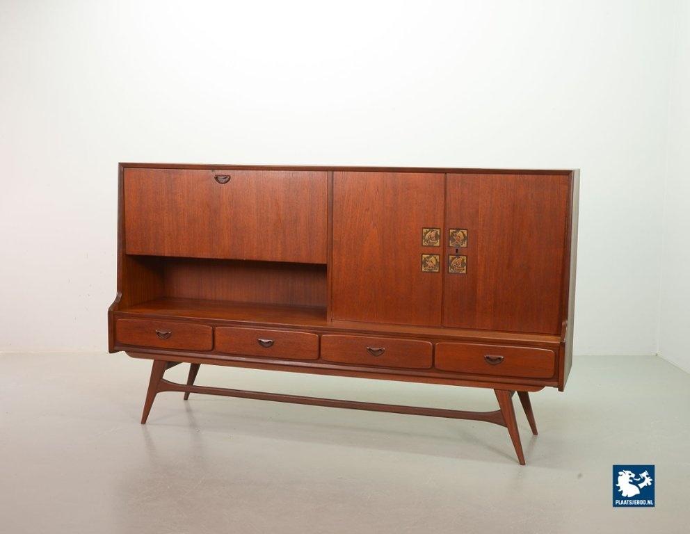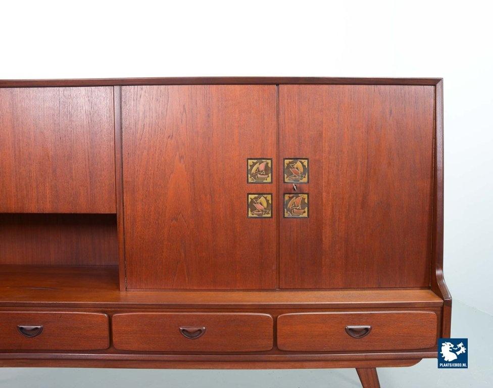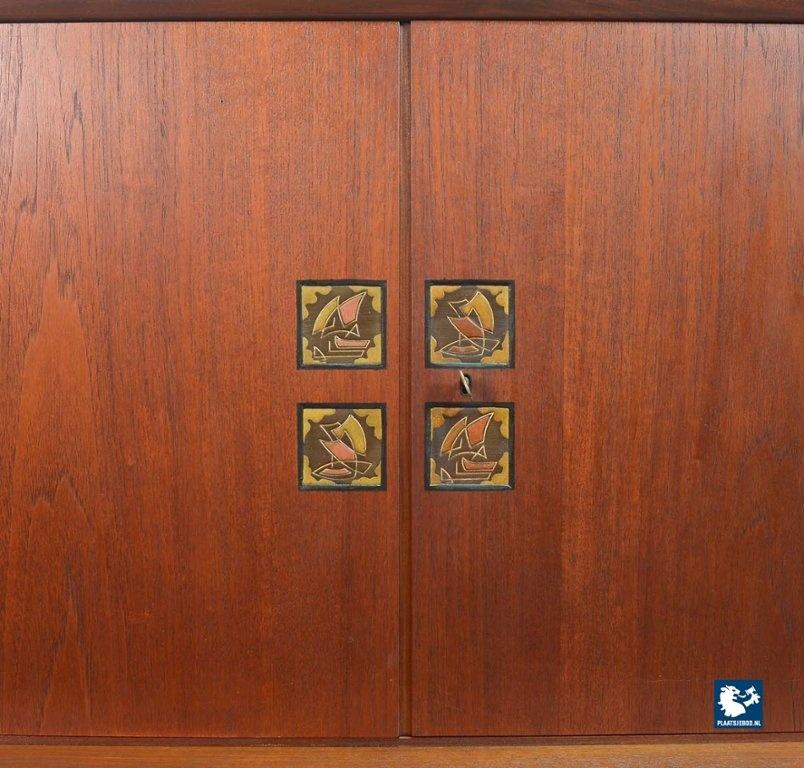 Large mid-century Dutch design solid teak wooden highboard manufactured by Webe in the 1960s. This high quality teak sideboard features on the left side a closed bar unit with a mirror on the back wall and a small storage part with a tiny drawer. Underneath this left part there’s an open space to expose some of your favourite things or photos. The right side features two doors which can be locked with a matching key, decorated with 4 beautiful ceramic tiles by the artist Jaap Ravelli. Inside you’ll find two large shelves to divide this storage part. Finally, there are 4 drawers next to each other with an elegant handcrafted wooden grip. This nice and sturdy sideboard contains a lot of storage space. Well preserved vintage condition with only some minor wear on the top of the sideboard as shown on the photos. Height: 118 cm, Width: 200 cm, Depth: 45 cm, Quantity: 1