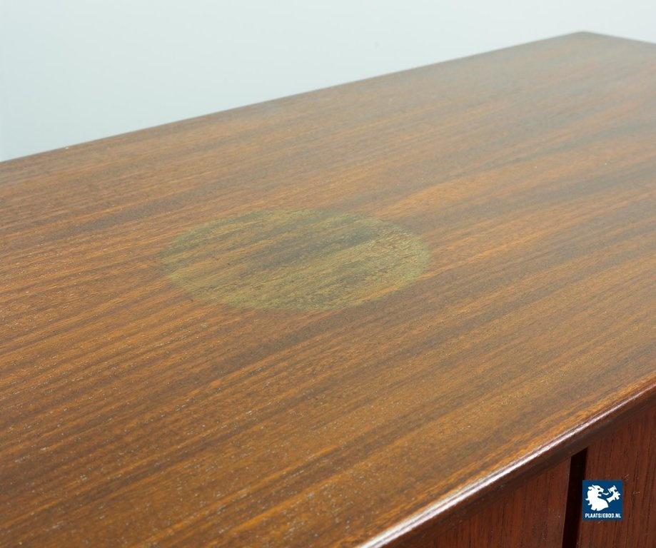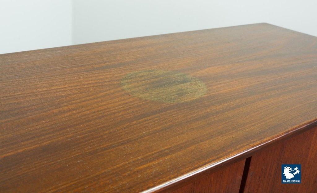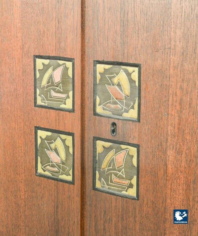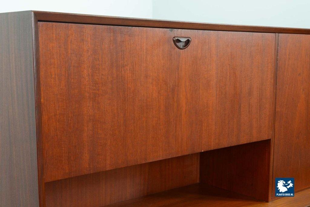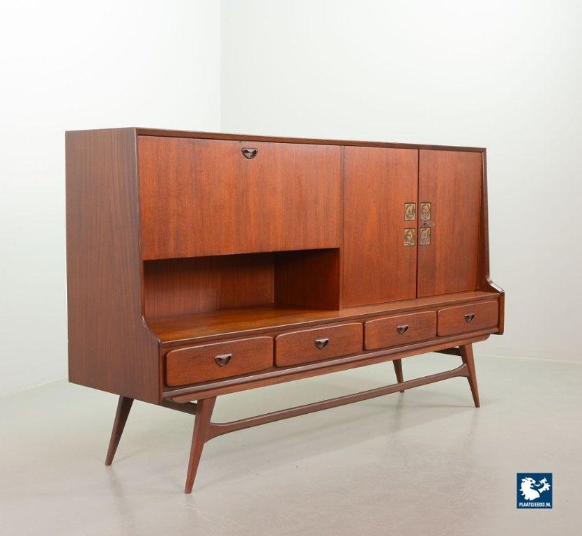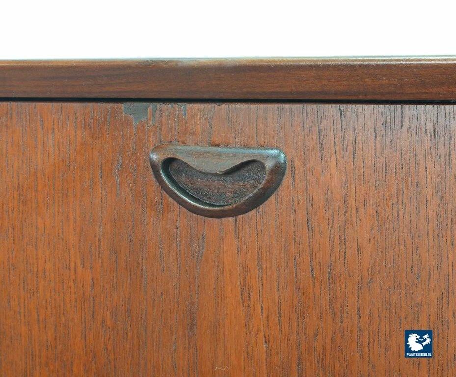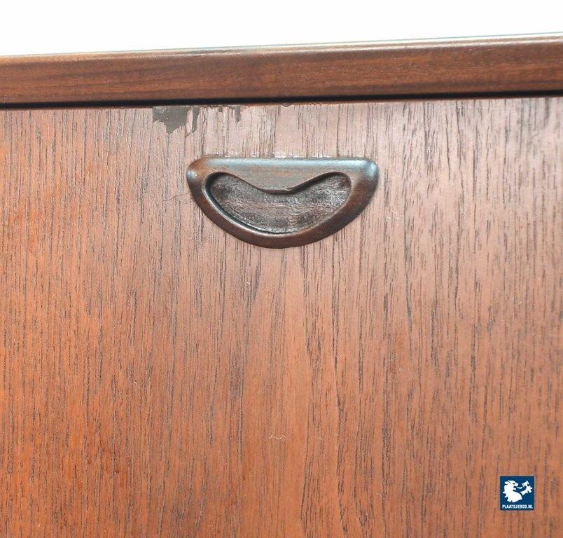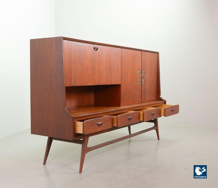 Large mid-century Dutch design solid teak wooden highboard manufactured by Webe in the 1960s. This high quality teak sideboard features on the left side a closed bar unit with a mirror on the back wall and a small storage part with a tiny drawer. Underneath this left part there’s an open space to expose some of your favourite things or photos. The right side features two doors which can be locked with a matching key, decorated with 4 beautiful ceramic tiles by the artist Jaap Ravelli. Inside you’ll find two large shelves to divide this storage part. Finally, there are 4 drawers next to each other with an elegant handcrafted wooden grip. This nice and sturdy sideboard contains a lot of storage space. Well preserved vintage condition with only some minor wear on the top of the sideboard as shown on the photos. Height: 118 cm, Width: 200 cm, Depth: 45 cm, Quantity: 1