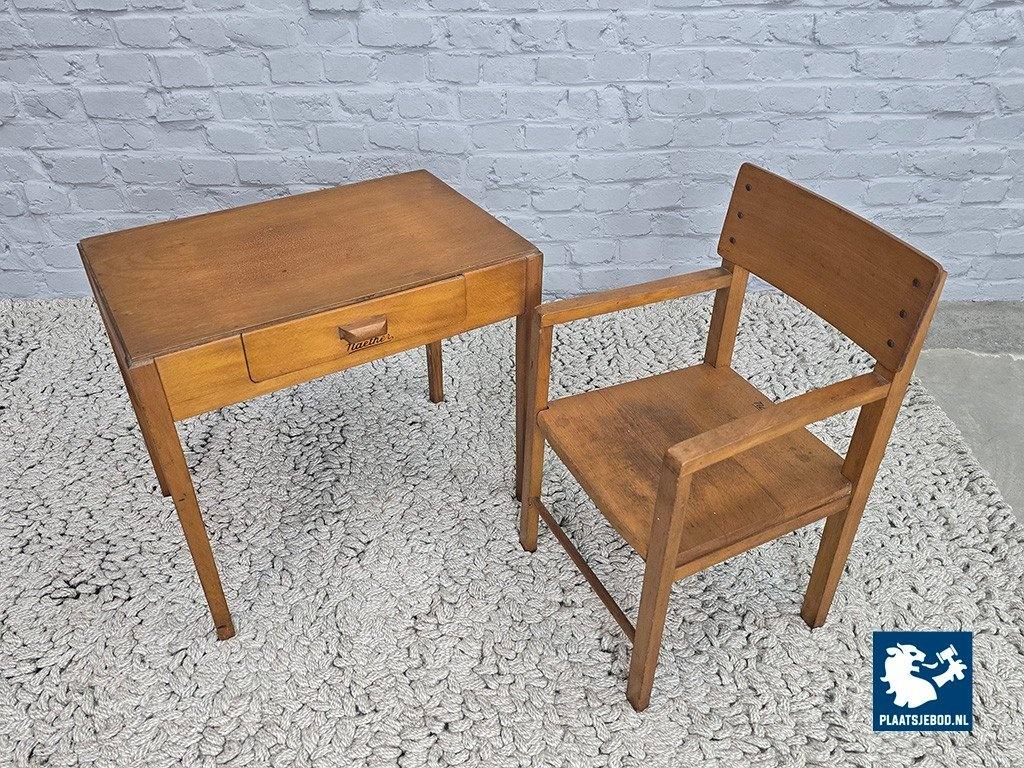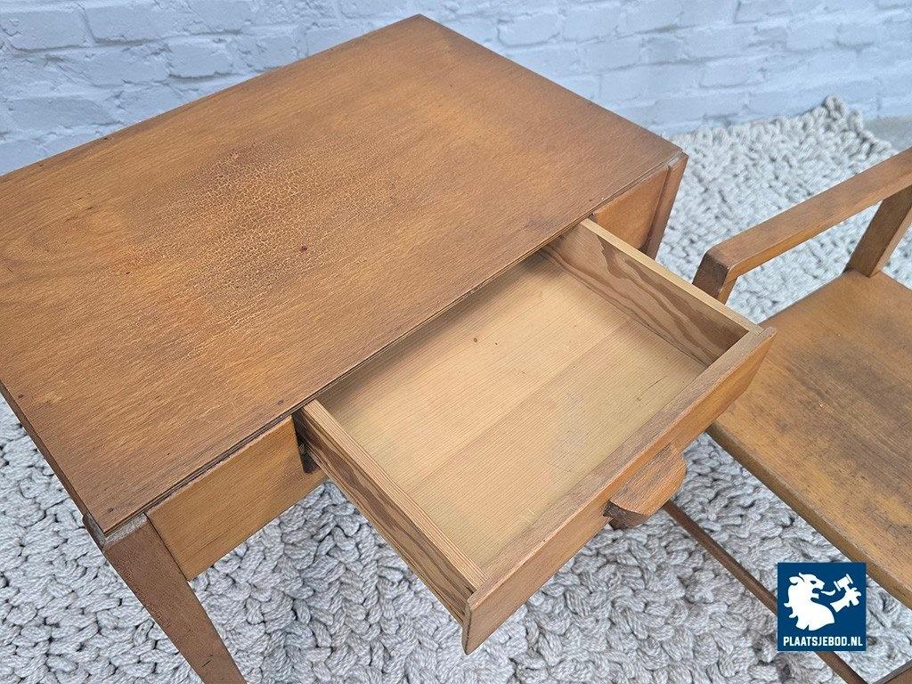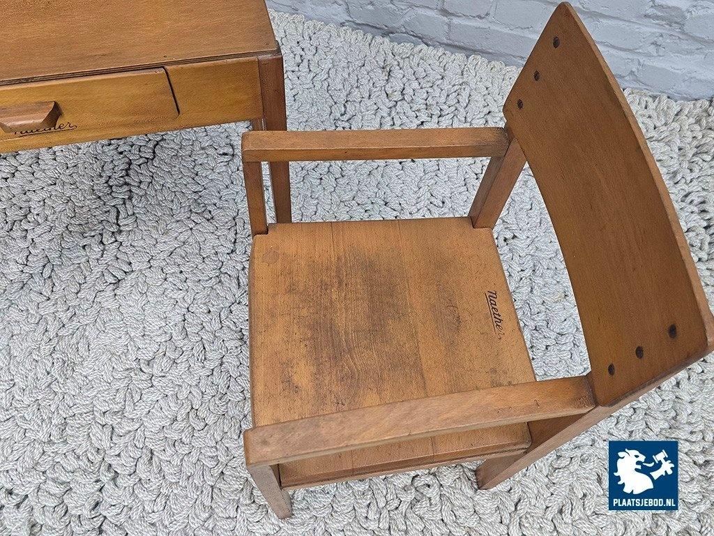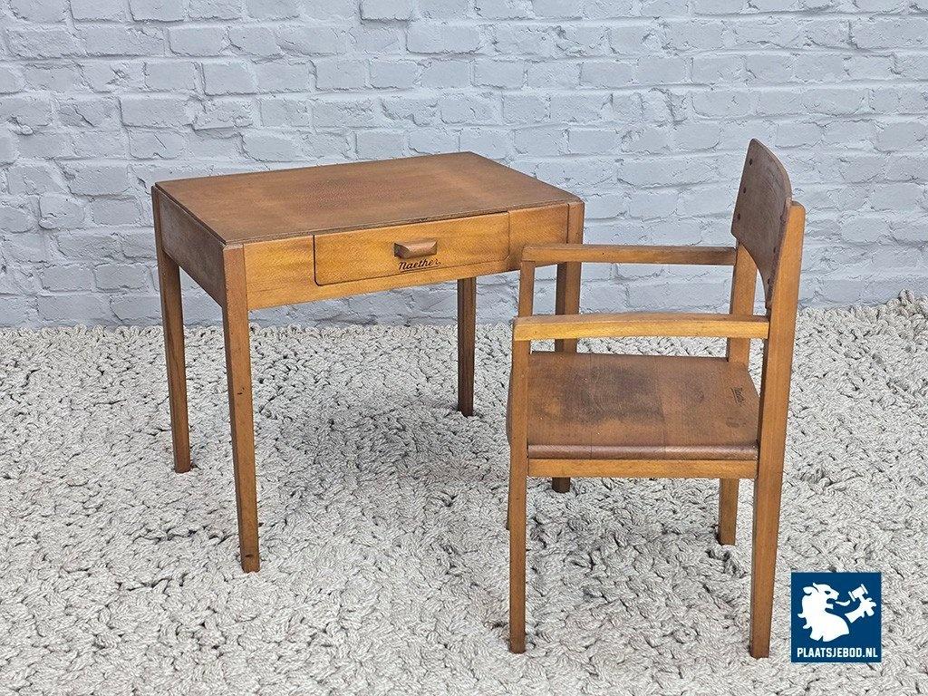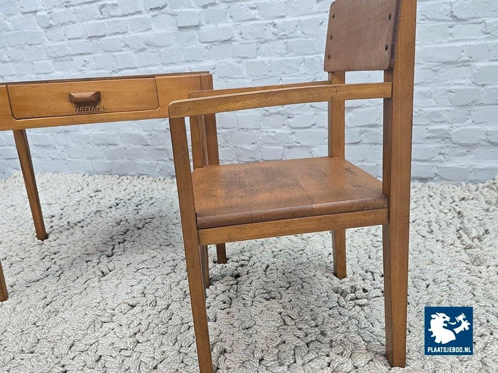 Charming children’s oak wooden desk with matching chair produced by the German manufacturer Naether, known for its high-quality wooden furniture. The set features soft proportions and a timeless, functional design that reflects mid-century European craftsmanship. Both desk and chair show gentle signs of use consistent with age, and are presented in a well-preserved vintage condition, with a warm patina that enhances their character.Dimensions Desk: Height 51 Width 56 Depth 37 Chair: Height 63 Width 33 Depth 34 cm.