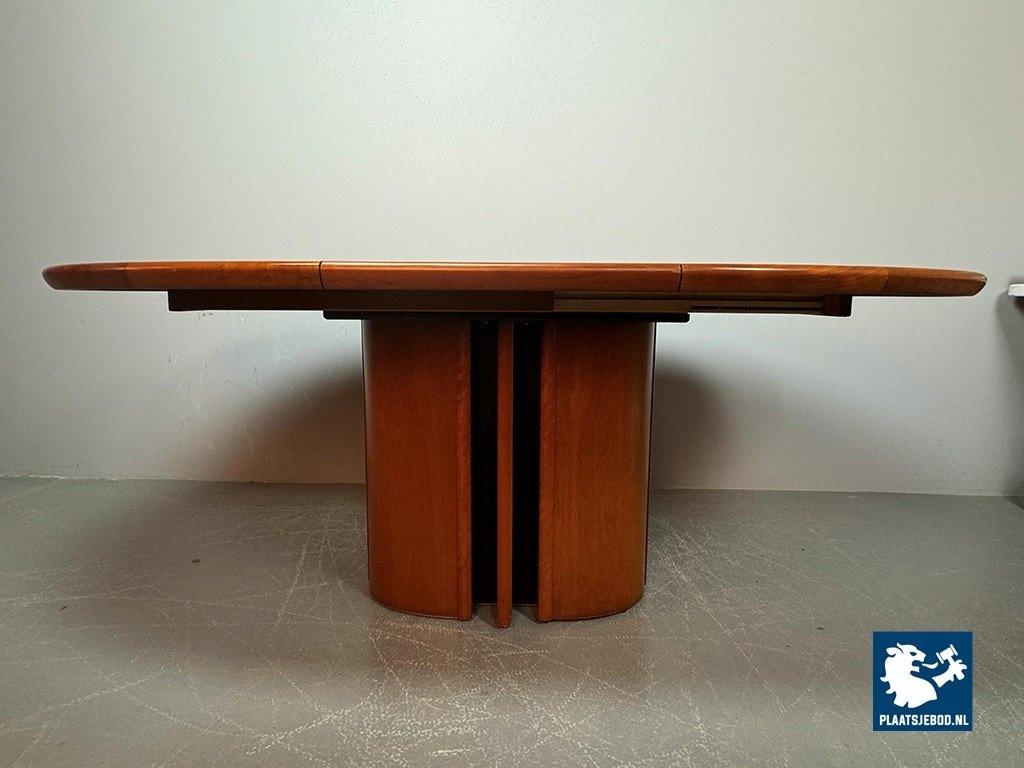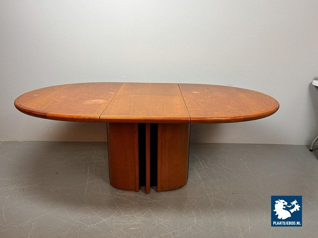 Vintage oval extendable dining table by Skovby, model 74, designed and produced in Denmark during the 1960s. This table is distinguished by its clever central base construction with two cylindrical legs that slide apart to reveal the extension system. The extension leaves are typically stored beneath the tabletop, allowing the table to expand from a comfortable six-seater to seating for up to twelve.