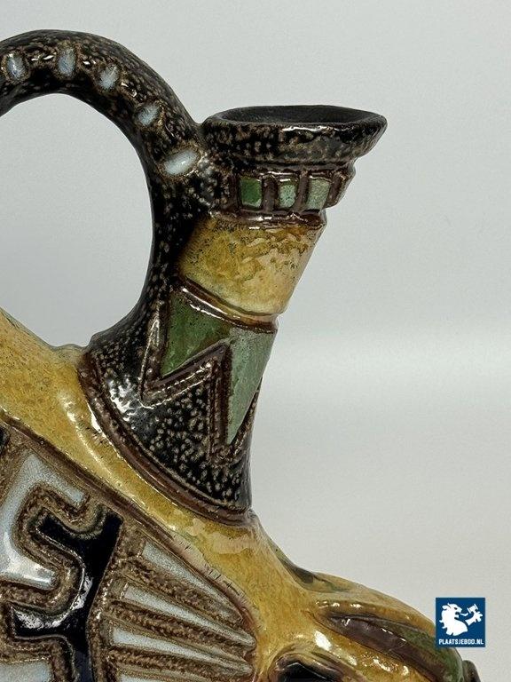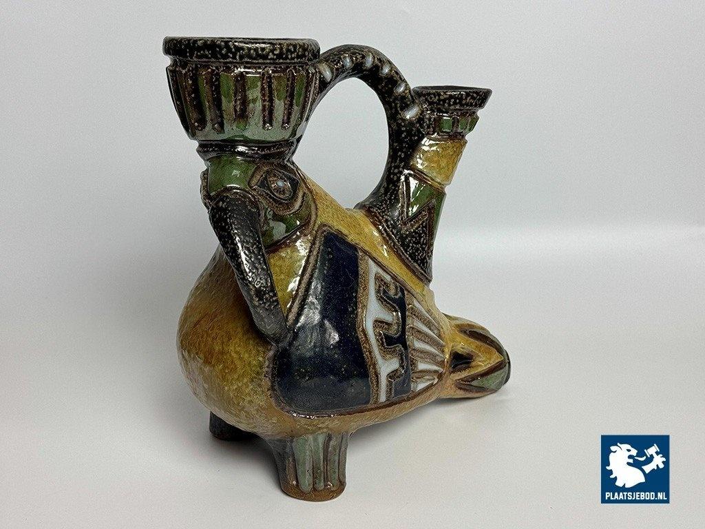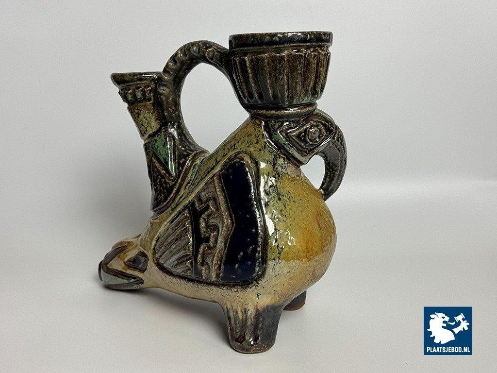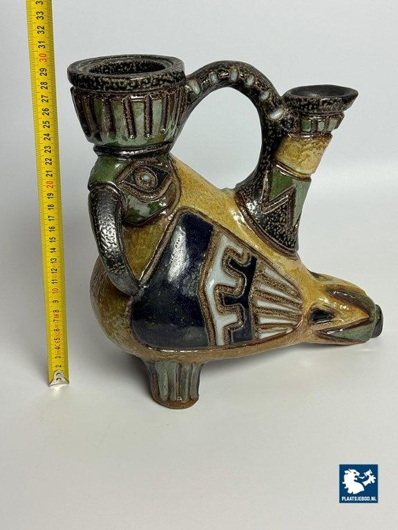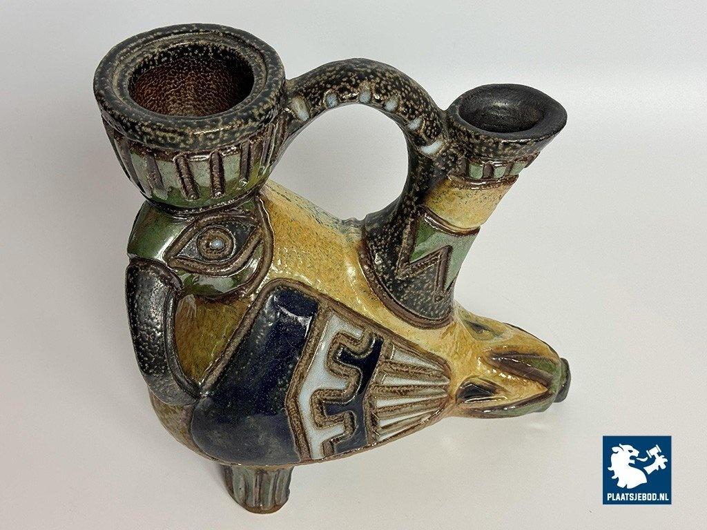 Mid-century Zoomorphic Aztec Bird Sculpture Designed by the Belgium Artist Jules Guérin, 1950s. Rare and highly aesthetic zoomorphic ceramic vase-sculpture by Belgian ceramicist Jules Guérin, executed in salt-glazed stoneware in Bouffioulx during the 1950s. The stylized bird form reflects modernist interpretations of pre-Columbian Inca and Aztec motifs, a recurring inspiration in Guérin’s post-war work. The piece is both sculptural and functional, balancing abstraction with strong symbolic presence. Signed and model-numbered under the base (form number 3225), this work belongs to a particularly refined series produced after World War II. Preserved in excellent vintage condition. Dimensions Height 28 Width 28 Depth 16 cm