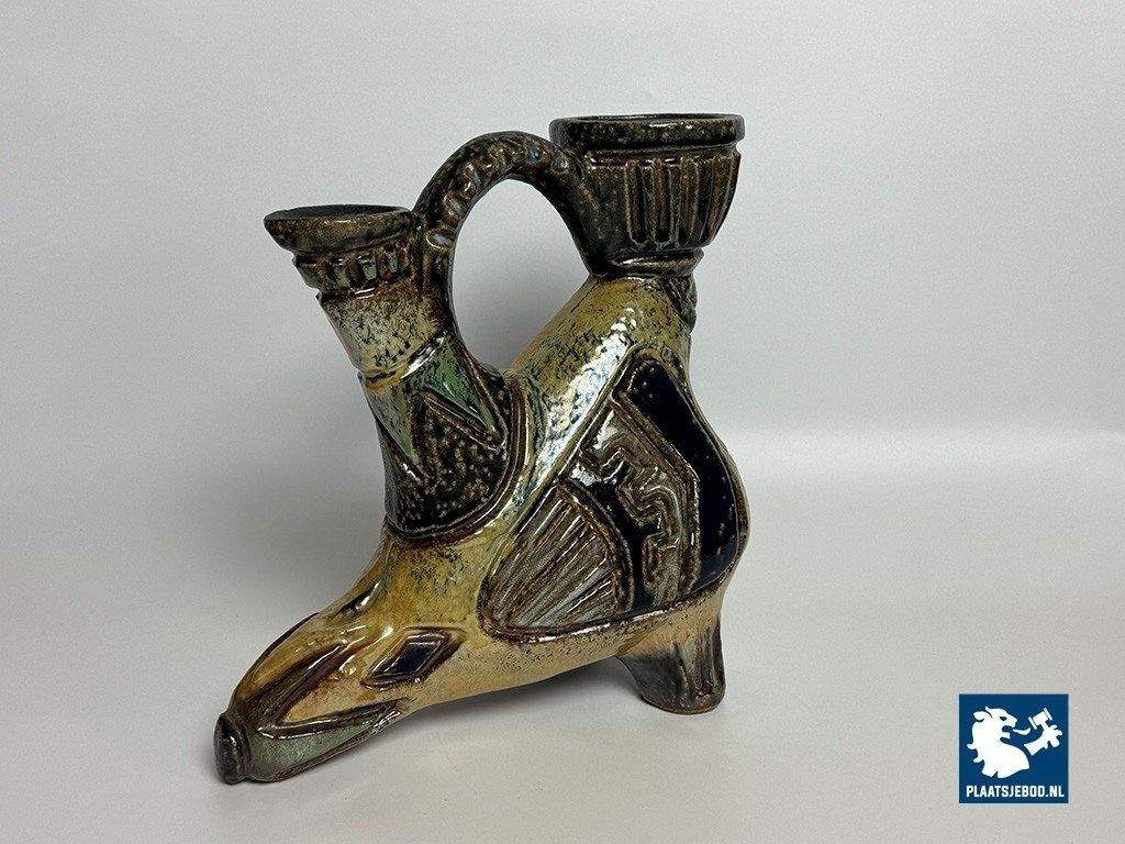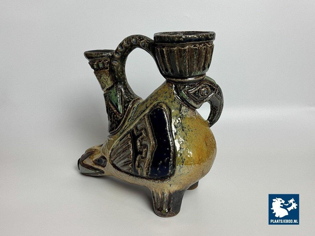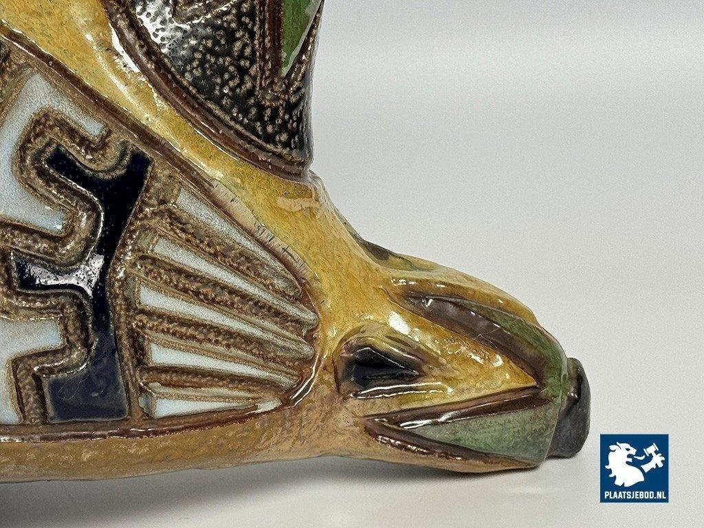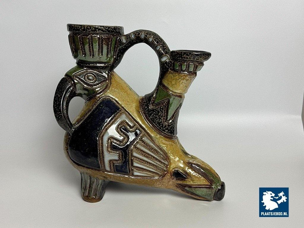 Mid-century Zoomorphic Aztec Bird Sculpture Designed by the Belgium Artist Jules Guérin, 1950s. Rare and highly aesthetic zoomorphic ceramic vase-sculpture by Belgian ceramicist Jules Guérin, executed in salt-glazed stoneware in Bouffioulx during the 1950s. The stylized bird form reflects modernist interpretations of pre-Columbian Inca and Aztec motifs, a recurring inspiration in Guérin’s post-war work. The piece is both sculptural and functional, balancing abstraction with strong symbolic presence. Signed and model-numbered under the base (form number 3225), this work belongs to a particularly refined series produced after World War II. Preserved in excellent vintage condition. Dimensions Height 28 Width 28 Depth 16 cm