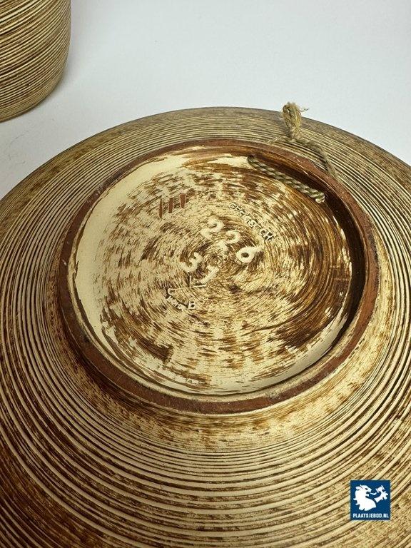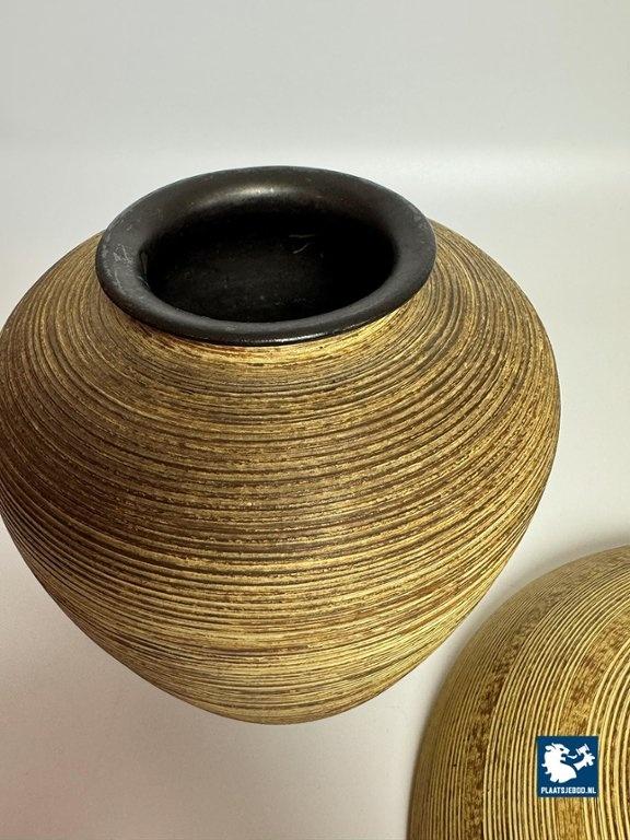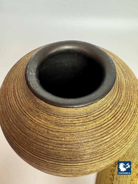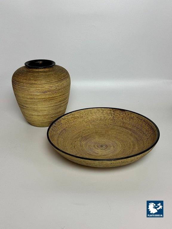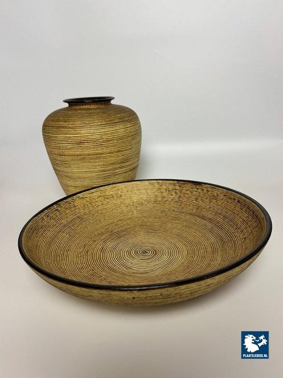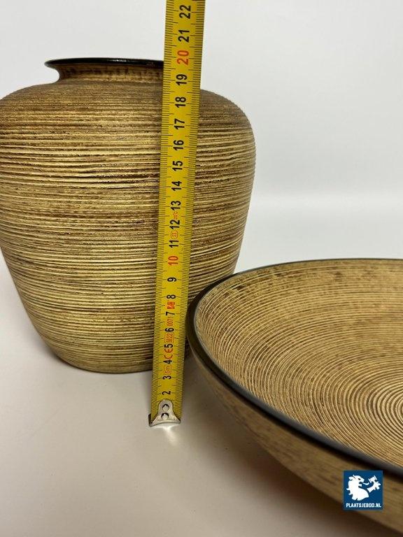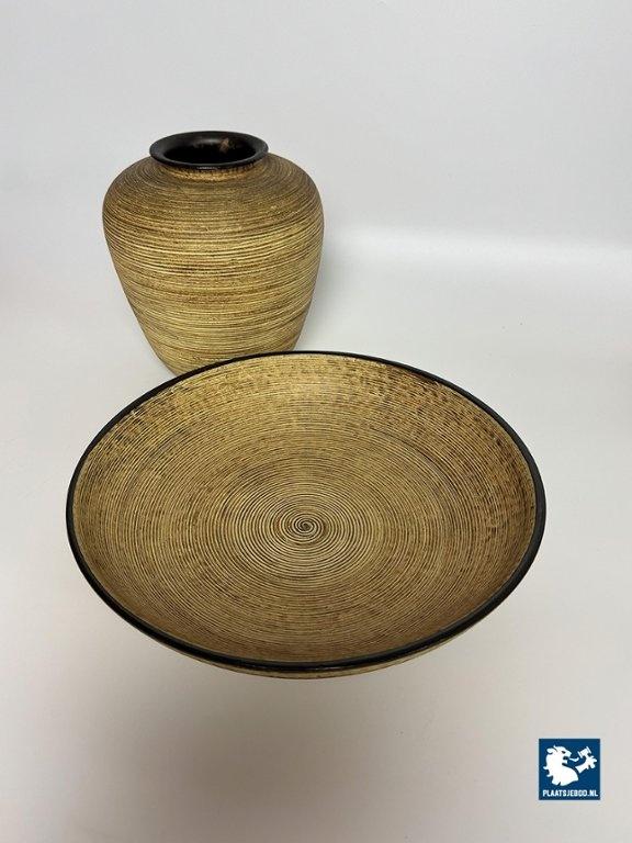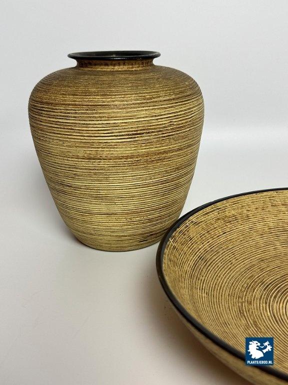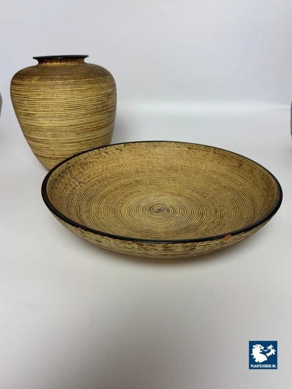 Mohr Ceramic Vase and Bowl Set by Mohr, Germany 1960s. Decorative ceramic vase and bowl set attributed to Mohr, marked Mohr Gesch. Handarbeit 27/20. The pieces feature a ribbed texture inspired by woven wicker, with fine, flowing lines that give a lively surface effect. Executed in warm mustard yellow and brown tones typical of 1960s design. Both items are crafted from ceramic and presented in very good vintage condition. An atmospheric and cohesive mid-century set. Bowl: Height 7 Diameter 30 cm, Vase Height 23 Diameter Top Diameter opening 7 cm.