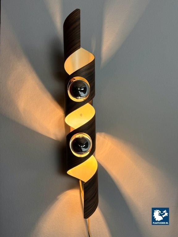 A striking vintage spiral wall lamp by Raak, produced in the Netherlands during the late 1960s–1970s. The lamp features a sculptural spiral construction with a dark wood-effect exterior and a white interior, designed with circular openings that reveal mirrored reflector bulbs. When illuminated, these apertures cast a dramatic, rhythmic play of light and shadow across the wall. This design is quintessential Raak: bold, architectural, and experimental, with a strong emphasis on light as an active visual element rather than mere illumination. The vertical spiral form gives the lamp a totem-like presence, making it an expressive wall object even when switched off. Particularly effective with mirror-reflex bulbs, as intended in the original design. As with all vintage items or lighting, this piece may show light signs of use, which add to its authentic character. Dimensions: Height: 44 cm, Width: 7 cm, Depth: 10 cm