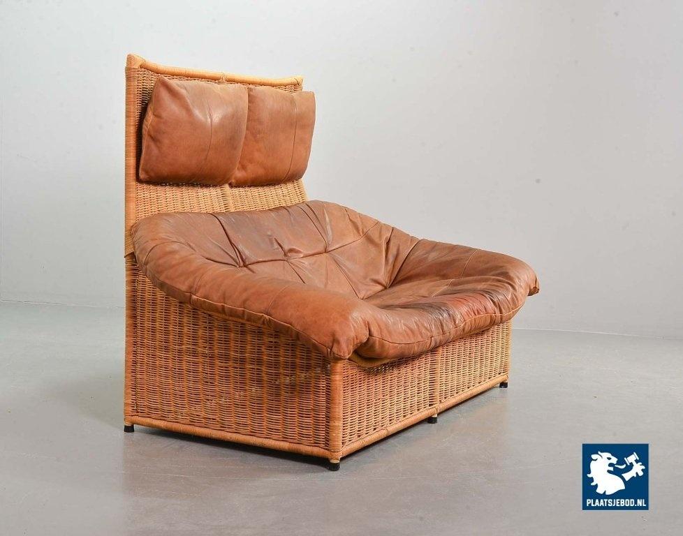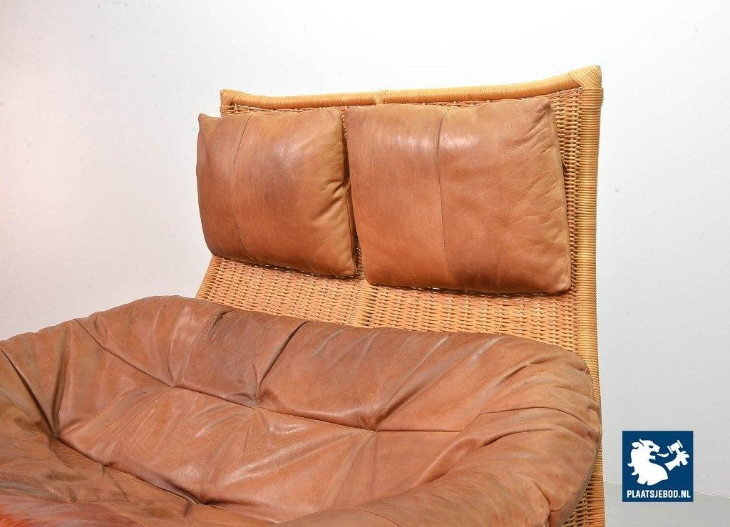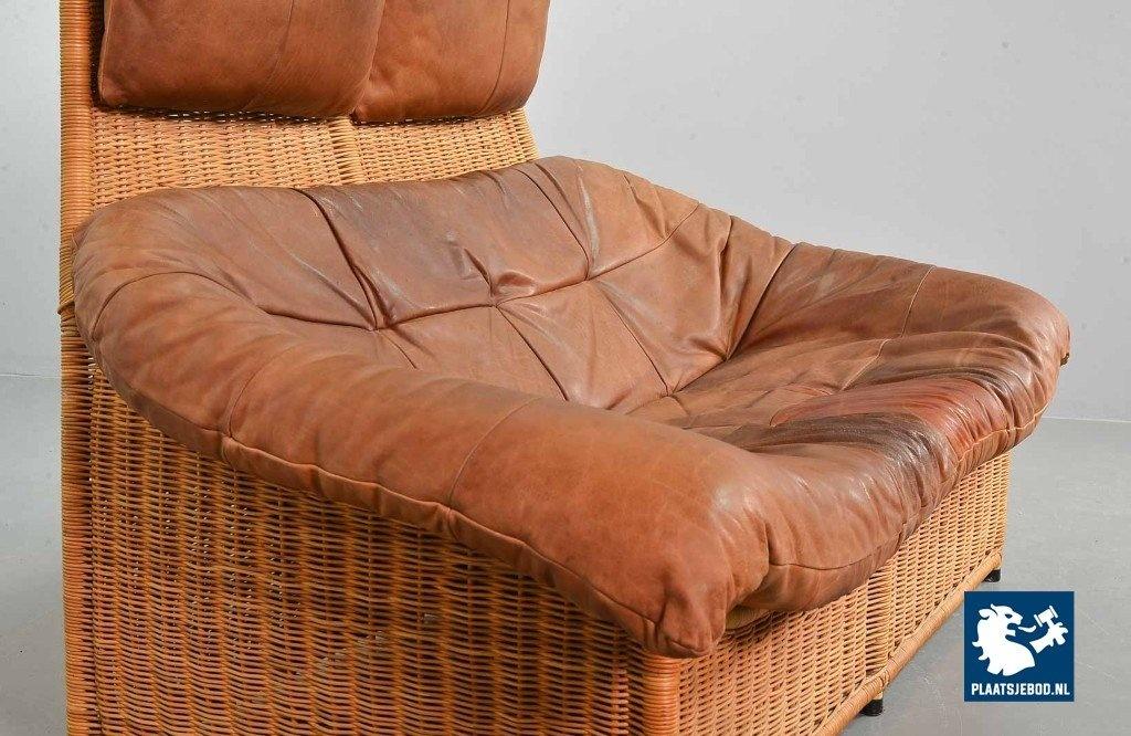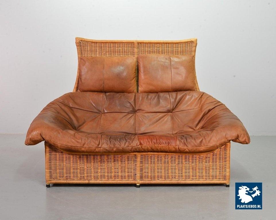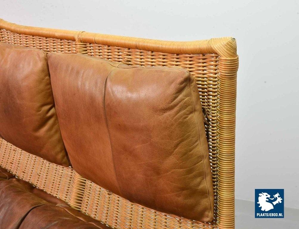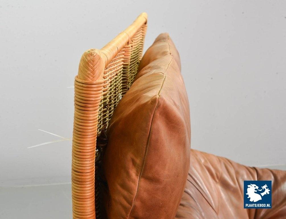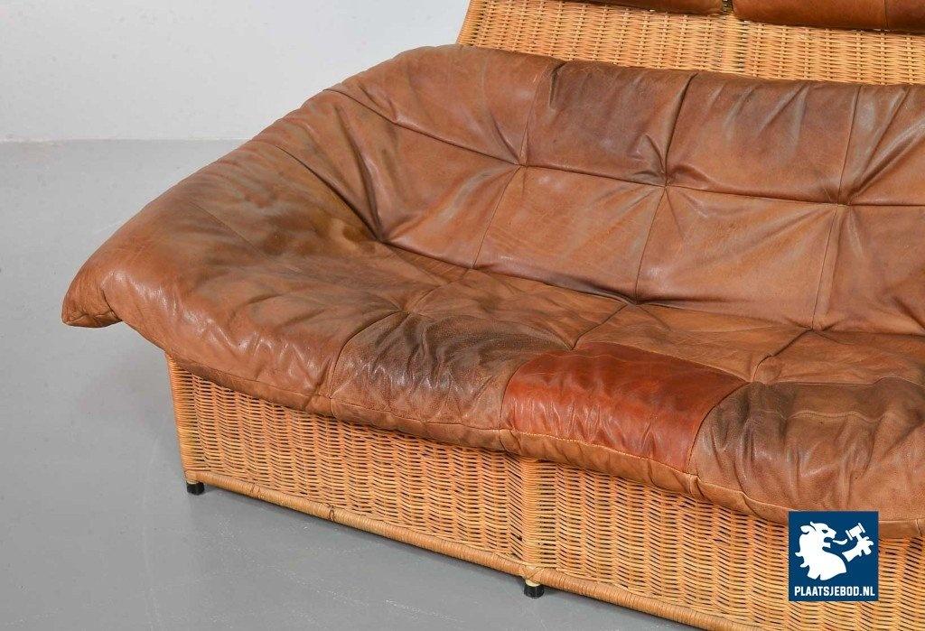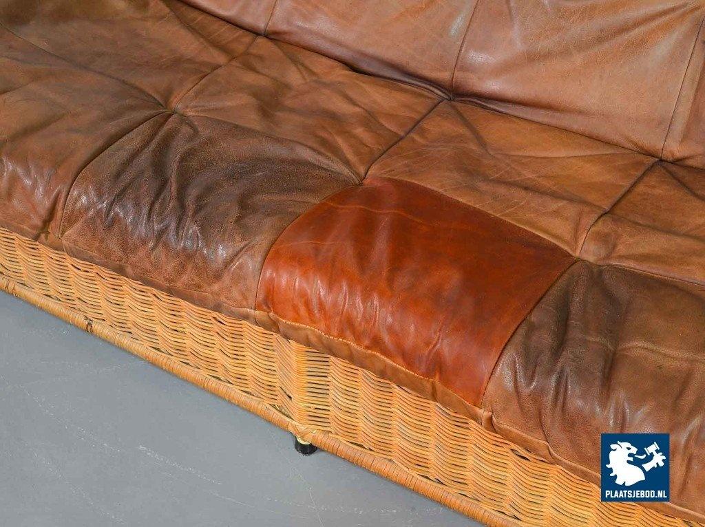 This very comfortable mid-century ‘Rock’ style sofa is attributed to Gerard van de Berg for Montis. The seating part with two headrest leather cushions is placed in a fancy cane frame. The patchwork leather shows a very nice patine. However one of the leather parts (on the front) has been professionally renewed, the sofa is in a well preserved condition with some wear consistent its age and use. The origin of this authentic 2-seater is Dutch and is manufactured in the 1970s. The sofa with its Bohemian look fits perfectly in an eclectic setting. Dimensions: Height: 110 cm, Width: 155 cm, Depth: 74 cm, Quantity: 1