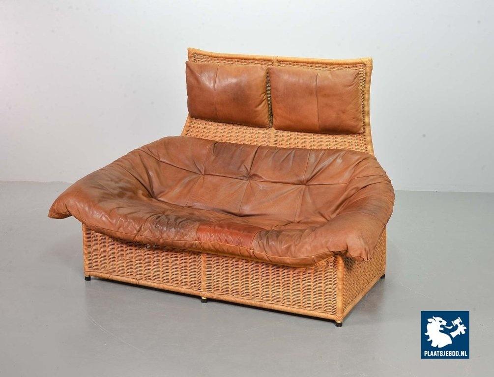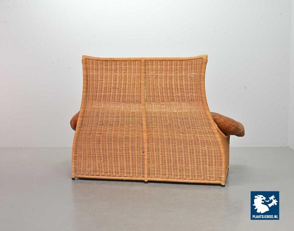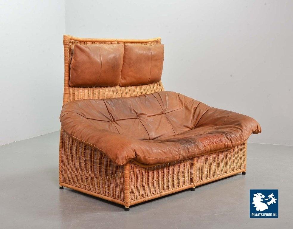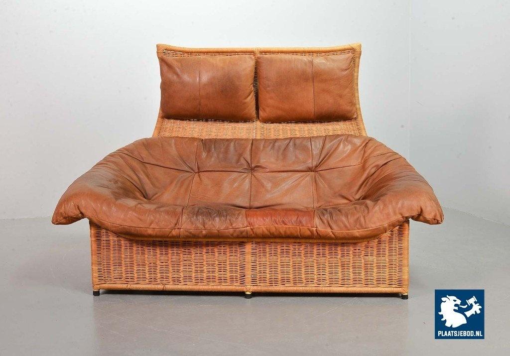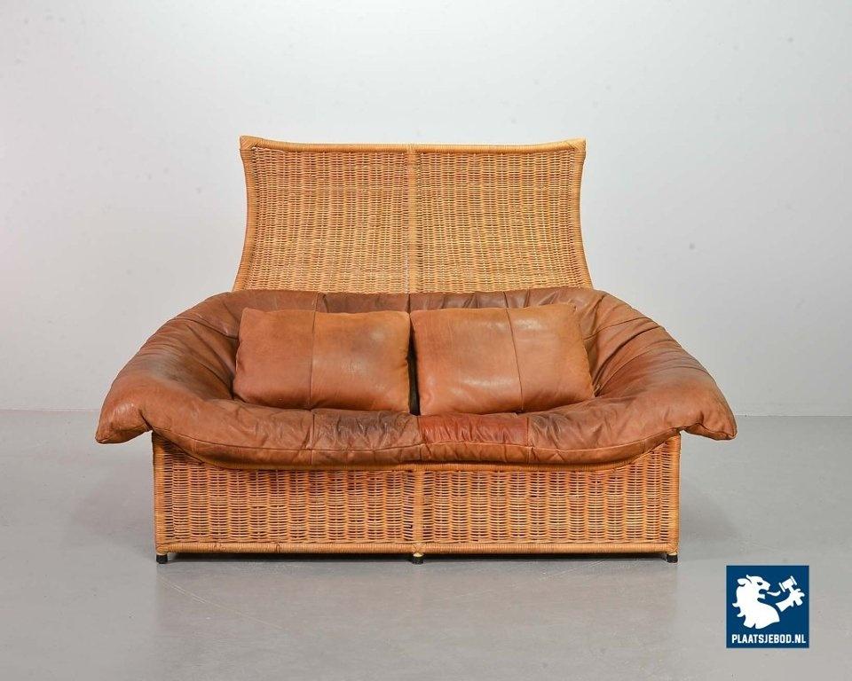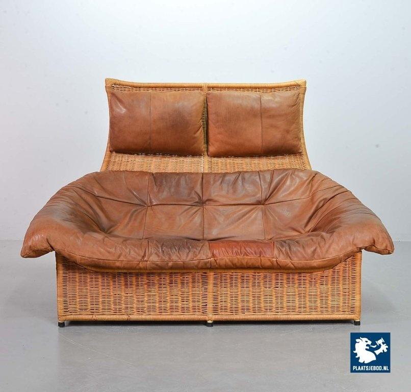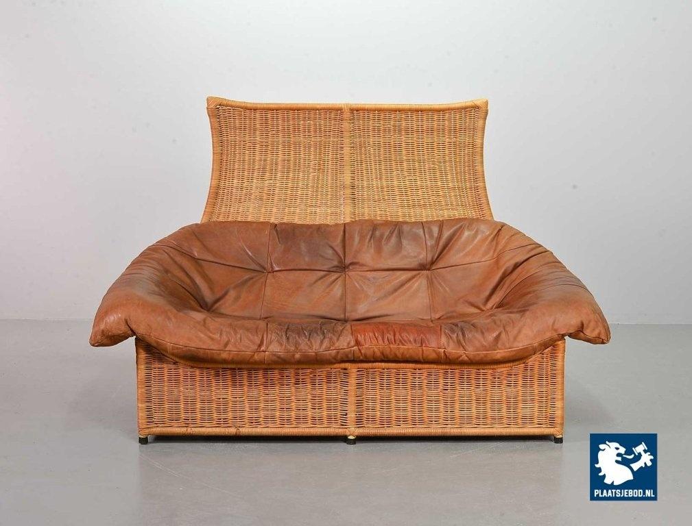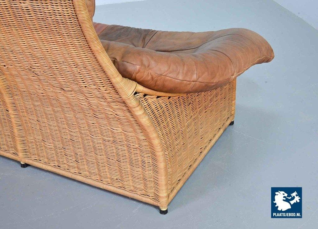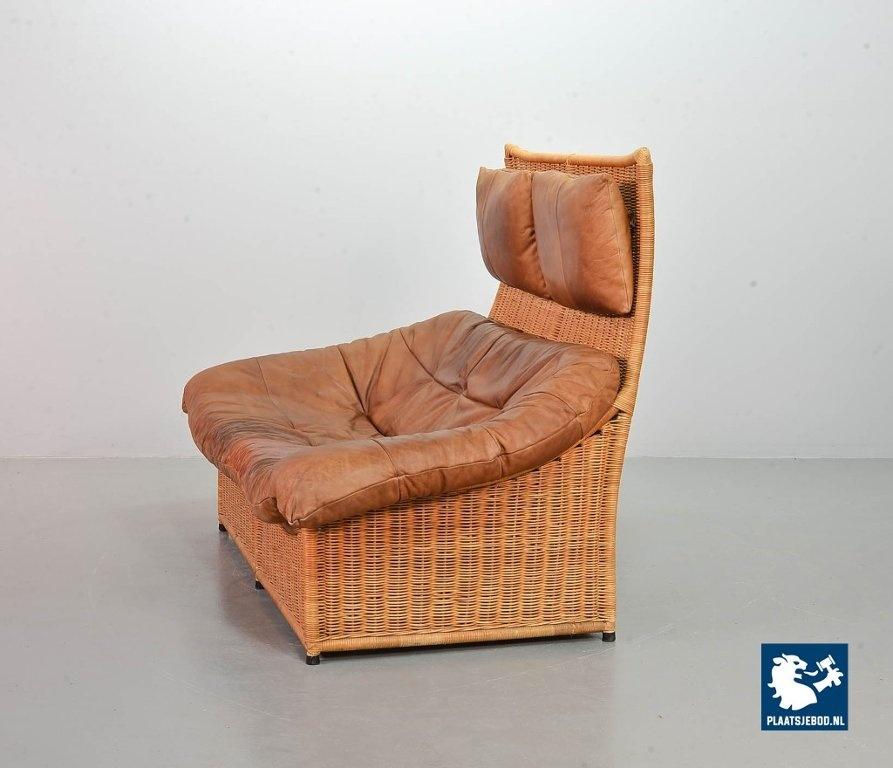 This very comfortable mid-century ‘Rock’ style sofa is attributed to Gerard van de Berg for Montis. The seating part with two headrest leather cushions is placed in a fancy cane frame. The patchwork leather shows a very nice patine. However one of the leather parts (on the front) has been professionally renewed, the sofa is in a well preserved condition with some wear consistent its age and use. The origin of this authentic 2-seater is Dutch and is manufactured in the 1970s. The sofa with its Bohemian look fits perfectly in an eclectic setting. Dimensions: Height: 110 cm, Width: 155 cm, Depth: 74 cm, Quantity: 1