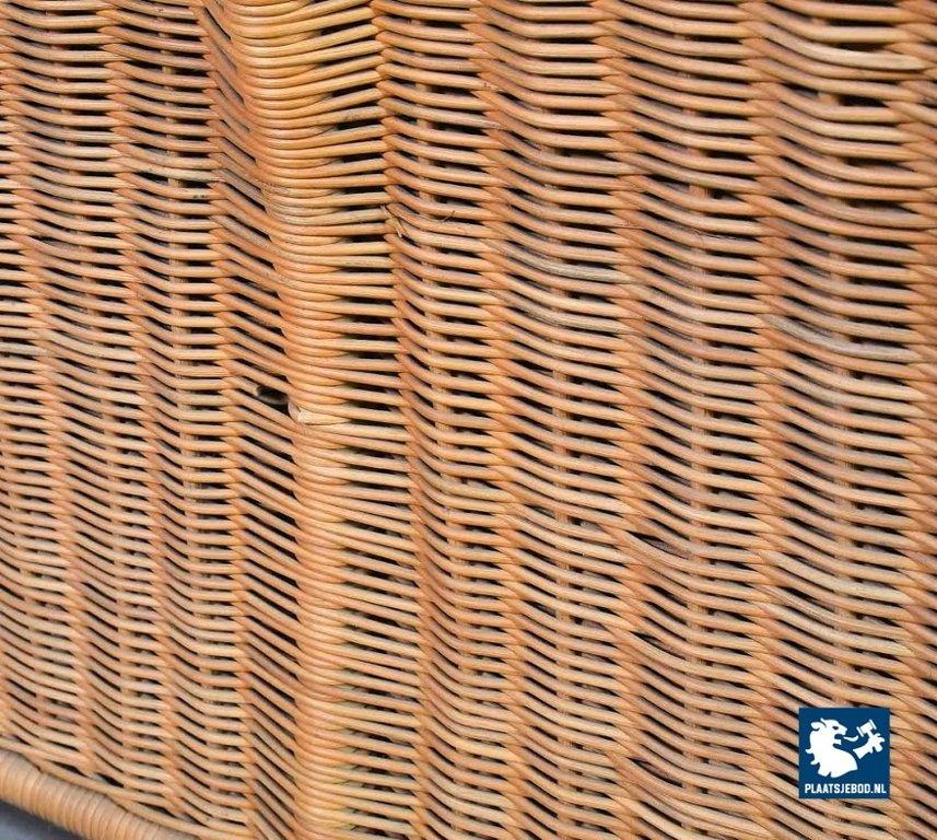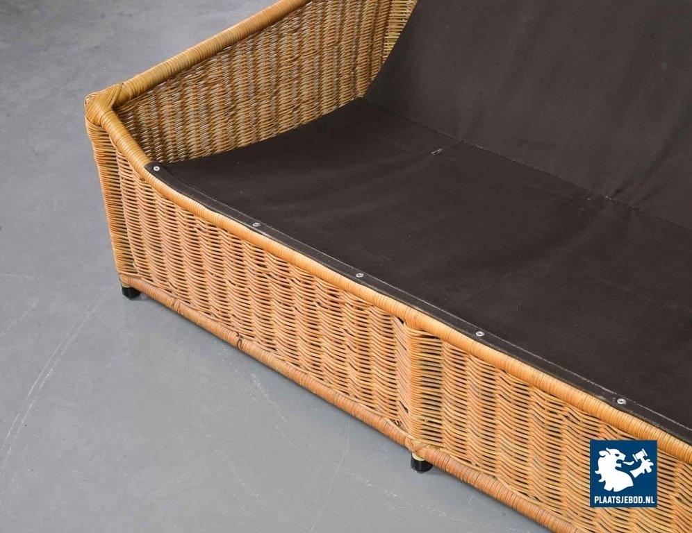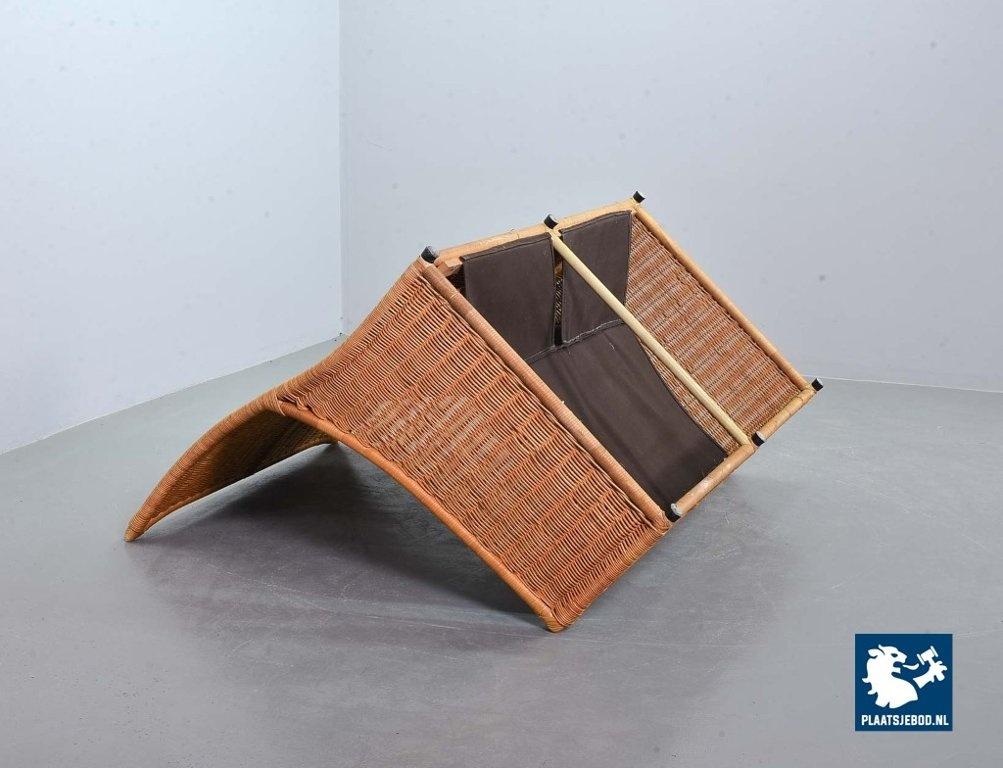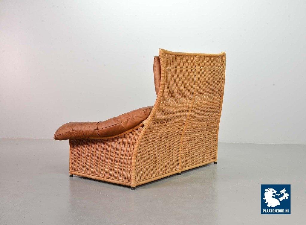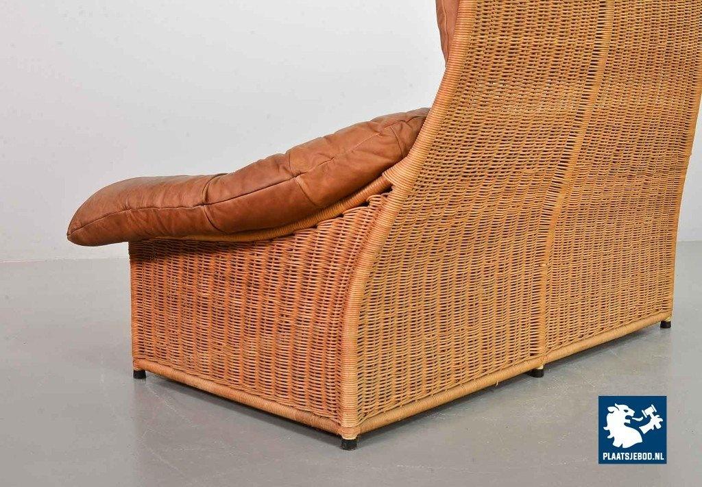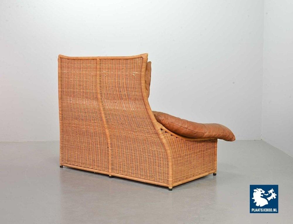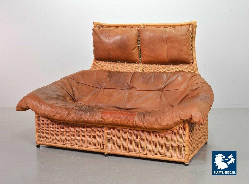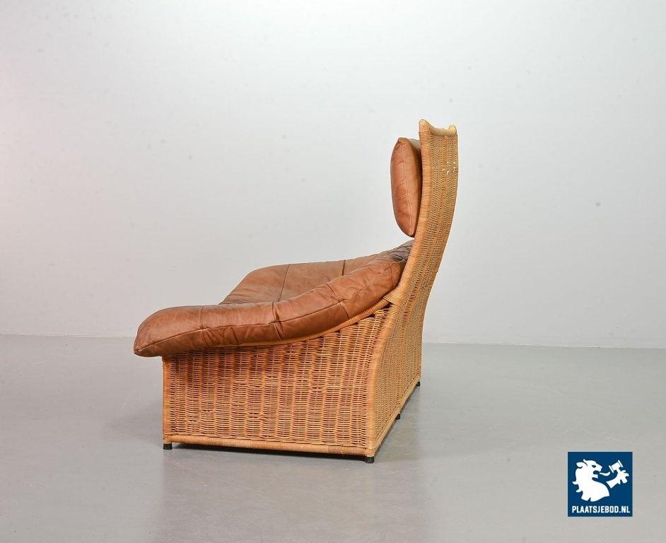 This very comfortable mid-century ‘Rock’ style sofa is attributed to Gerard van de Berg for Montis. The seating part with two headrest leather cushions is placed in a fancy cane frame. The patchwork leather shows a very nice patine. However one of the leather parts (on the front) has been professionally renewed, the sofa is in a well preserved condition with some wear consistent its age and use. The origin of this authentic 2-seater is Dutch and is manufactured in the 1970s. The sofa with its Bohemian look fits perfectly in an eclectic setting. Dimensions: Height: 110 cm, Width: 155 cm, Depth: 74 cm, Quantity: 1