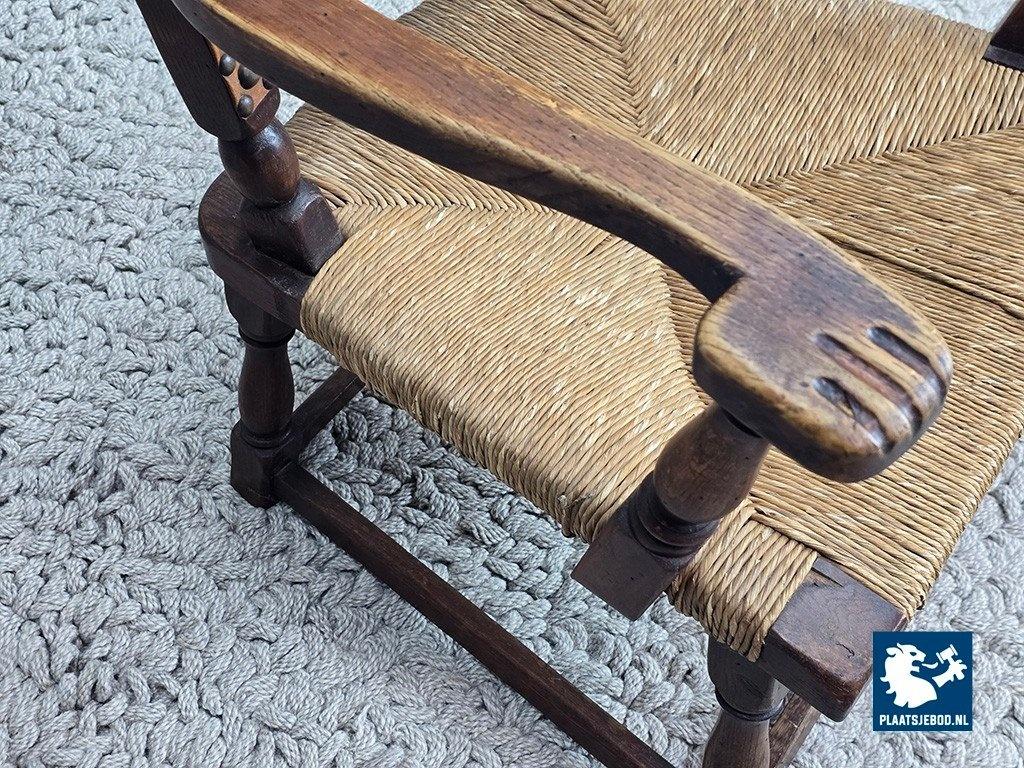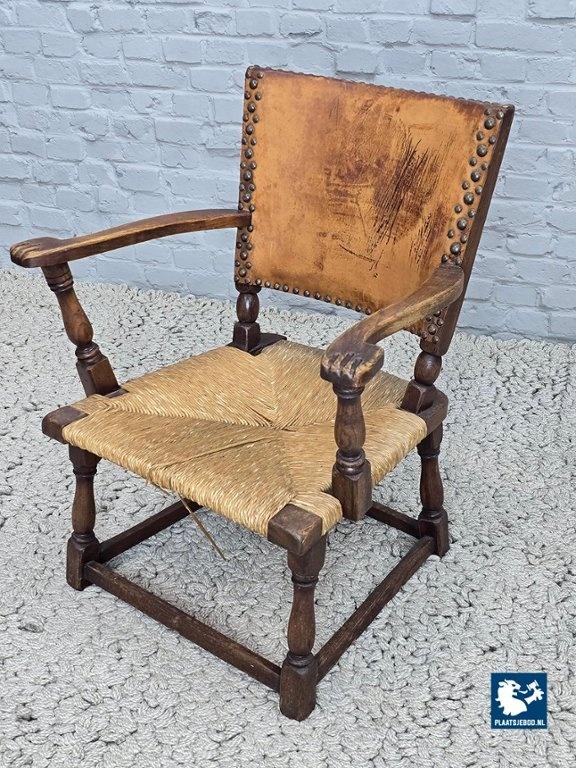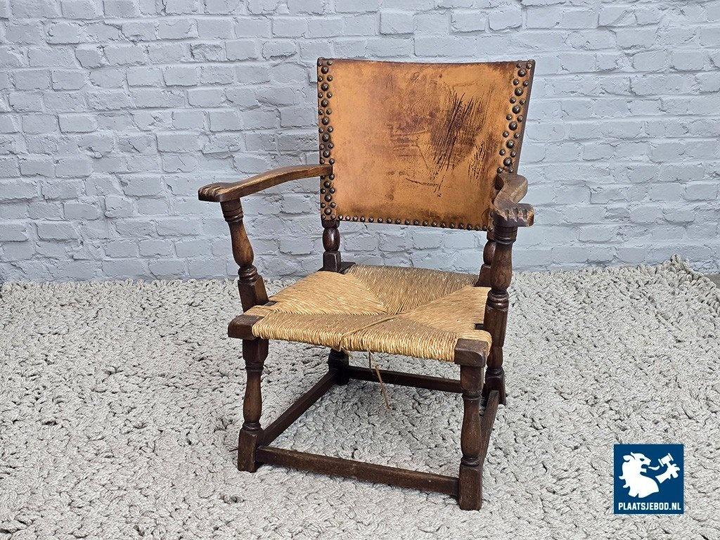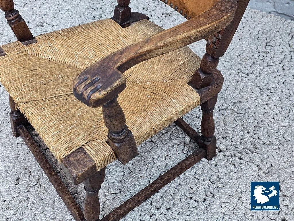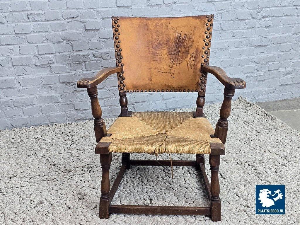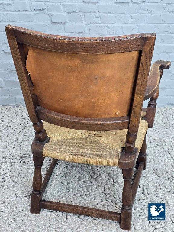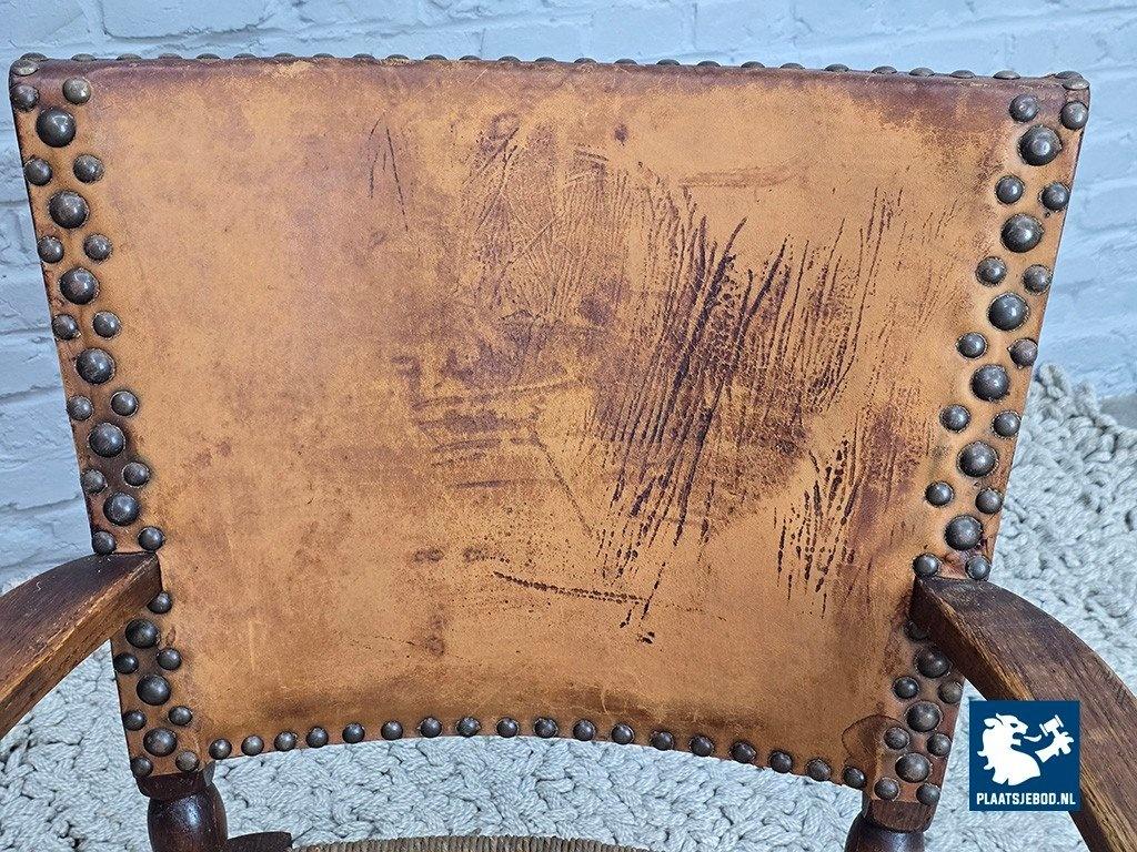 Rare armchair model F297 designed by Theo Ruth for Artifort in 1949. This sculptural chair features a solid oak frame with block-turned legs and arms, a rattan seat, and a natural leather backrest secured with brass nails. The carved armrests show subtle baroque influences, while the overall design balances modernism with rustic and brutalist characteristics. The oak displays a beautiful grain structure, and the leather has developed a deep, authentic patina. A highly collectible Dutch design classic in excellent original condition. Dimensions: Height 84 Width 68 Depth 53 cm.