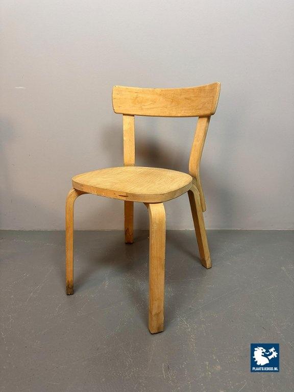 Authentic set of four first-edition Alvar Aalto Model 69 dining chairs with nice patina, produced by Artek Finland. Originally designed in 1935, this set dates from the 1950s and features beautifully executed bentwood construction. A notable detail is the visible wood joint in the seat, confirming the early production period. These chairs are in good vintage condition and embody Aalto’s timeless philosophy: organic form, functionality, and human warmth. This unique set is in a fair condition, showing signs of wear consistent its age and use. Dimensions: Height: 73 cm, Width: 40 cm, Depth: 50 cm, Seating Height: 43.5 cm