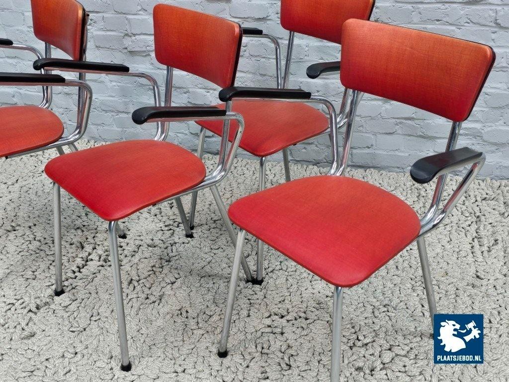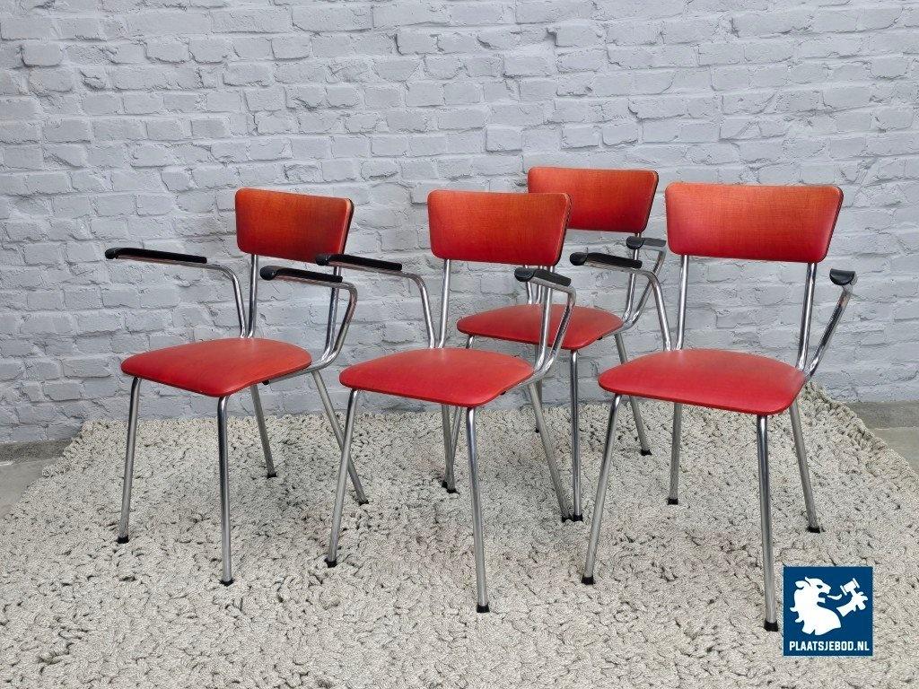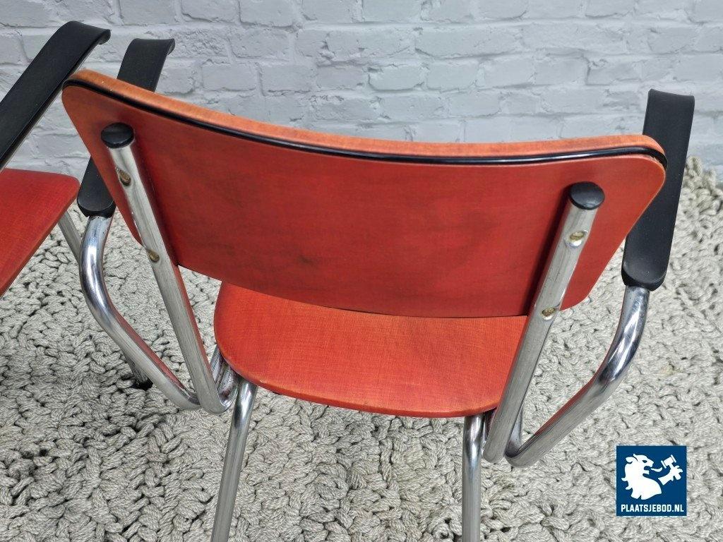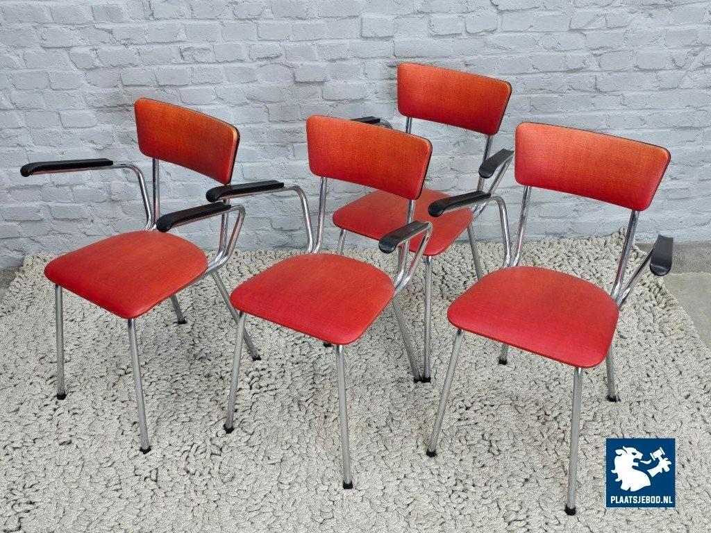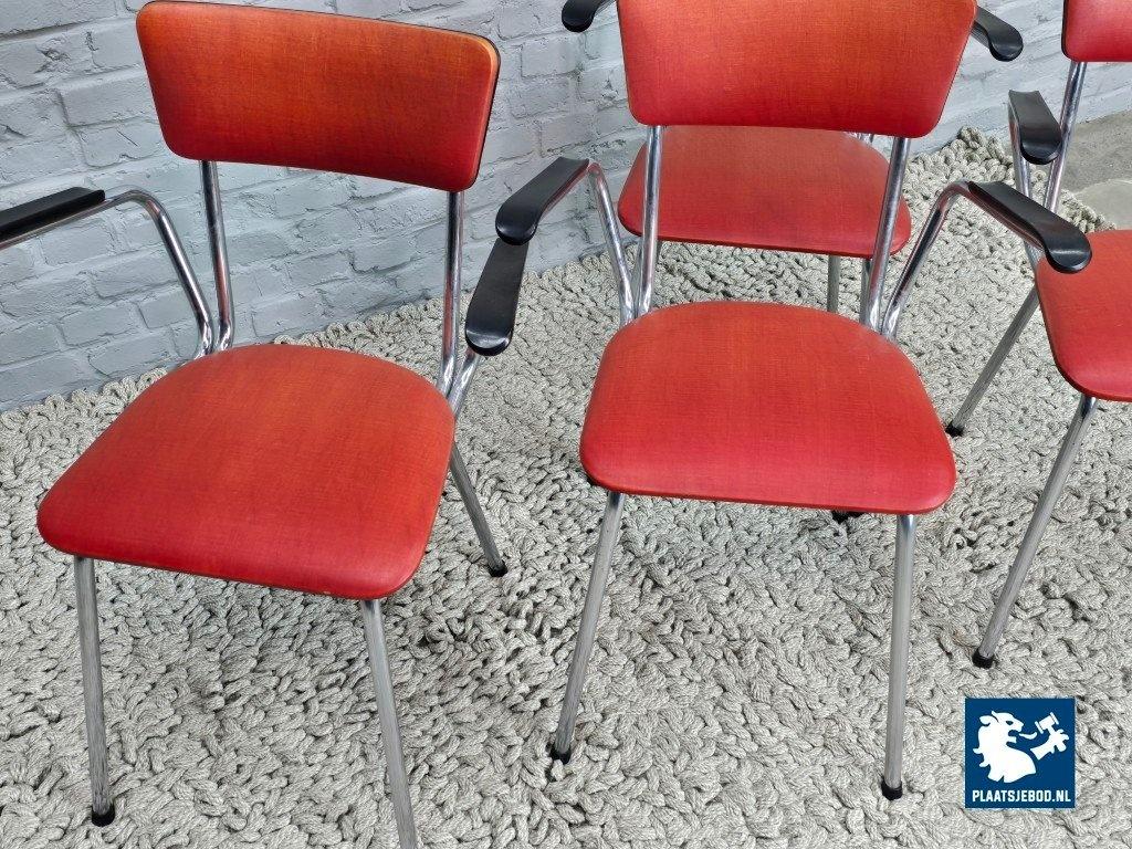 The seats and backs are upholstered in red leatherette, paired with black bakelite armrests, adding a cheerful and practical mid-century character. Black plastic caps protect the feet and underline the utilitarian design typical of Dutch kitchen furniture from this period.