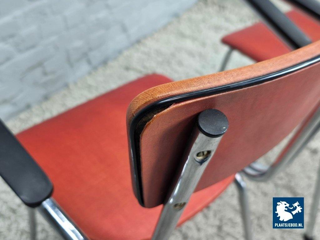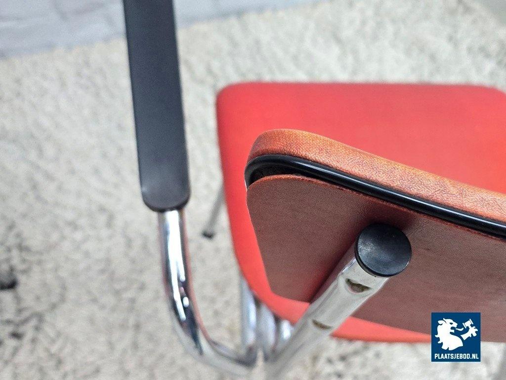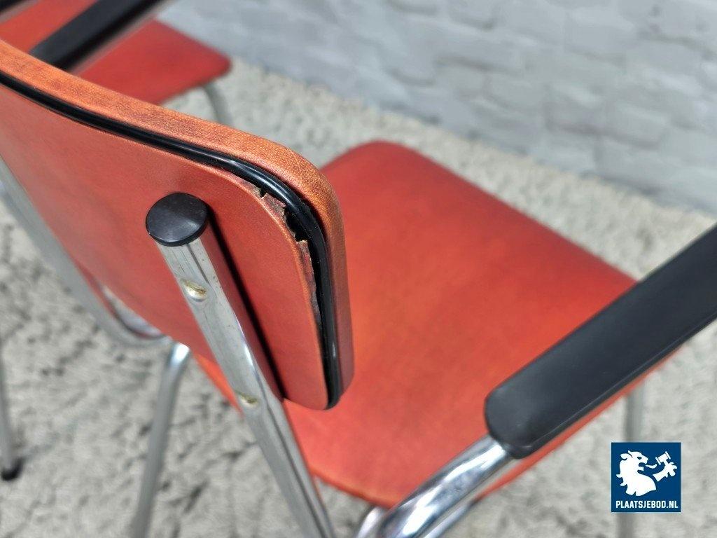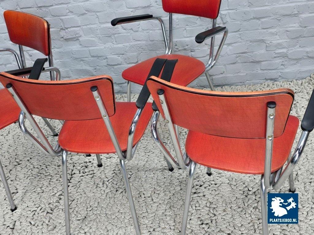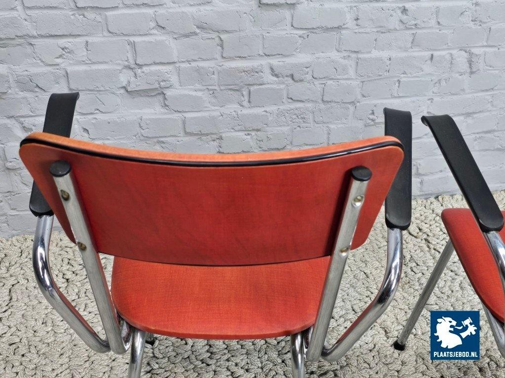 The seats and backs are upholstered in red leatherette, paired with black bakelite armrests, adding a cheerful and practical mid-century character. Black plastic caps protect the feet and underline the utilitarian design typical of Dutch kitchen furniture from this period.