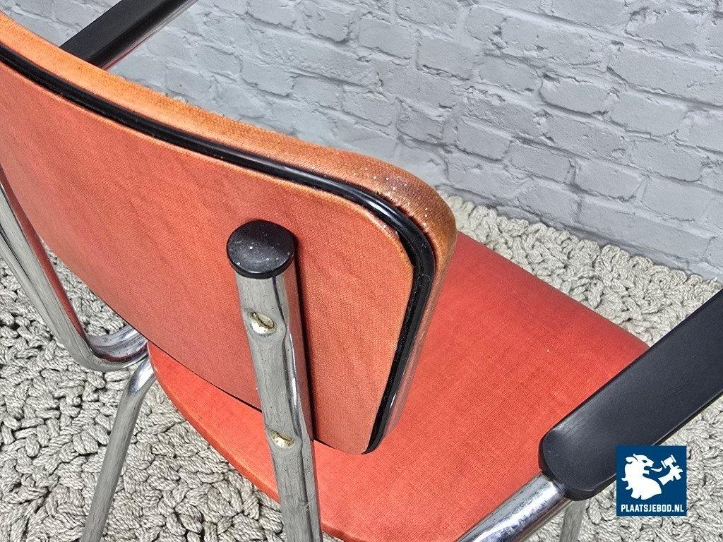 Set of four vintage design kitchen chairs produced in The Netherlands during the 1960s. The chairs feature chromed tubular steel frames with a distinctive construction in which the armrests are formed from the bent frame and continue downward beneath the seat, creating a clean and functional silhouette.