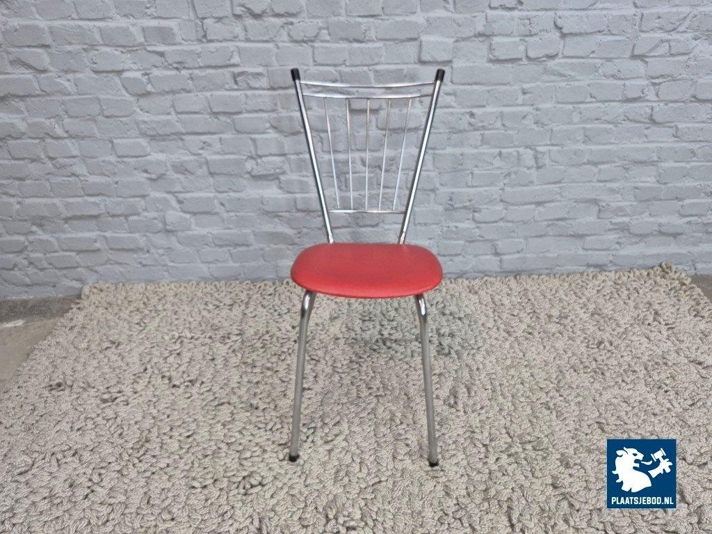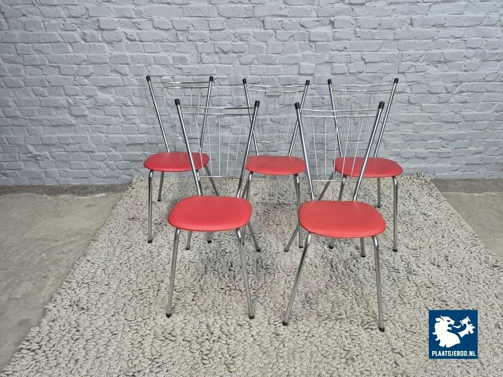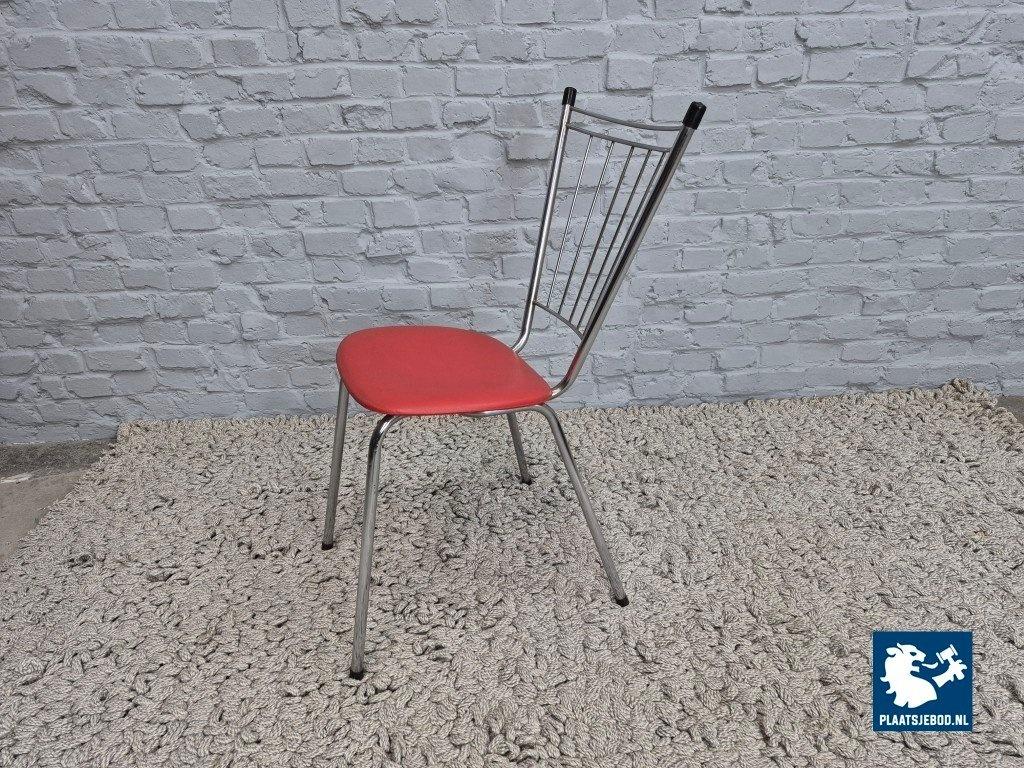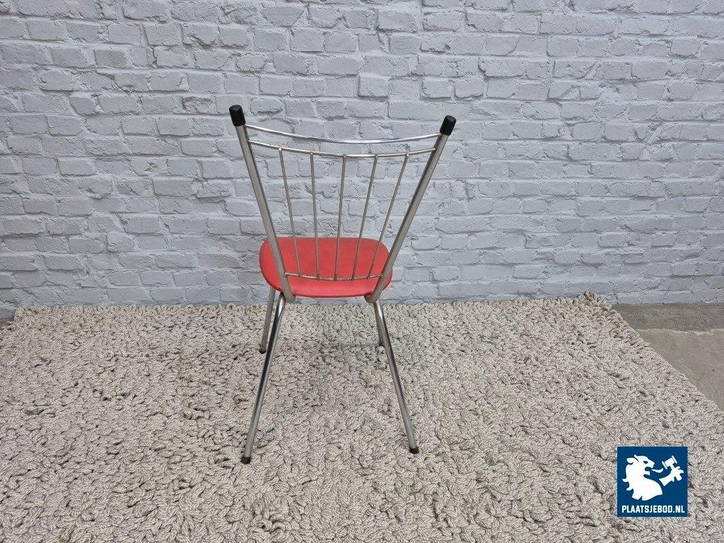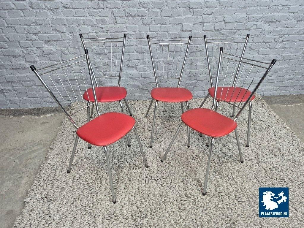 Set of four vintage design kitchen chairs produced in The Netherlands during the 1960s. The chairs feature chromed tubular steel frames with distinctive metal spindle backrests, combined with red leatherette upholstered seats.