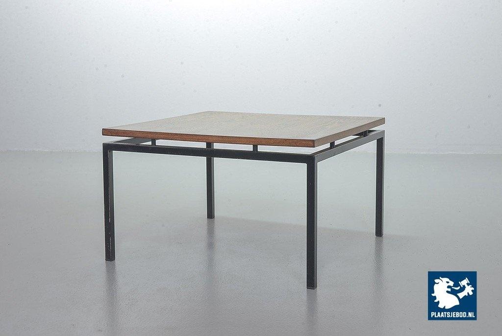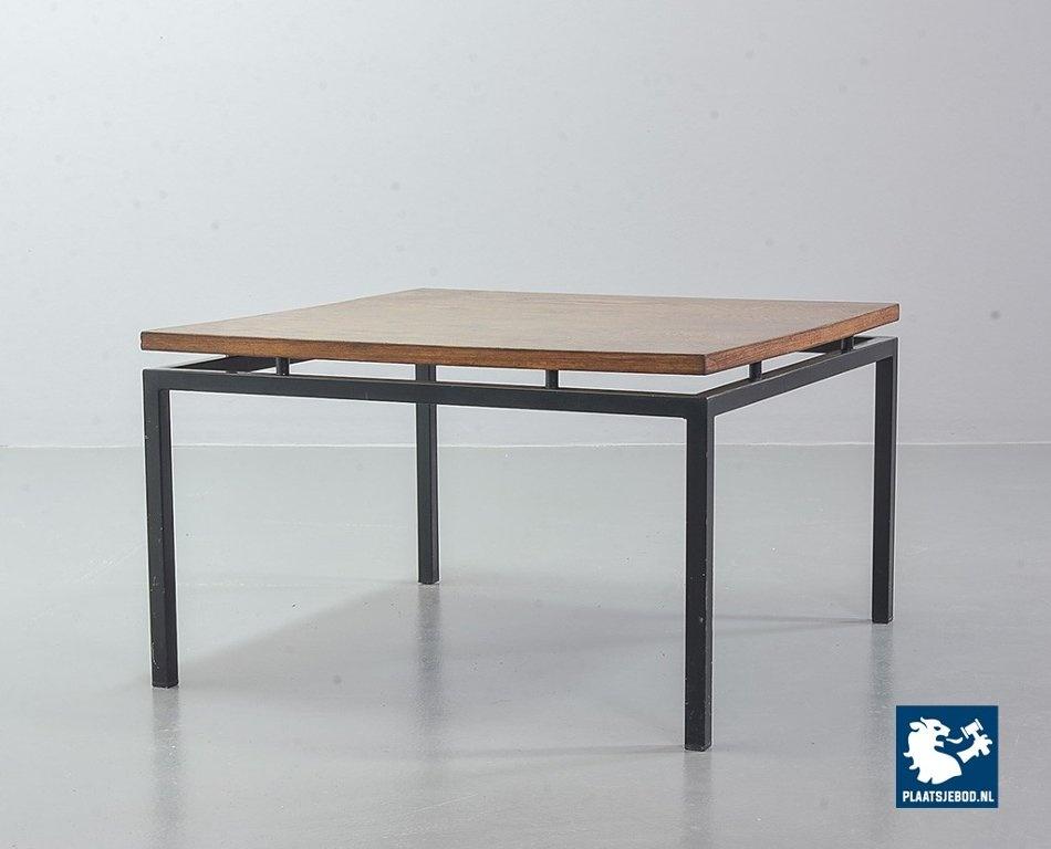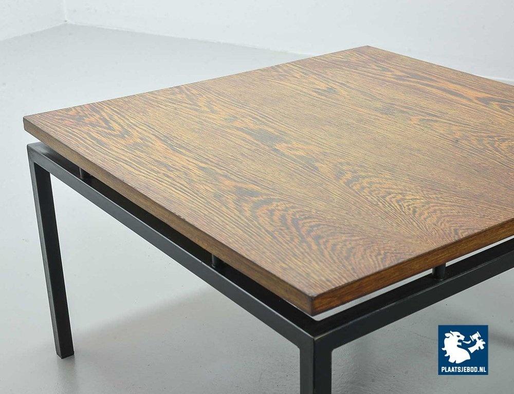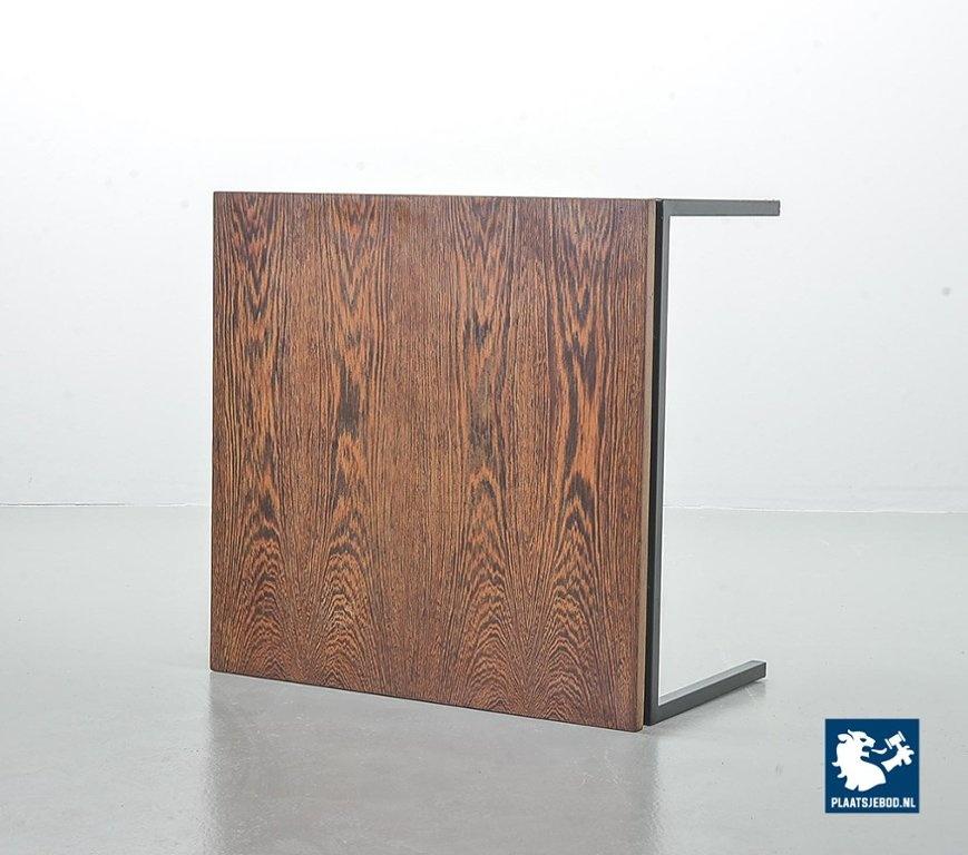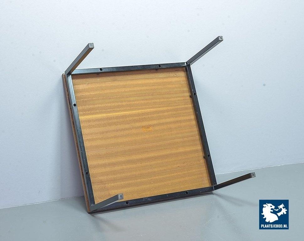 Square Dutch Design wengé coffee table with steel black frame. Designed in the style of Martin Visser / Coen de Vries. Manufactured by Stiemsma, The Netherlands in the 1950s. The solid wengé table top of this minimalistic mid-century modern design seems to float. The ‘Stiemsma’ branded table is in a over all good condition, with minor wear on the black steel frame consistent its age and use. Dimensions: Height: 36 cm, Width: 60 cm, Depth: 60 cm, Quantity: 1