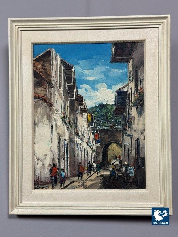 This painting stands as a pleasant and approachable example of mid-20th-century Ecuadorian figurative painting, offering insight into daily urban life through a lively and informal painterly execution. Dimensions Frame: Height 51 Width 42 cm. Visual: Height 38 Width 29 cm.