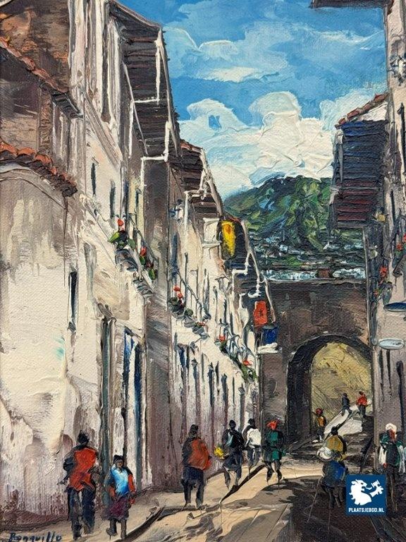 Lot 311-229-PF031-S3: Street Scene in Quito by Mario Ronquillo, Oil on Canvas, Ecuador, 1970s.