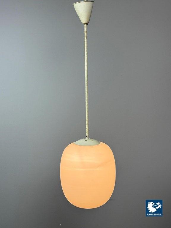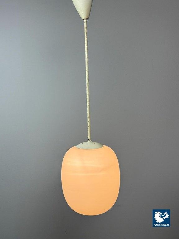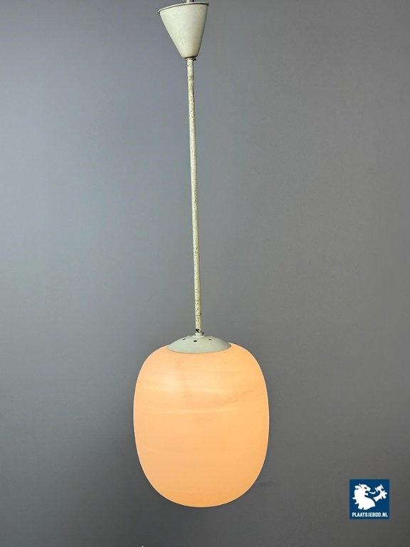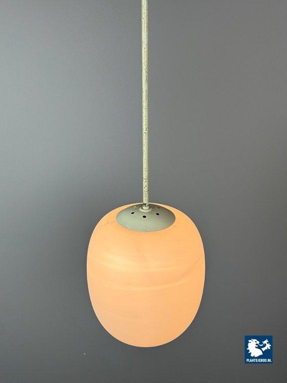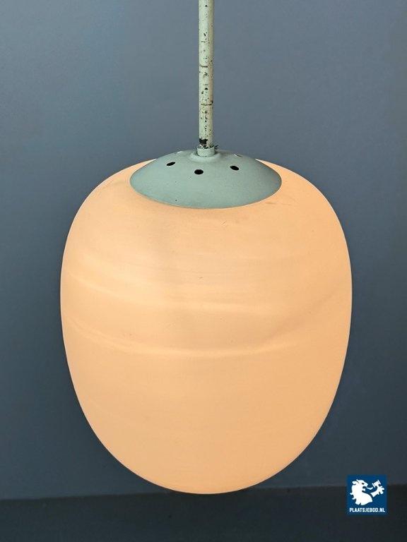 Tall Mid-Century Design Philips Industrial Pendant with Big White Oval Frosted Glass Ball, Netherlands, 1950s. Classic tall industrial pendant attributed to Philips, produced in the 1950s. This timeless design features an oval white frosted opaline glass shade suspended from a metal rod, exemplifying Philips’ focus on functional yet elegant lighting solutions during the mid-century period. Widely used in public buildings, offices, and modernist interiors, Philips lighting from this era is highly regarded for its quality and restrained design language. In good vintage condition. Dimensions: Total height 100 cm Height Glass 33 Diameter 28 cm