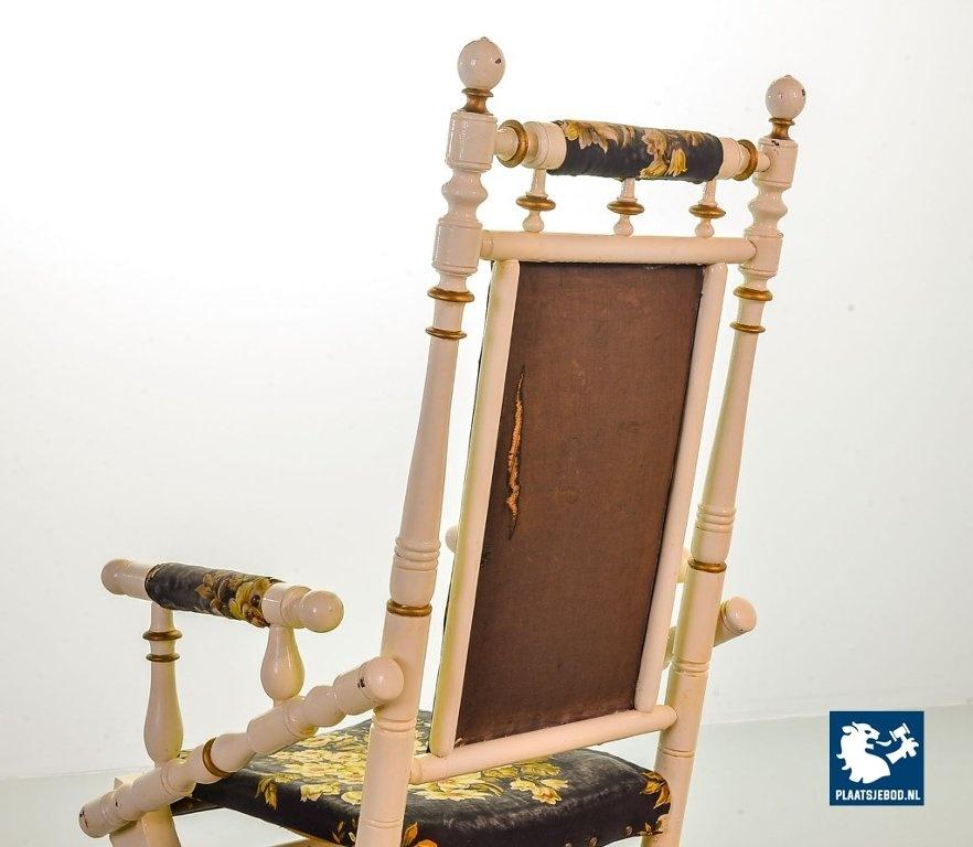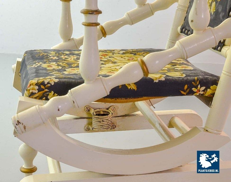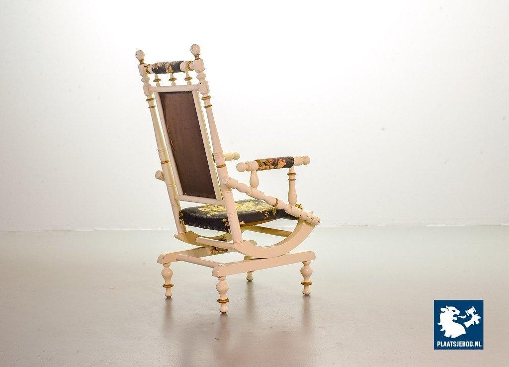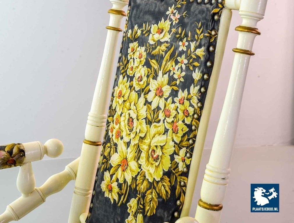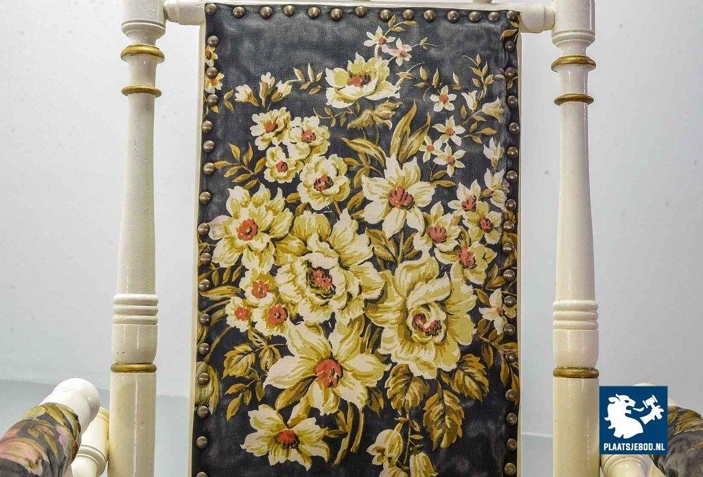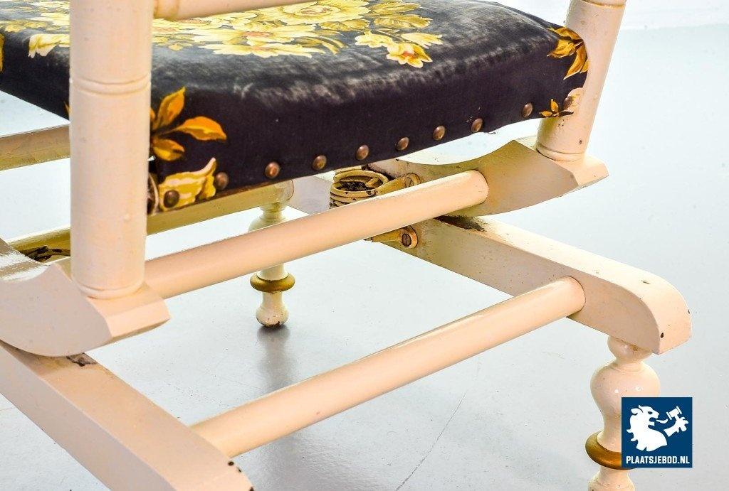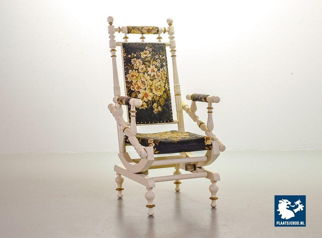 Authentic Victorian style Dexter coil spring spooled platform rocking chair. The white and gold lacquered wooden frame is upholstered with a jolly white flower design on a black backgrond. Presumably the chair is from American origin. It's an eyecathing stand-alone piece of furniture that still rocks comfortably. Dimensions: Height: 118 cm, Width: 57 cm, Depth: 60 cm, Seat height: 44 cm, Armrest height: 68 cm, Quantity: 1