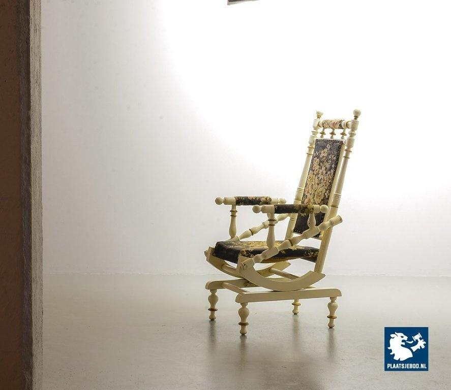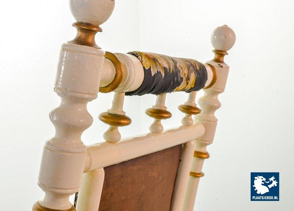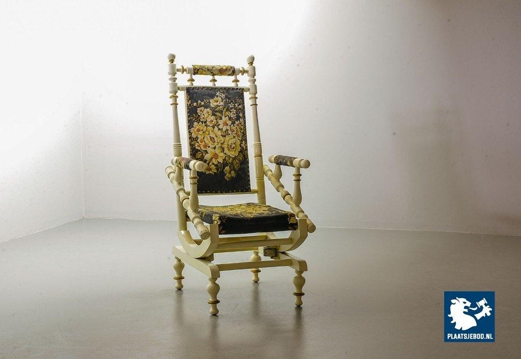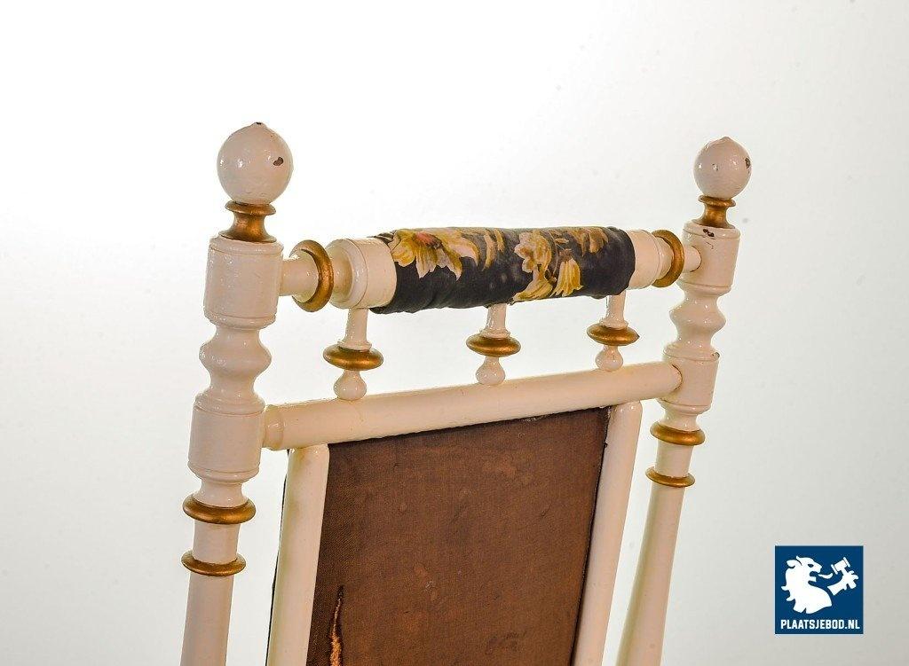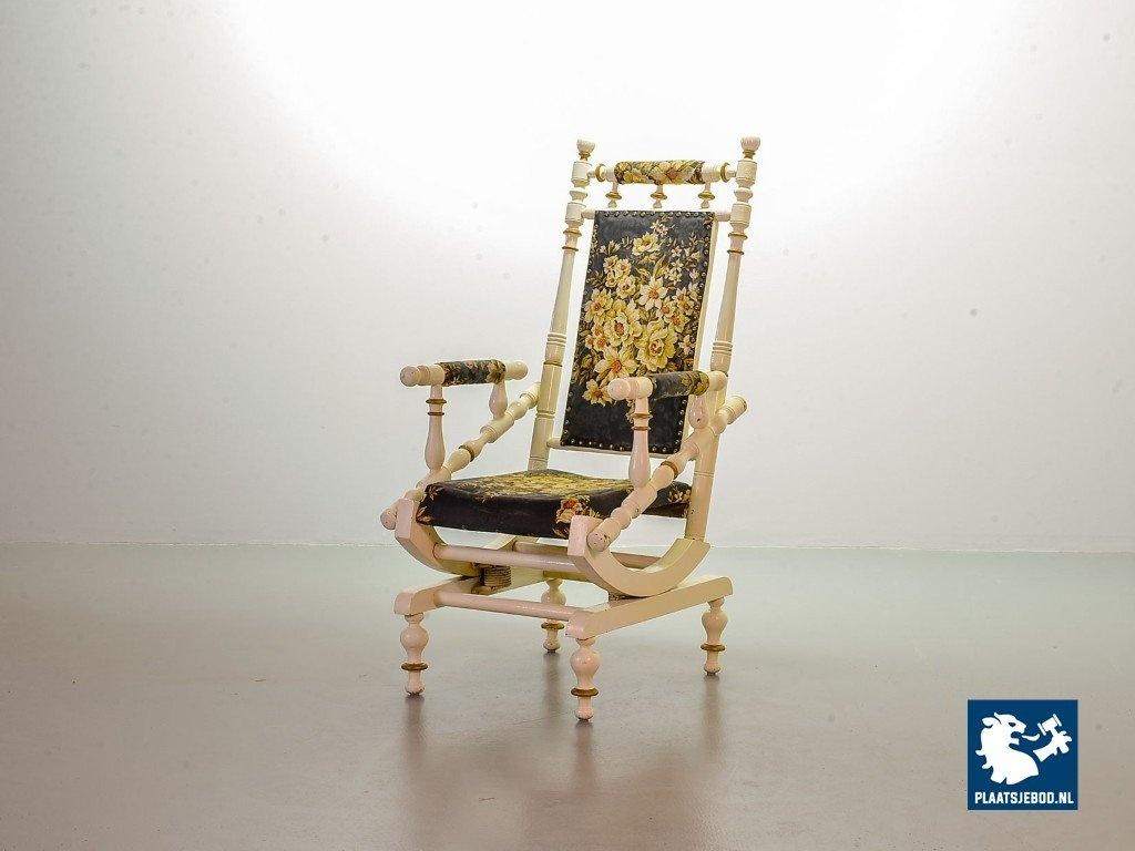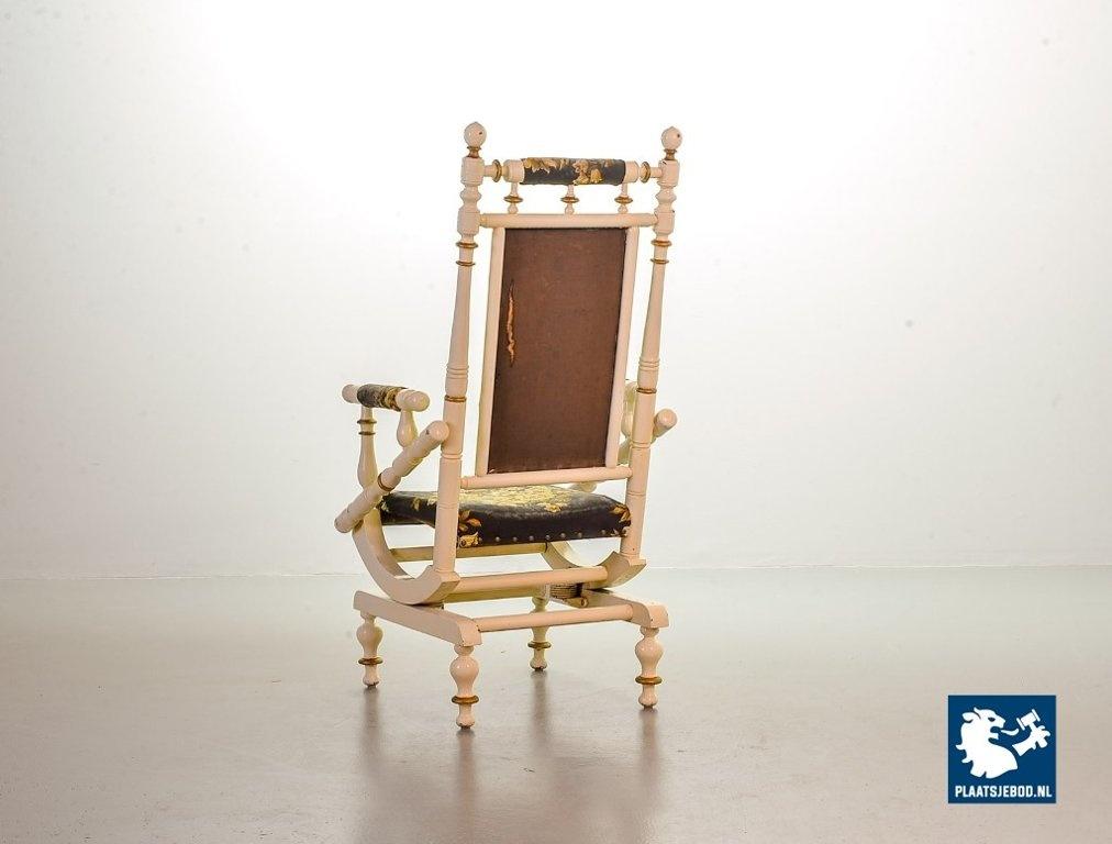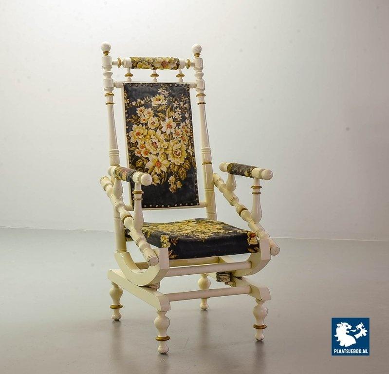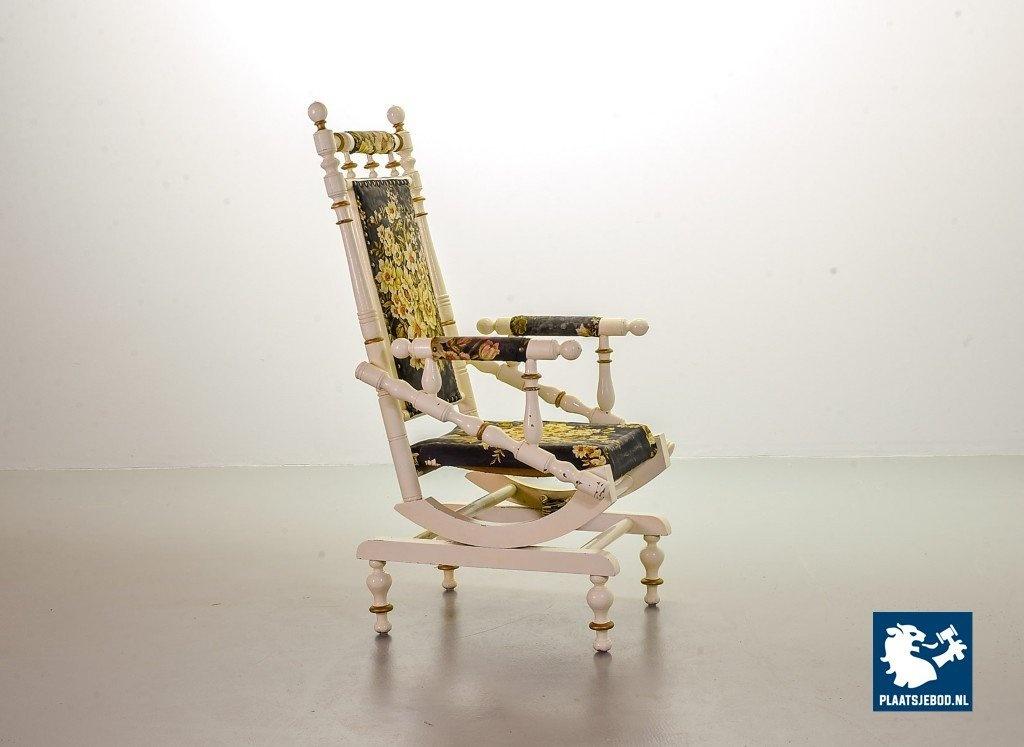 Authentic Victorian style Dexter coil spring spooled platform rocking chair. The white and gold lacquered wooden frame is upholstered with a jolly white flower design on a black backgrond. Presumably the chair is from American origin. It's an eyecathing stand-alone piece of furniture that still rocks comfortably. Dimensions: Height: 118 cm, Width: 57 cm, Depth: 60 cm, Seat height: 44 cm, Armrest height: 68 cm, Quantity: 1