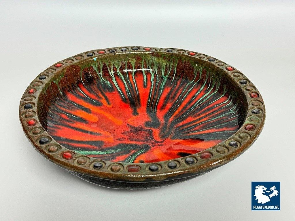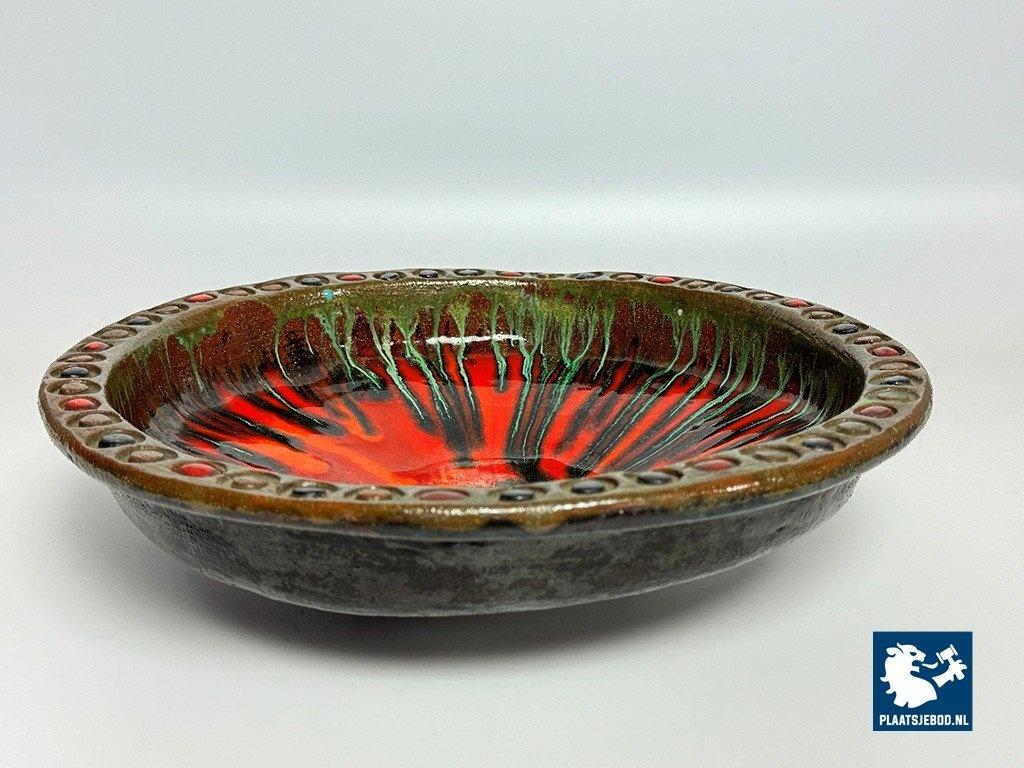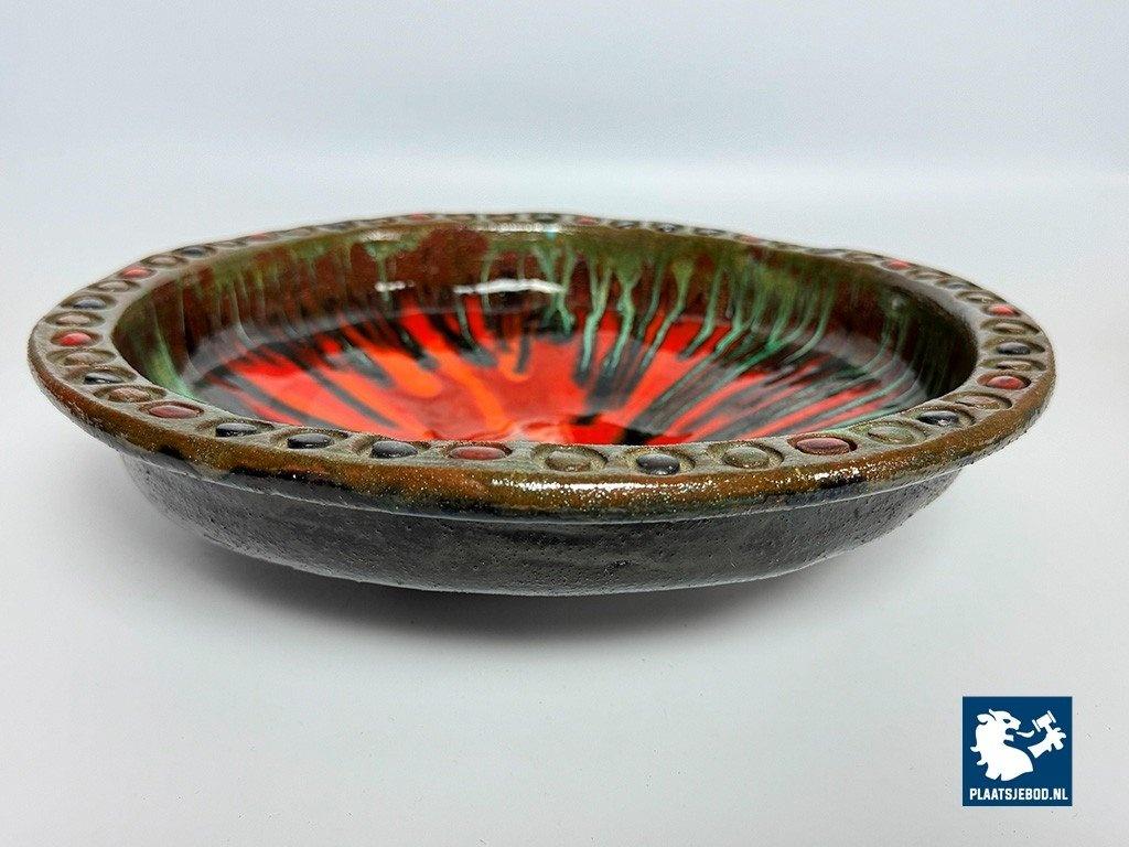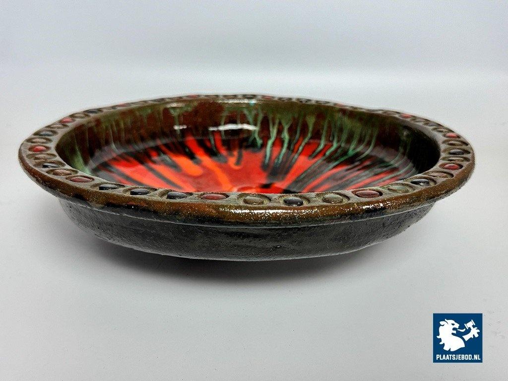 Vintage 1960s Handcrafted Ceramic Colorful Bowl by Kunstkeramiek Monasterium Berg Sinaï, Bruges, Belgium. This handcrafted bowl features, expressive colours and vibrant glazing that evoke mid-century style. Each detail reflects artisan craftsmanship. This piece is a striking decorative example of fine Belgiuan post-war ceramic art. Dimensions: Height 8,5 Diameter 30 cm.
