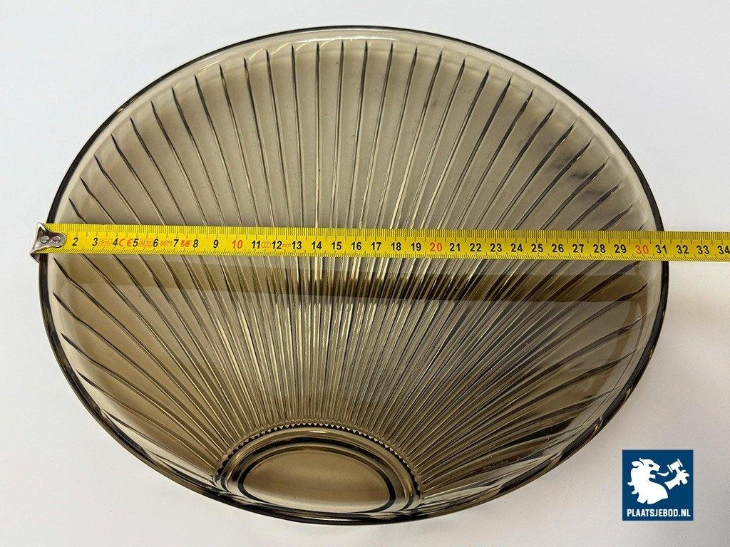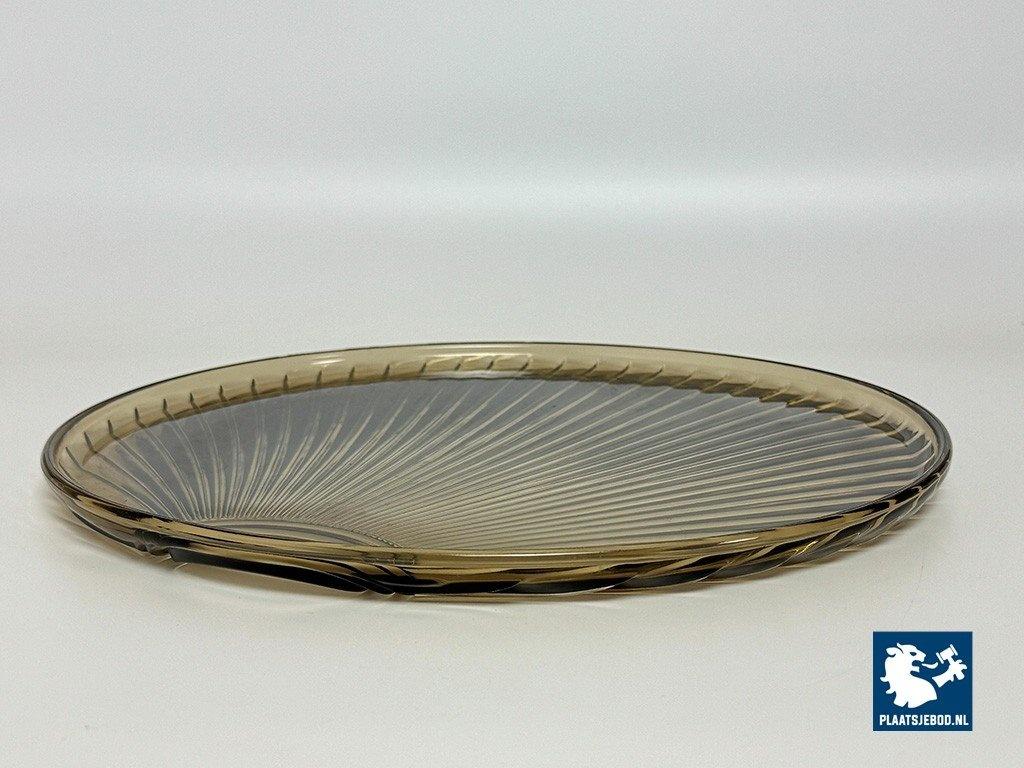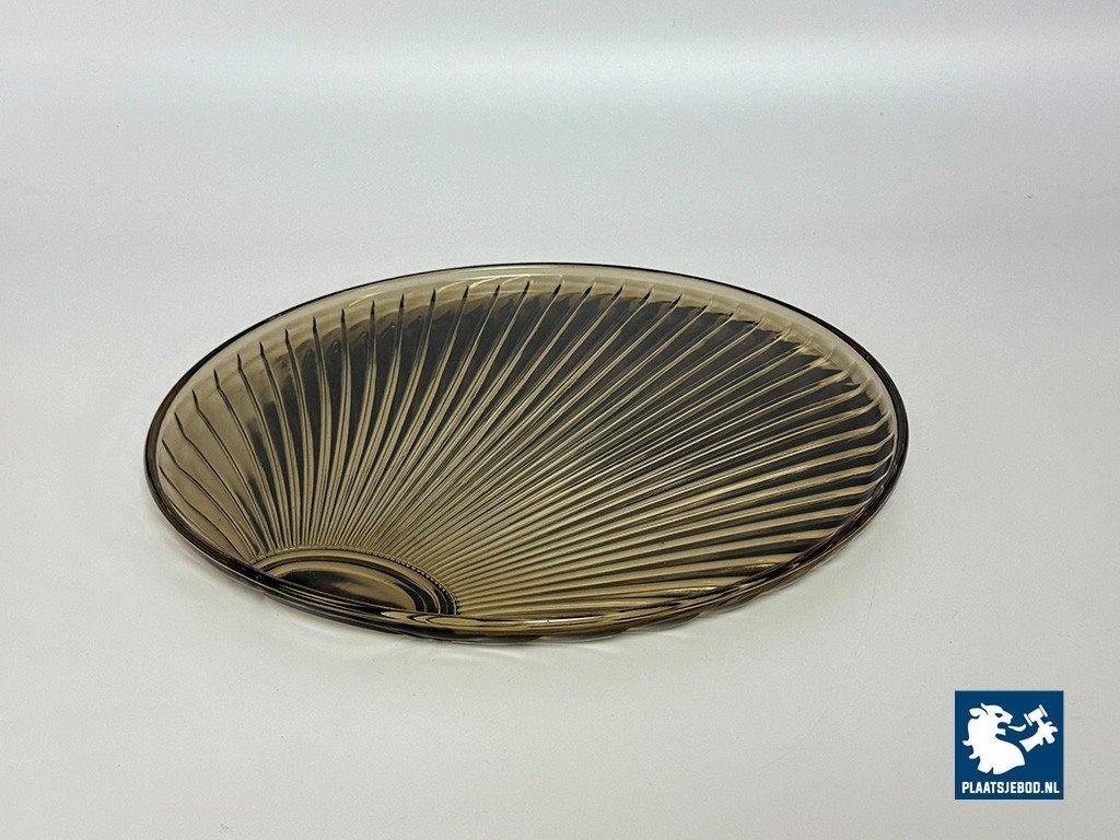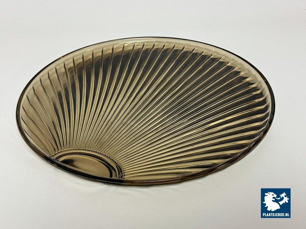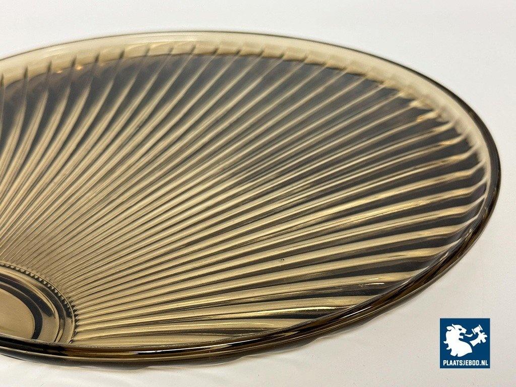 Vintage Belgian Amber Glass Round Baking Dish with Fan-Patterned Striping, Belgium 1960s. Dimensions Diameter 32 cm.