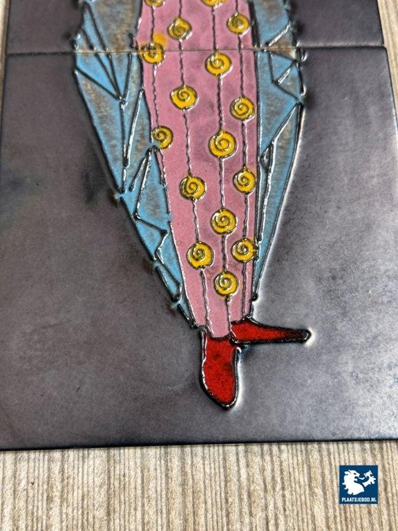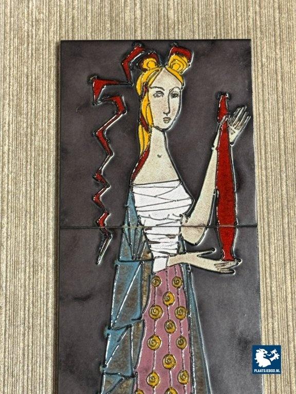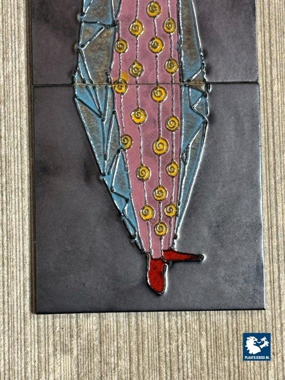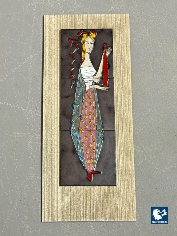 Vintage Ceramic Wall Plaquette with Folk Maiden in Traditional Costume, 1960s. A vibrant 1960s ceramic wall tile panel, featuring a woman in traditional attire with a flowing pink and turquoise robe highlighted with yellow accents holding a small red object,, rendered incharming relief with graphic seventies flair. Dimensions panel: L 60 x W 25,5 x Thcik 0,8 cm