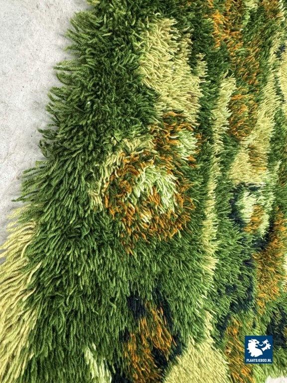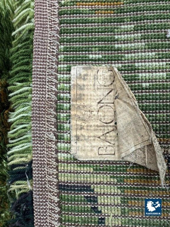 This striking vintage design shag rug was produced by BAJONG, a well-known Dutch rug manufacturer, and dates to the 1970s. Characterized by its deep, long pile and rich layered green palette, the rug features an abstract, almost camouflage-like pattern reminiscent of forest and army tones typical of the era. The rug is composed of two original BAJONG rugs (each approx. 130 × 185 cm) that were professionally joined, resulting in one generous and visually cohesive piece measuring approximately 185 × 260 cm. The seams are subtle and do not detract from the overall appearance or use. Made in the Netherlands, this rug perfectly reflects 1970s interior design trends, combining bold texture with earthy, organic coloration. It offers both strong visual impact and a soft, tactile surface, ideal for a living room, lounge, or statement interior. The carpet has been professionally cleaned and is in good vintage condition. Dimensions: 185 x 260 cm