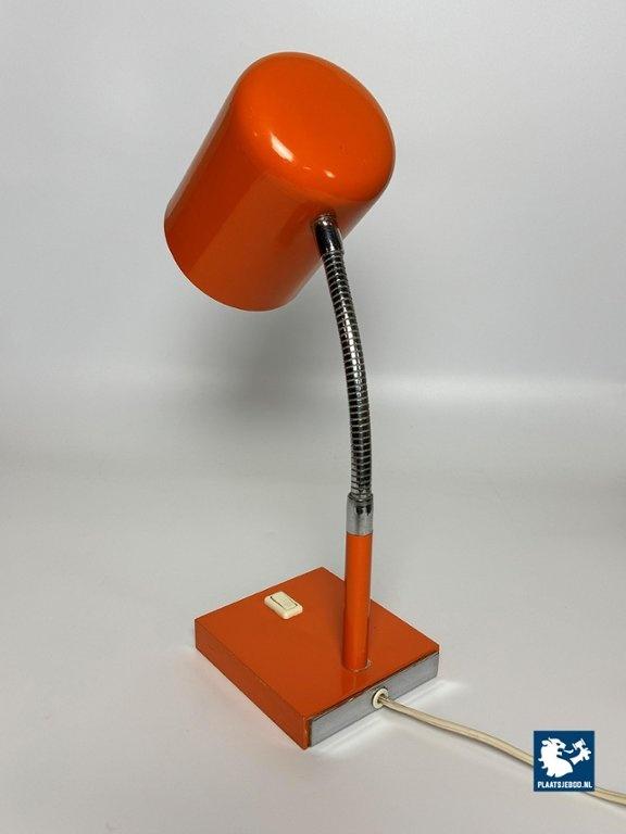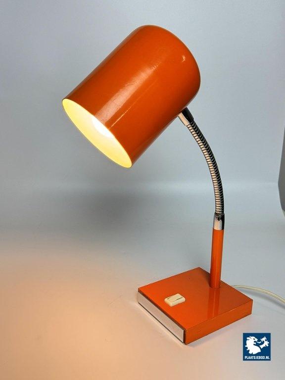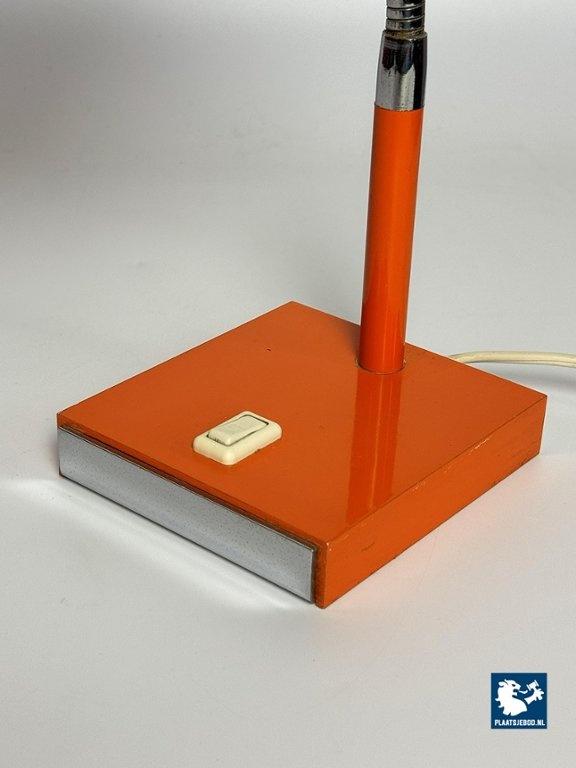 Vintage orange desk lamp from the 1970s, featuring a flexible metal gooseneck and a wide cylindrical metal shade. The lamp stands on a square base with an integrated on/off switch. A functional and playful example of late mid-century utilitarian design, well suited for a desk or studio environment. Dimensions: Height 42 Widht 25 cm