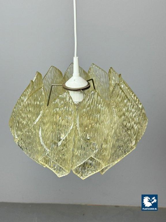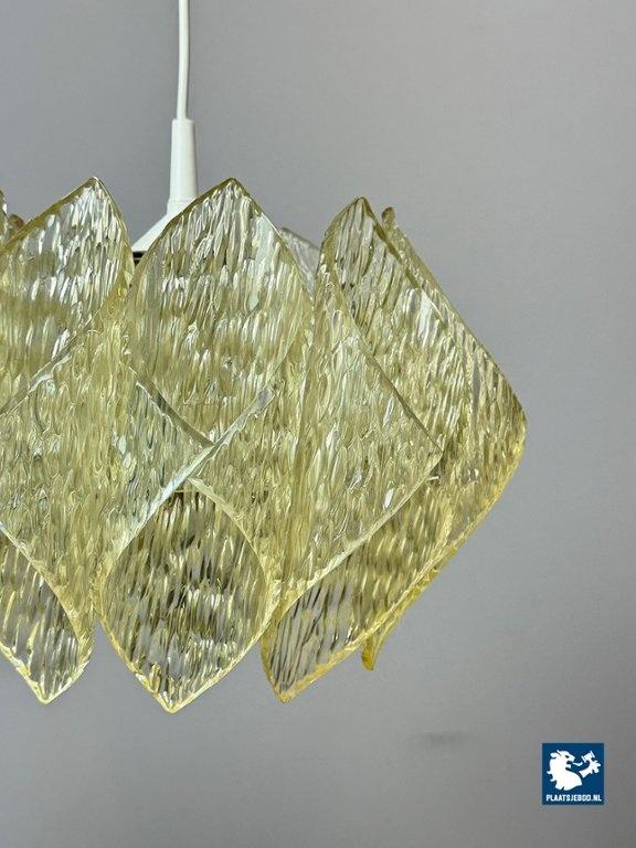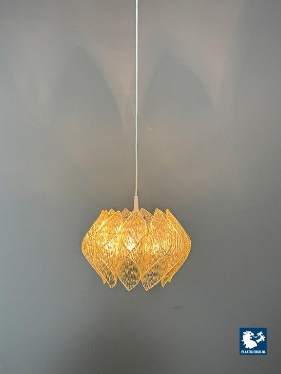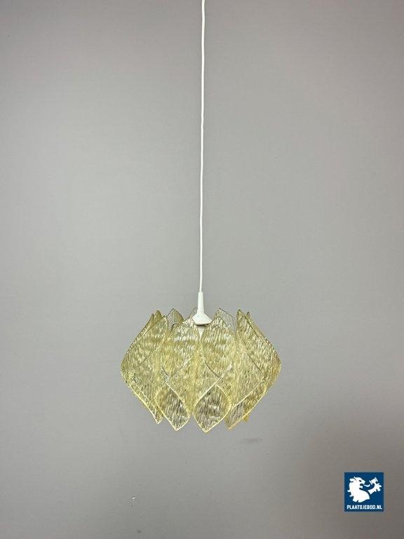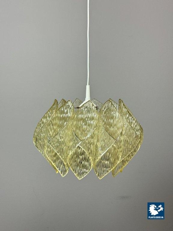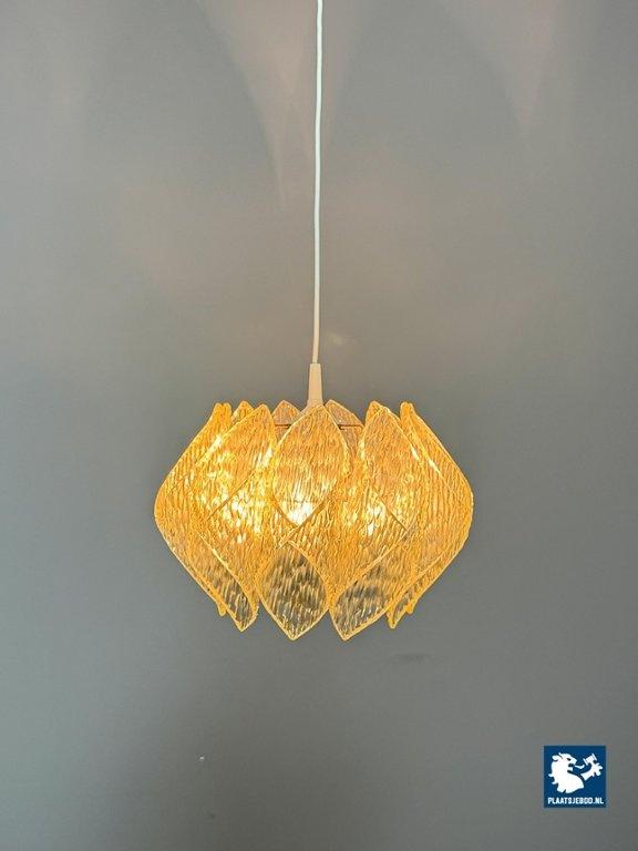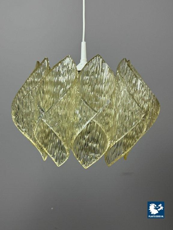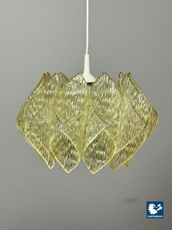 Transparent folded lucite pendant lamp produced by Marbach Leuchten in the 1970s. Made from so-called “sugar glass” acrylic, the lamp showcases a refined interplay of light and material. The warm golden reflections and sculptural form make it suitable for both modern and classic interiors. Despite its decorative appearance, the design remains clean and minimalist. In good vintage condition. Dimensions: Height 25 Diameter 36 cm