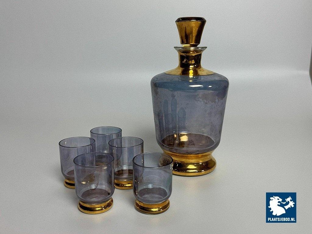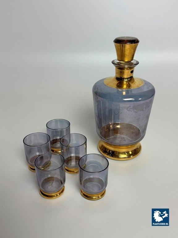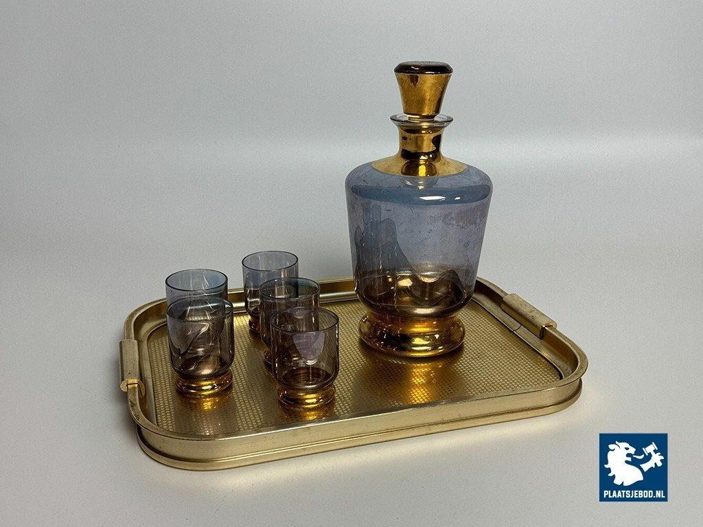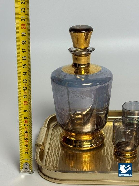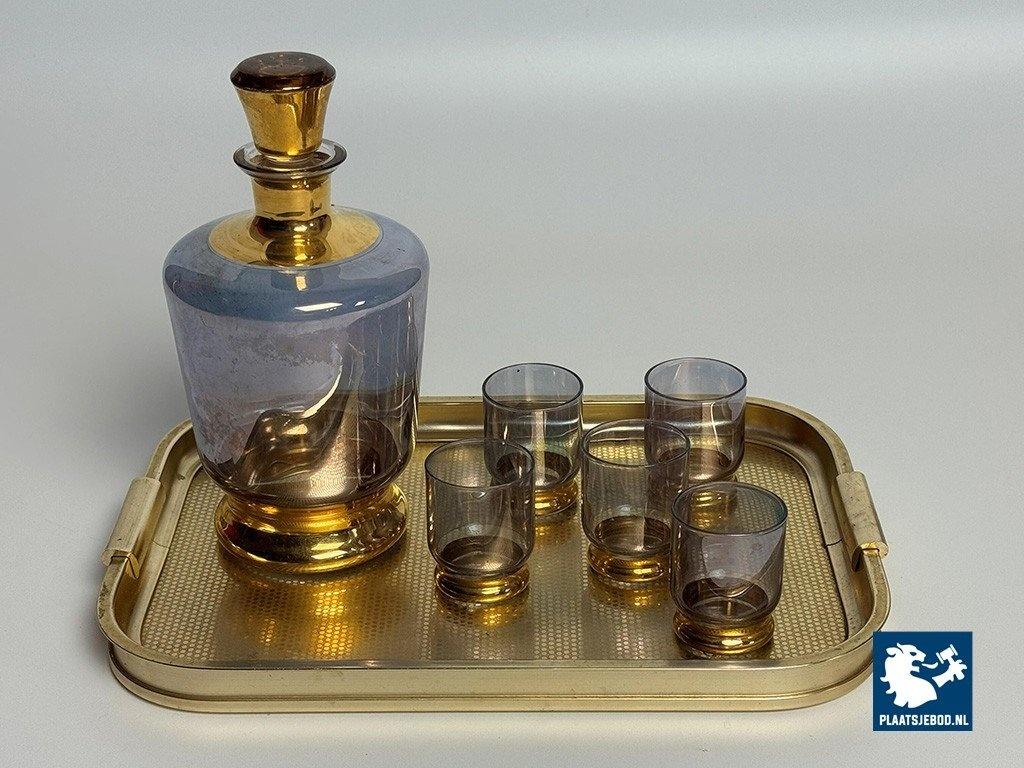 Enchanting vintage liqueur service consisting of a violet iridescent glass carafe and five matching glasses, richly decorated with gold accents. The set is presented on its original brass serving tray, enhancing its refined and luxurious appearance. Attributed to Booms Glass, Belgium, known for elegant decorative glassware. A highly decorative and complete ensemble, ideal as a display or serving piece.