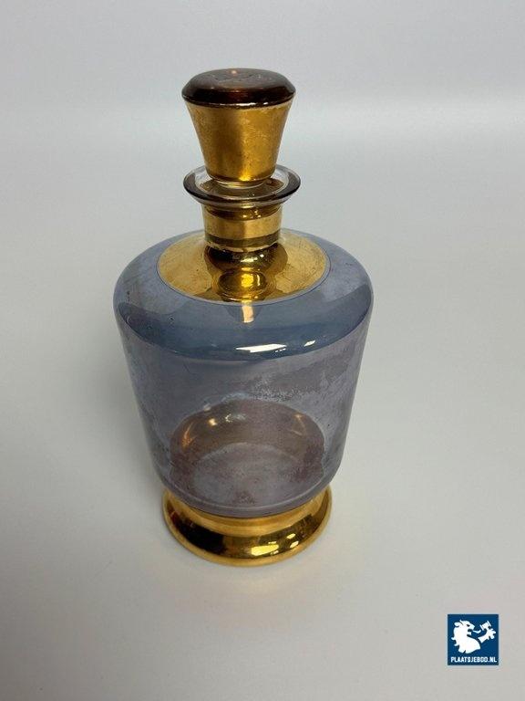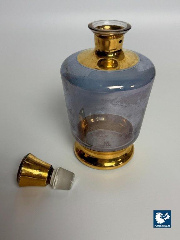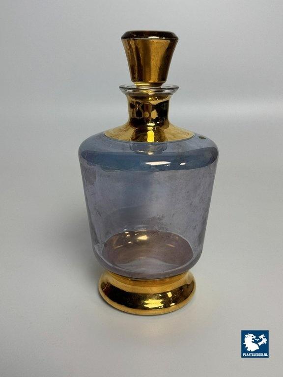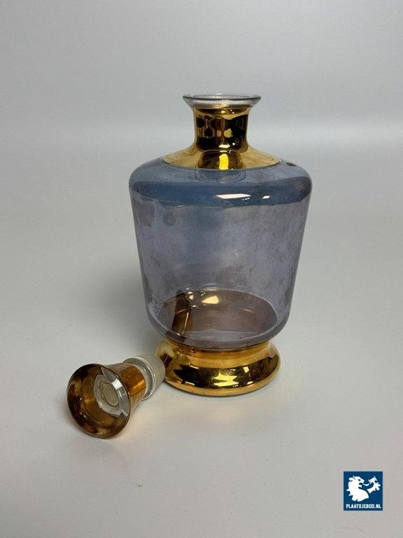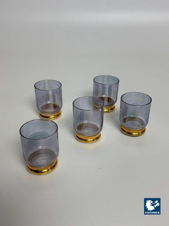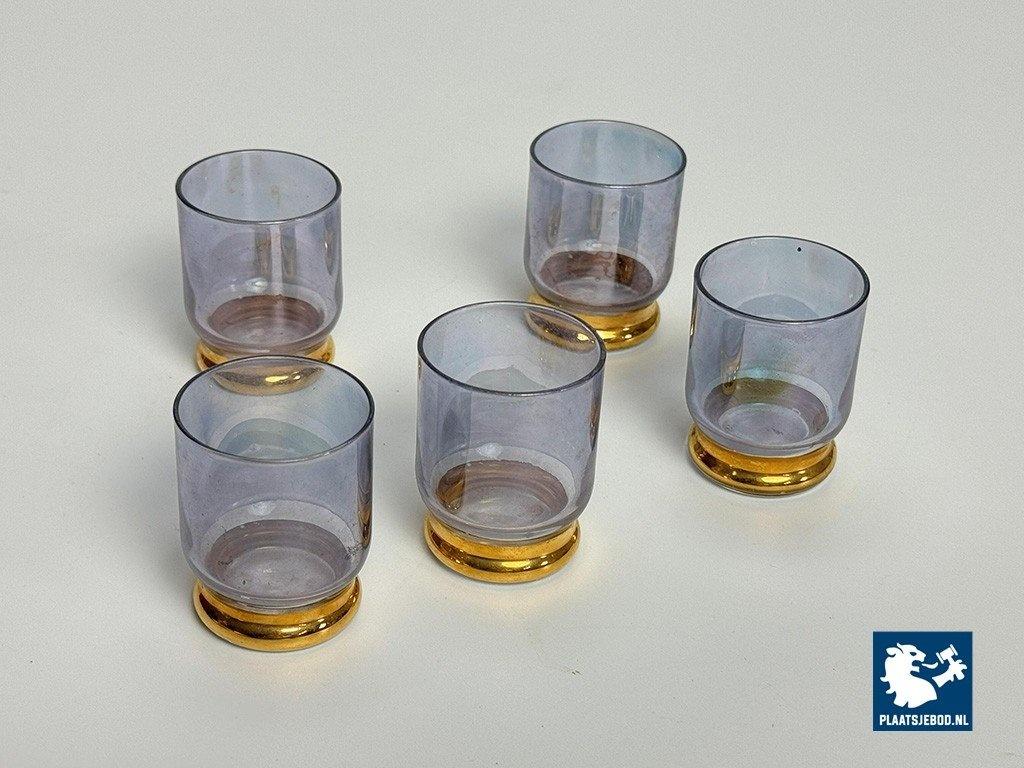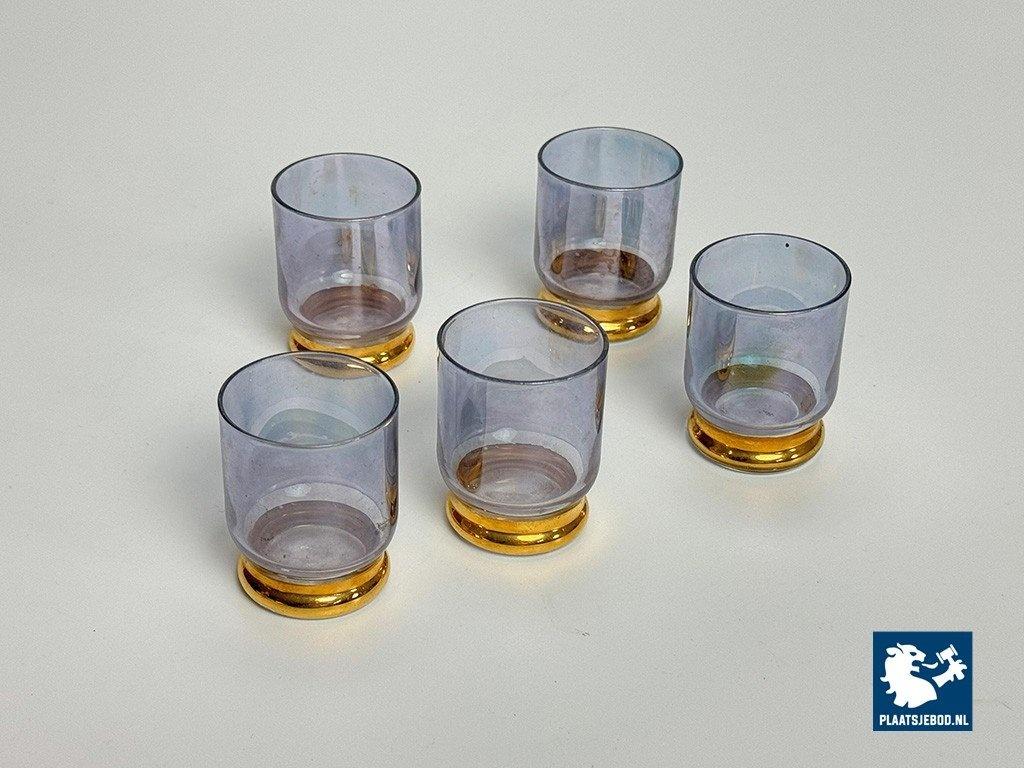 Lot 305-070-DA-013-S1: Vintage Design Violet Glass Liqueur Set with Gold Accents, Attributed to Booms Glass, Belgium, 1950s–1960s. Golden Tray included.