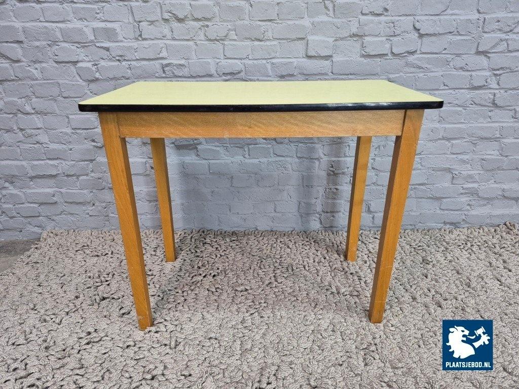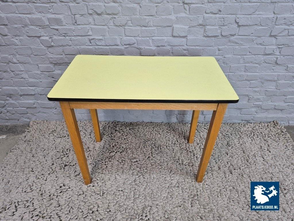Rectangular vintage kitchen table with a solid beechwood frame and straight wooden legs, topped with a fresh lemon-yellow Formica tabletop finished with a black rim. A simple and practical mid-century kitchen table with a cheerful custard-yellow tone that brings light and colour to a kitchen or breakfast area. Honest, straightforward design typical of everyday Dutch post-war interiors. As with all vintage items, light signs of use may be present and contribute to its authentic character. Dimensions: Height 74 Width 90 Depth 50 cm.