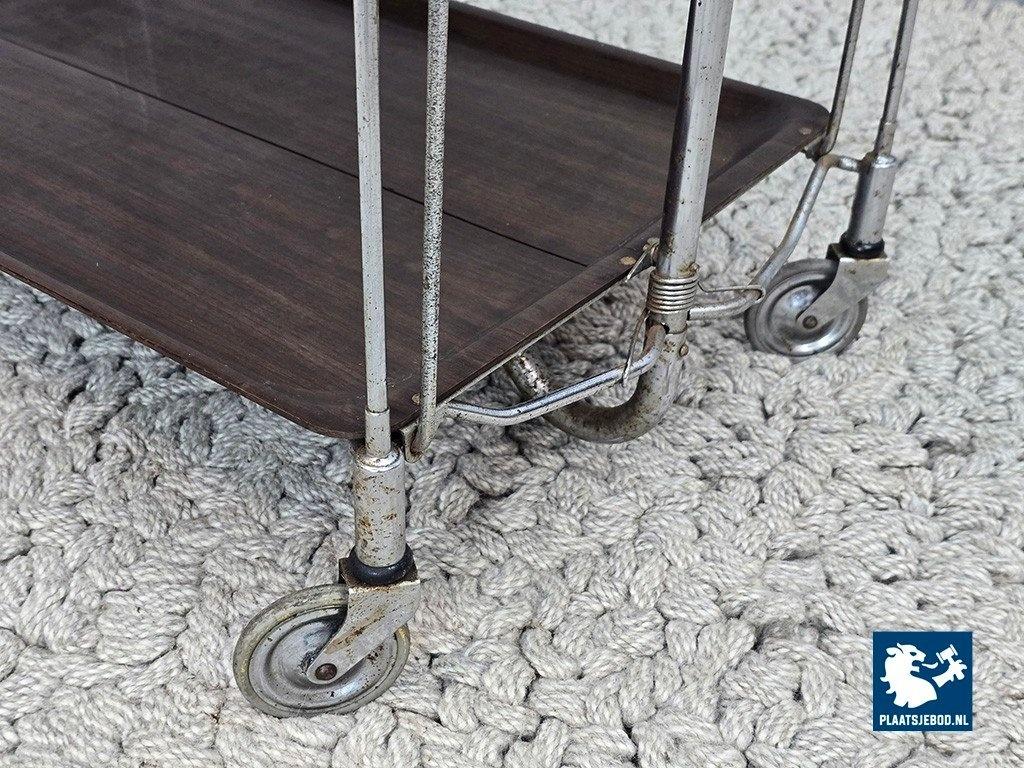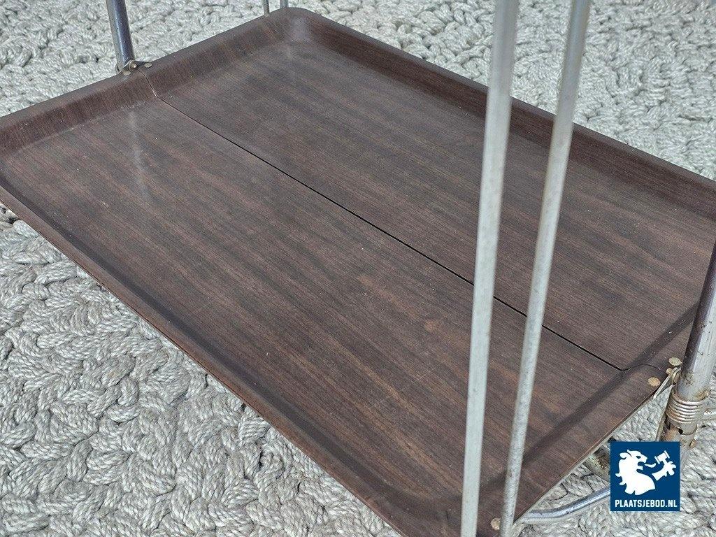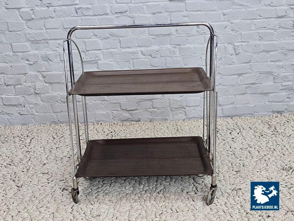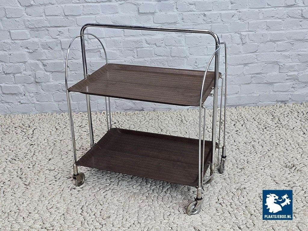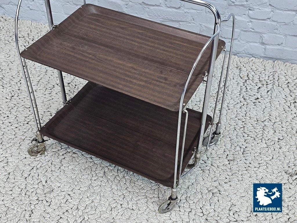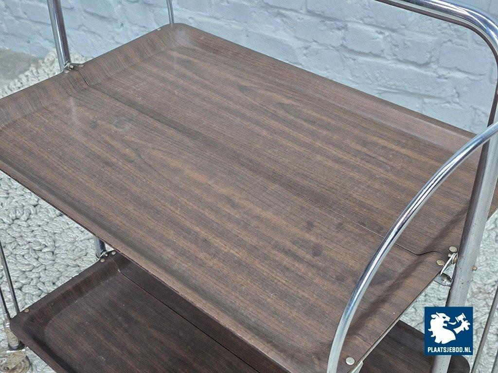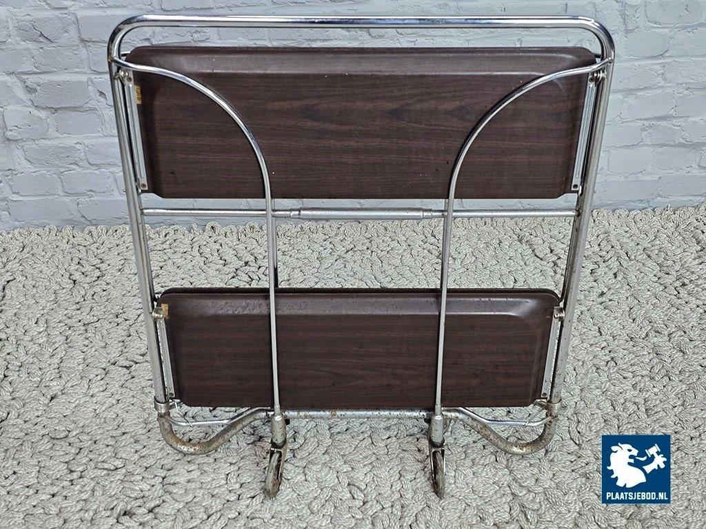 Lot 305-055-TT719-1-A: Vintage Foldable and Mobile Chrome Steel 2 Faux Wood Layers ‘Dinett’ Serving Trolley by Bremshey Gerlinol, Germany, 1970s.