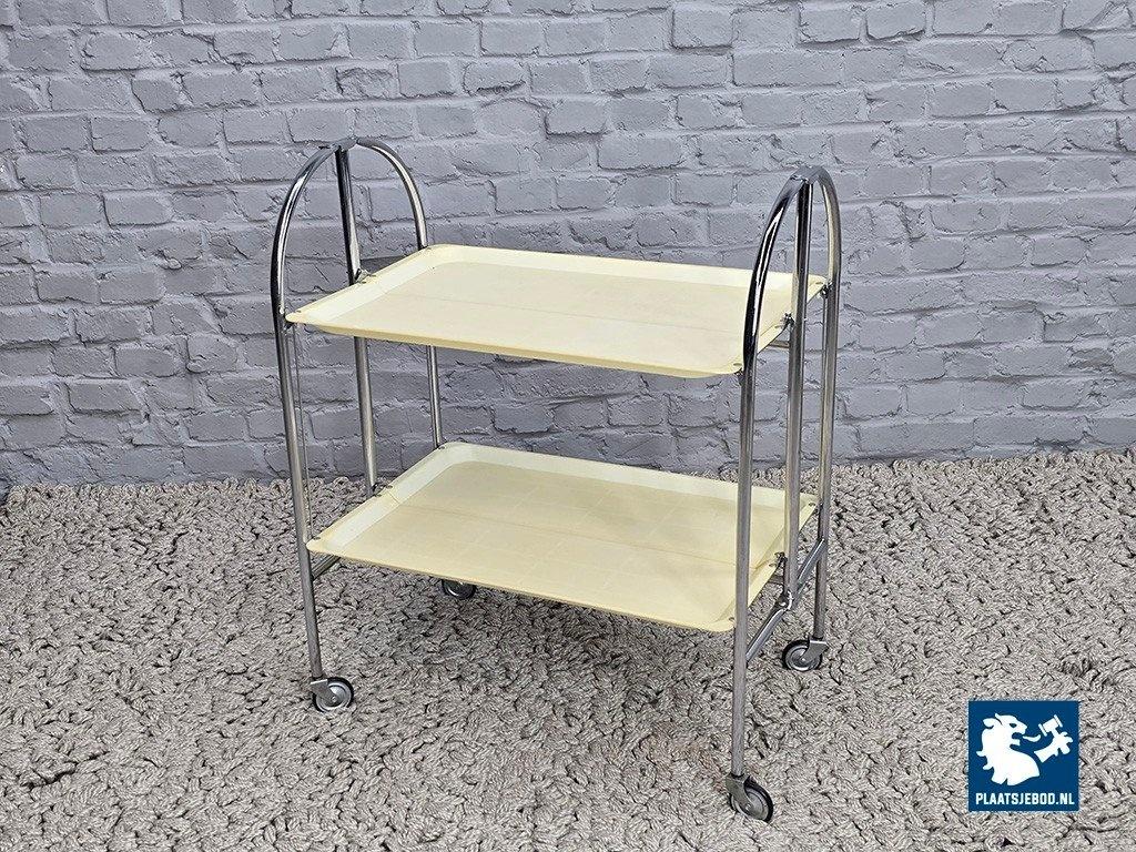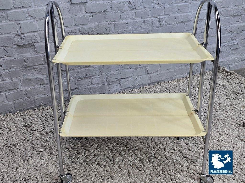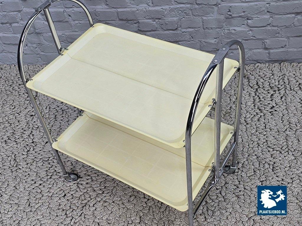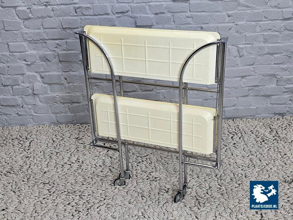 Vintage Foldable and Mobile Chrome Steel Serving Trolley with 2 White Plastic Layers. Germany, 1970s. More affordable variant of the classic ‘Dinett’ trolley, featuring white synthetic trays instead of faux wood. The practical foldable chrome-plated steel frame and swivel castors provide the same functionality as the higher-end versions. In good vintage condition, with wear consistent with age and use. Fully functional folding mechanism and wheels. Dimensions: Height 79 Width 68 Depth 42 cm.