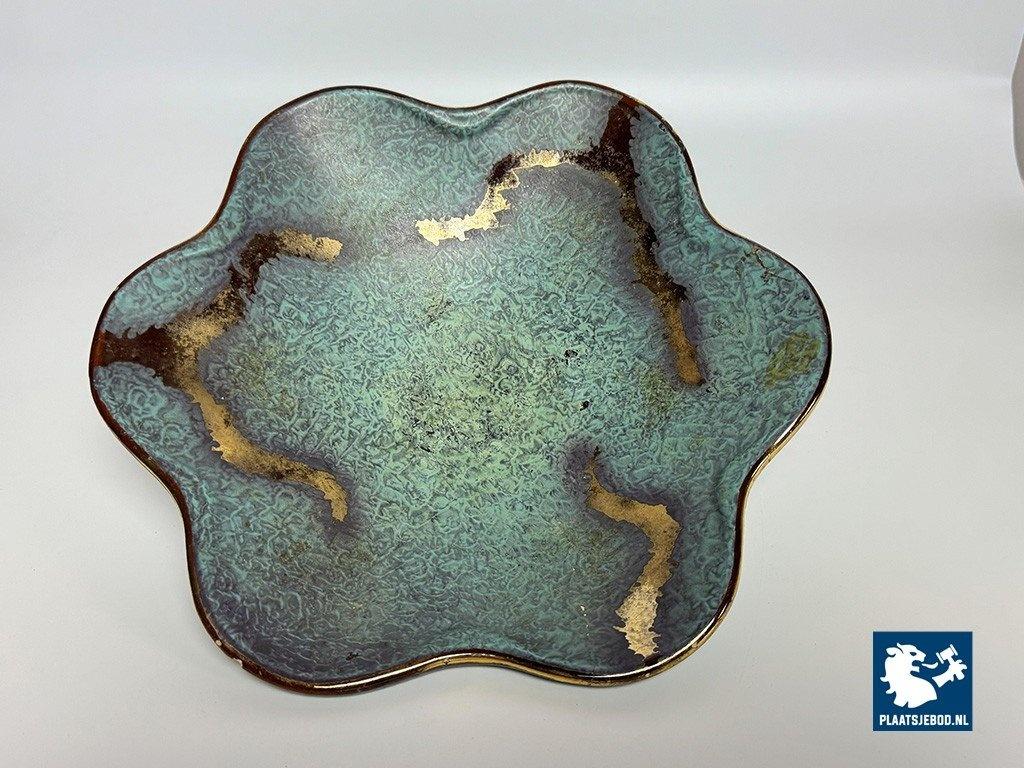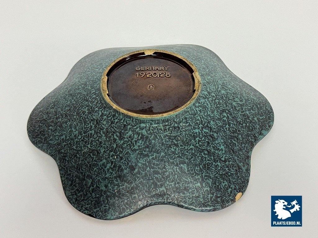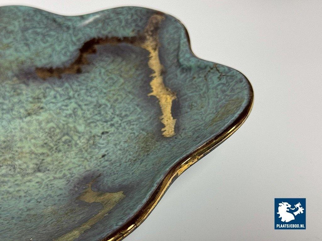 Lot 305-029-DO-034-S1: Vintage German Matte Finish Turqoise Enamel Bowl with Gold Leaf Detailing and Wavy Rim. Germany 1920s.