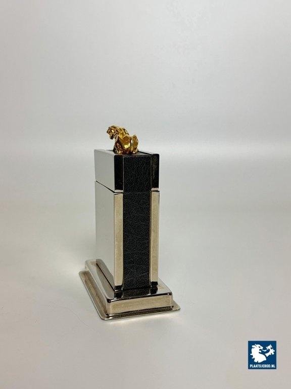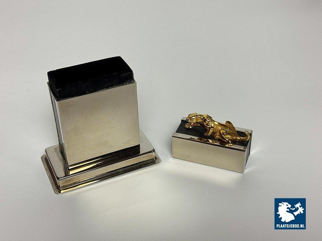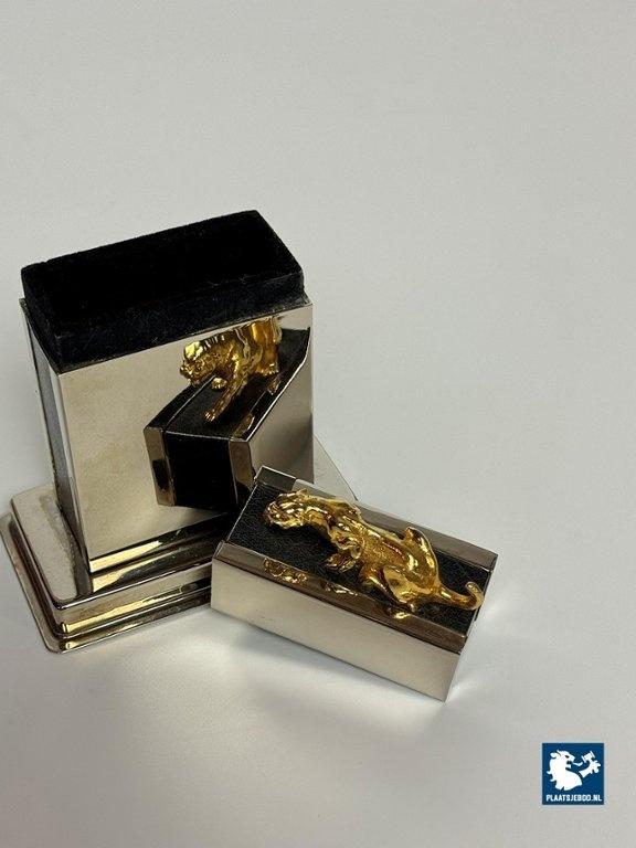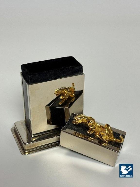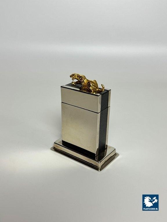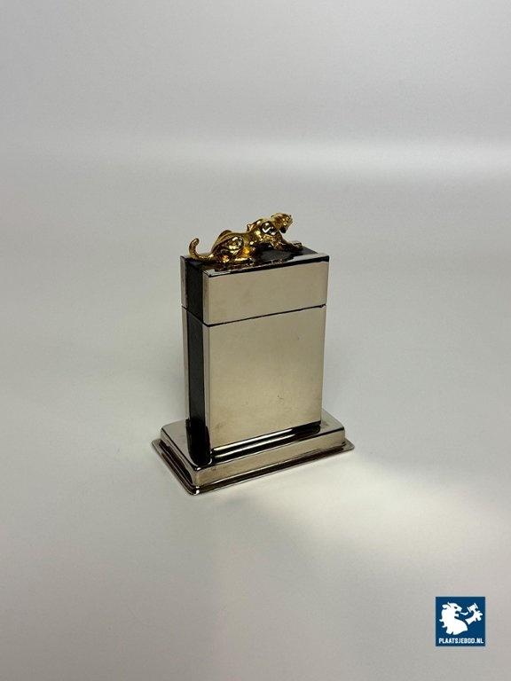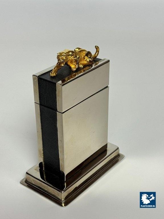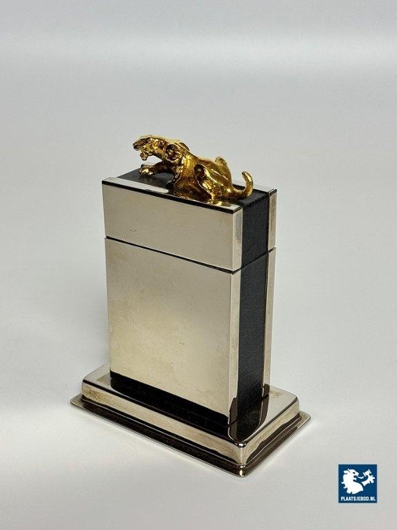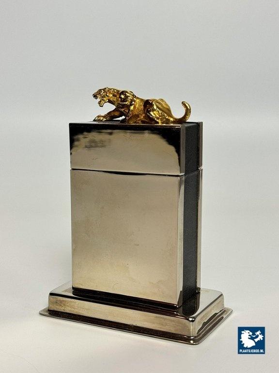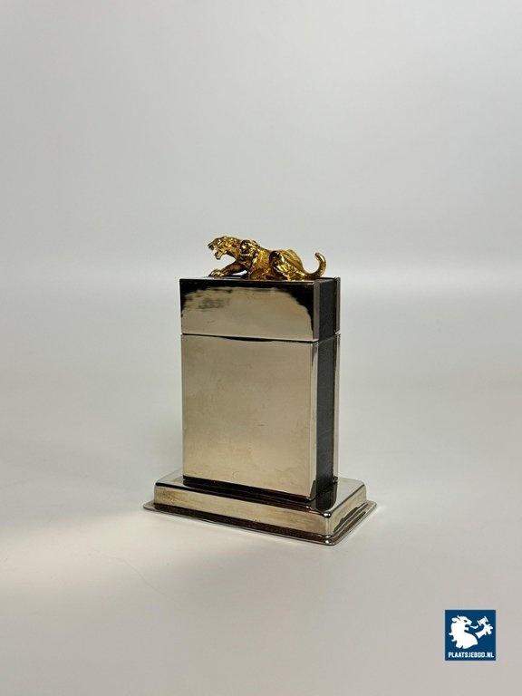 Vintage Silvered Cigarette Case with Panther Ornament, 1960s. A very decorative silver-plated case, standing on a small pedestal and adorned with a detailed panther figure in brass. Lined with velvet, it combines elegance and refined 1960s design. Dimensions: Height 13 Width 11 Depth 6 cm.