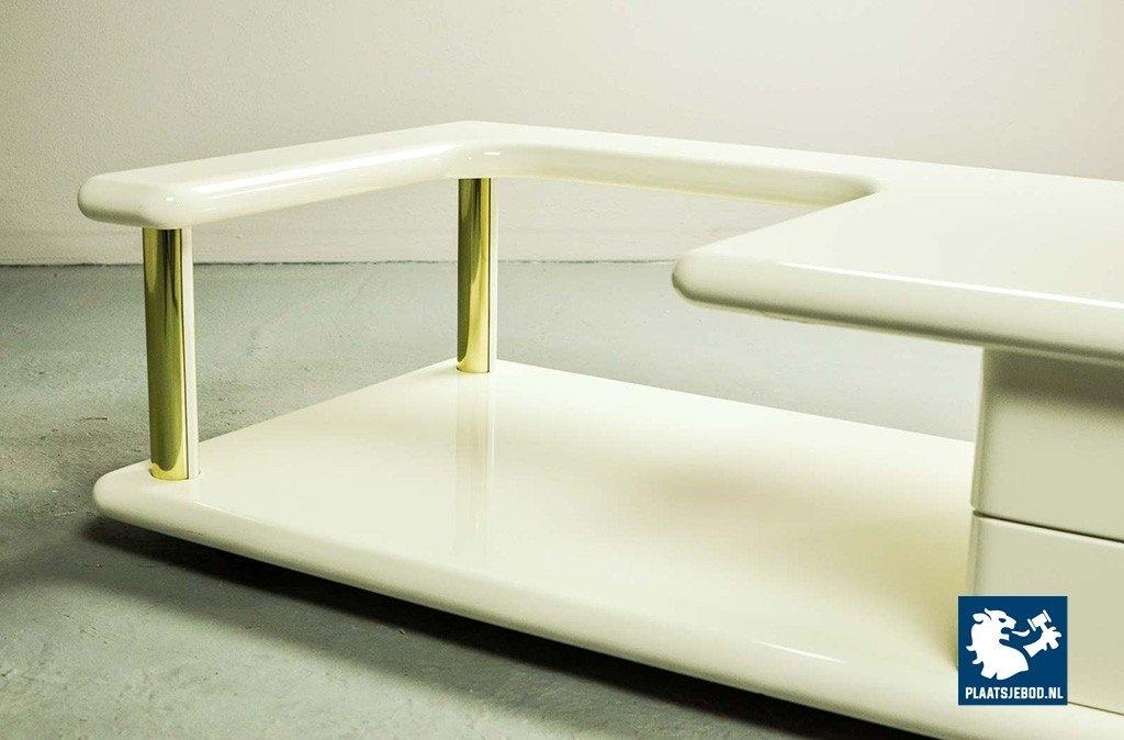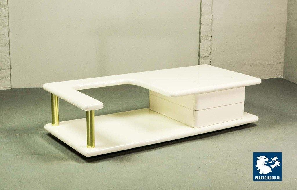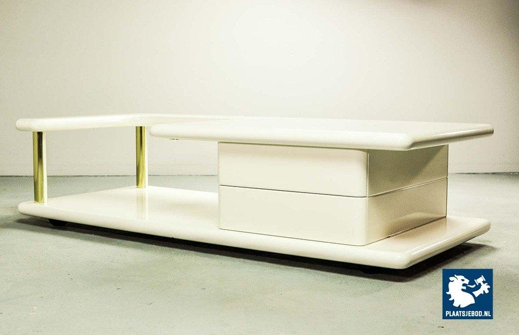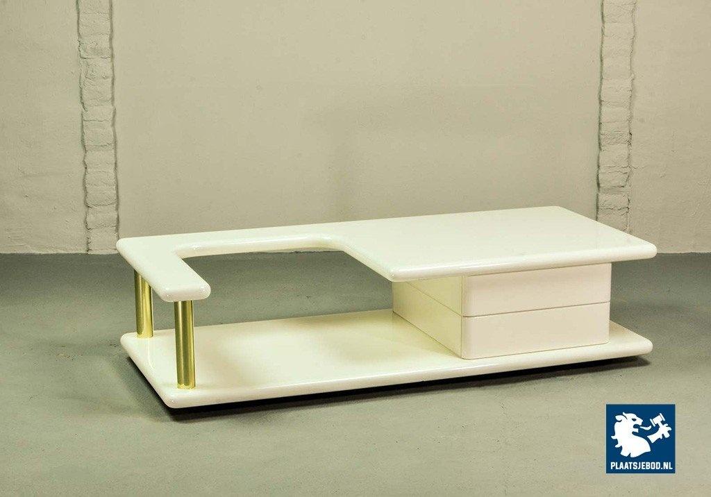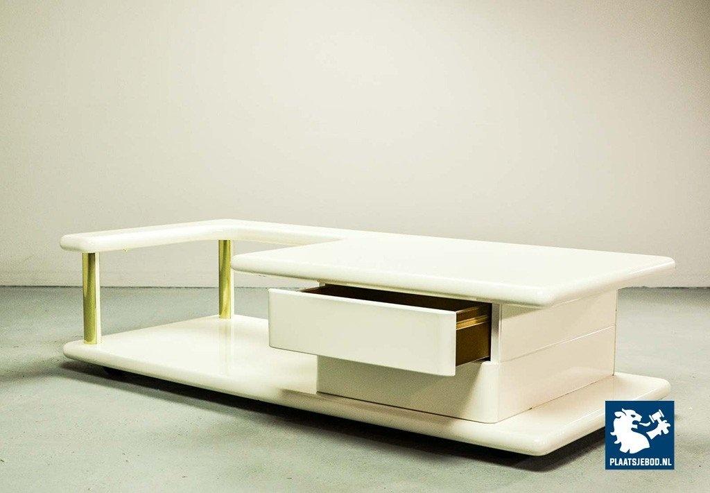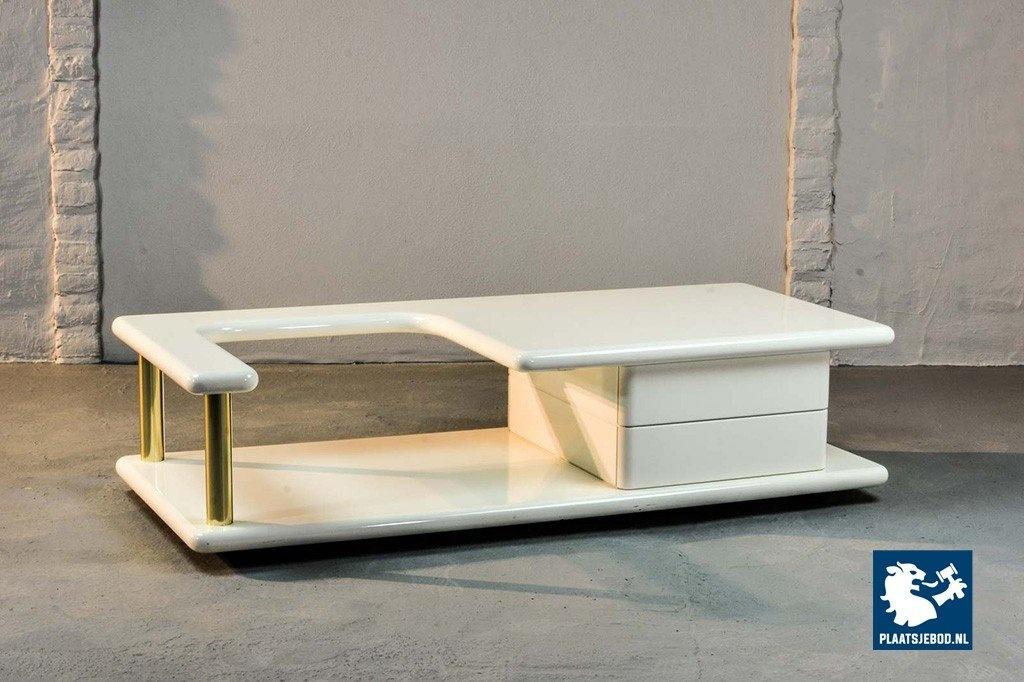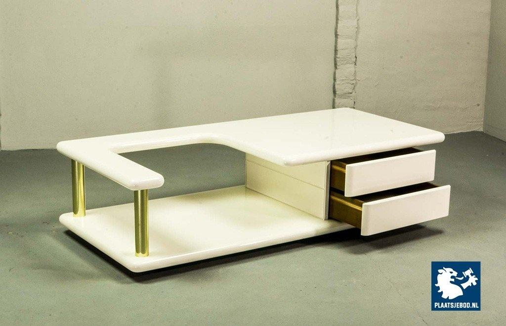 Exclusive high quality Italian design white high gloss lacquered coffee table with brass elements, manufactured in the 70s. The table features two hidden drawers which are integrated in the design in a very elegant and subtle way. Another striking detail is the free-form shaped tabletop that enables the user to expose a stunning piece of art or a beautiful flower decoration. This exclusive coffee table is in a very well preserved condition and fits perfectly in a Hollywood Regency oriented interior or entrance hall. Dimensions: H 33 cm, W 133 cm, D 60 cm. Quantity: 1