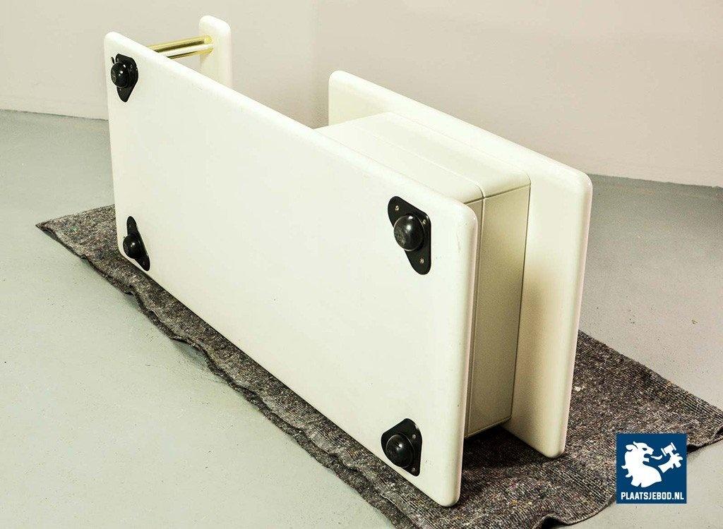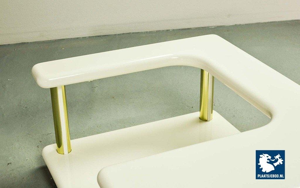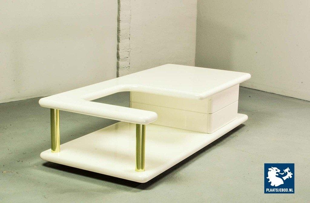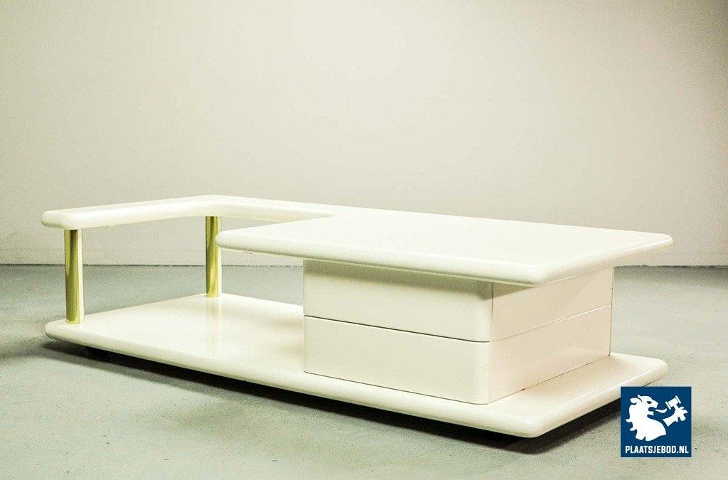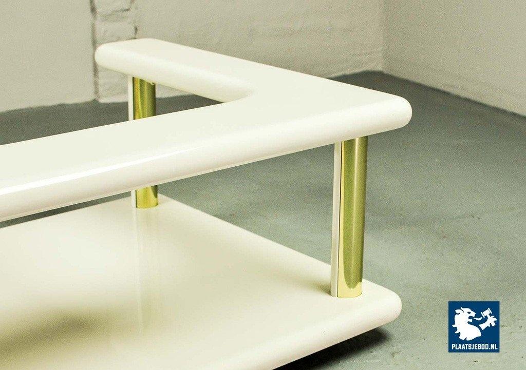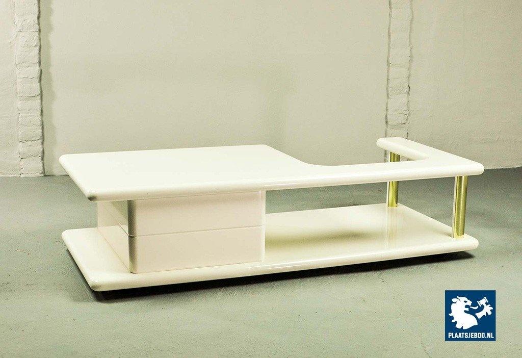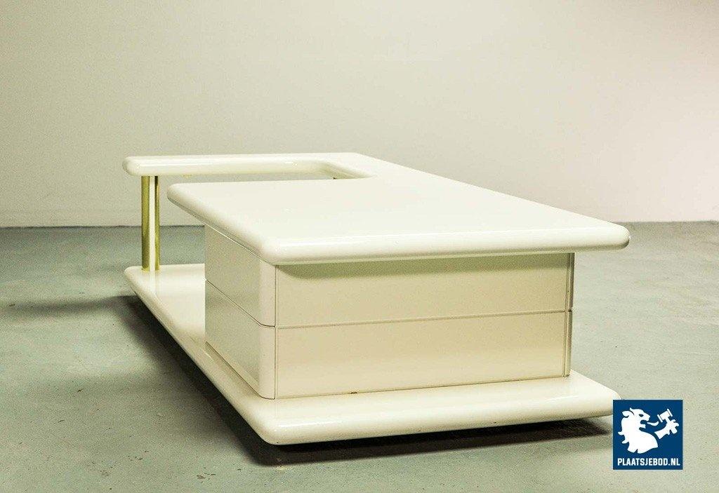 Exclusive high quality Italian design white high gloss lacquered coffee table with brass elements, manufactured in the 70s. The table features two hidden drawers which are integrated in the design in a very elegant and subtle way. Another striking detail is the free-form shaped tabletop that enables the user to expose a stunning piece of art or a beautiful flower decoration. This exclusive coffee table is in a very well preserved condition and fits perfectly in a Hollywood Regency oriented interior or entrance hall. Dimensions: H 33 cm, W 133 cm, D 60 cm. Quantity: 1