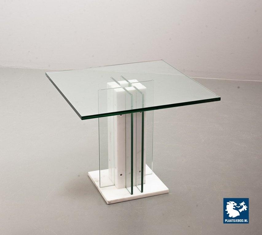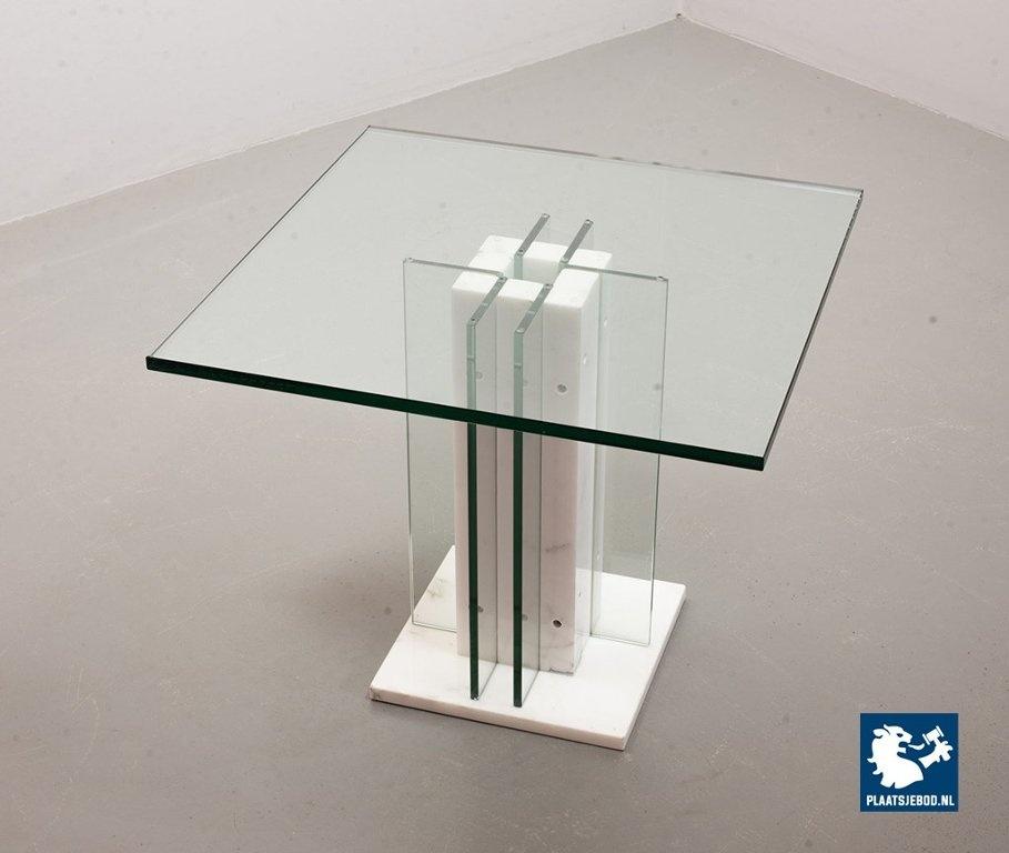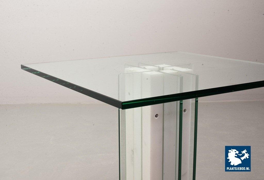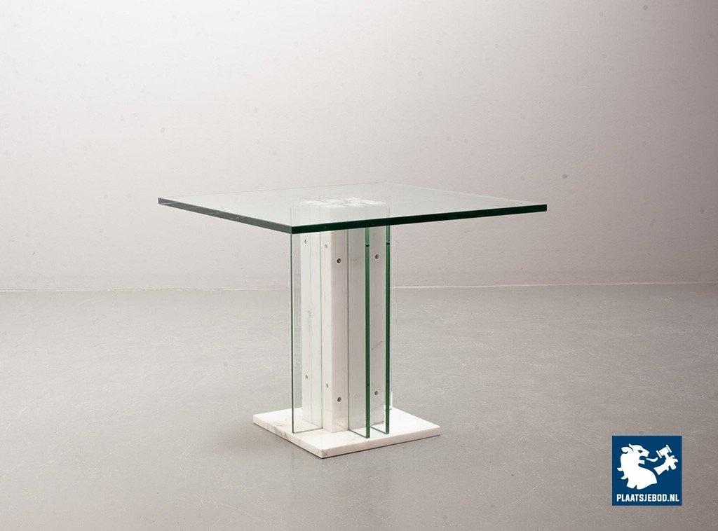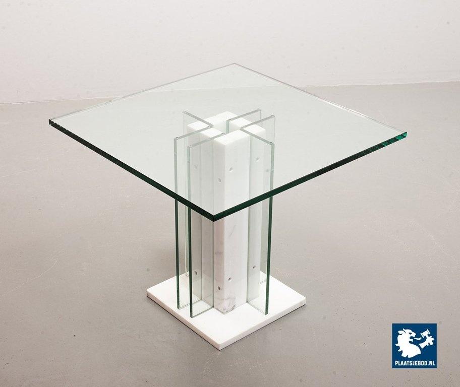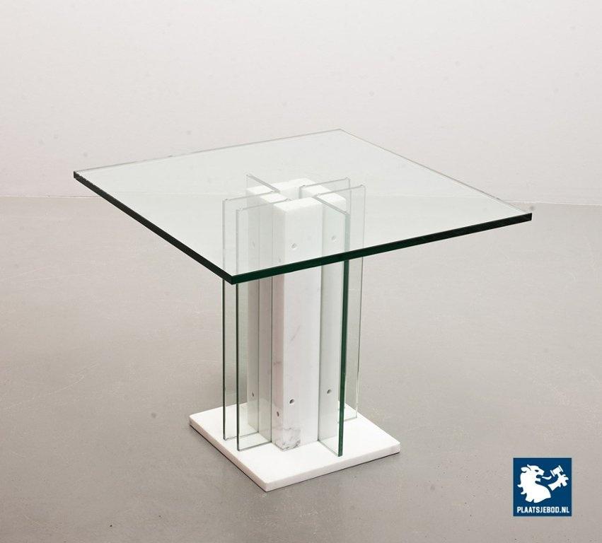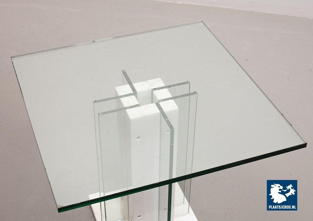 Italian Square Side Table on white marble and glass pedestal with thick glass top. This pedestal / side table features a lighting option within the pedestal in a way that the edges of the vertical glass parts of the pedestal are illuminated. This lighting option gives a special effect to the side table. The side table is in good condition with some non disturbing but visible wear on the edges of some glass parts. Wear is consistent its age and use. Dimensions: Height: 41 cm, Width: 60 cm, Depth: 60 cm, Quantity: 1